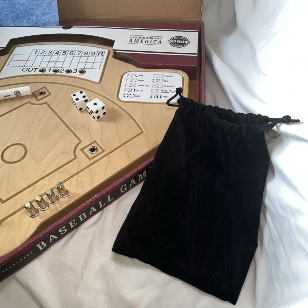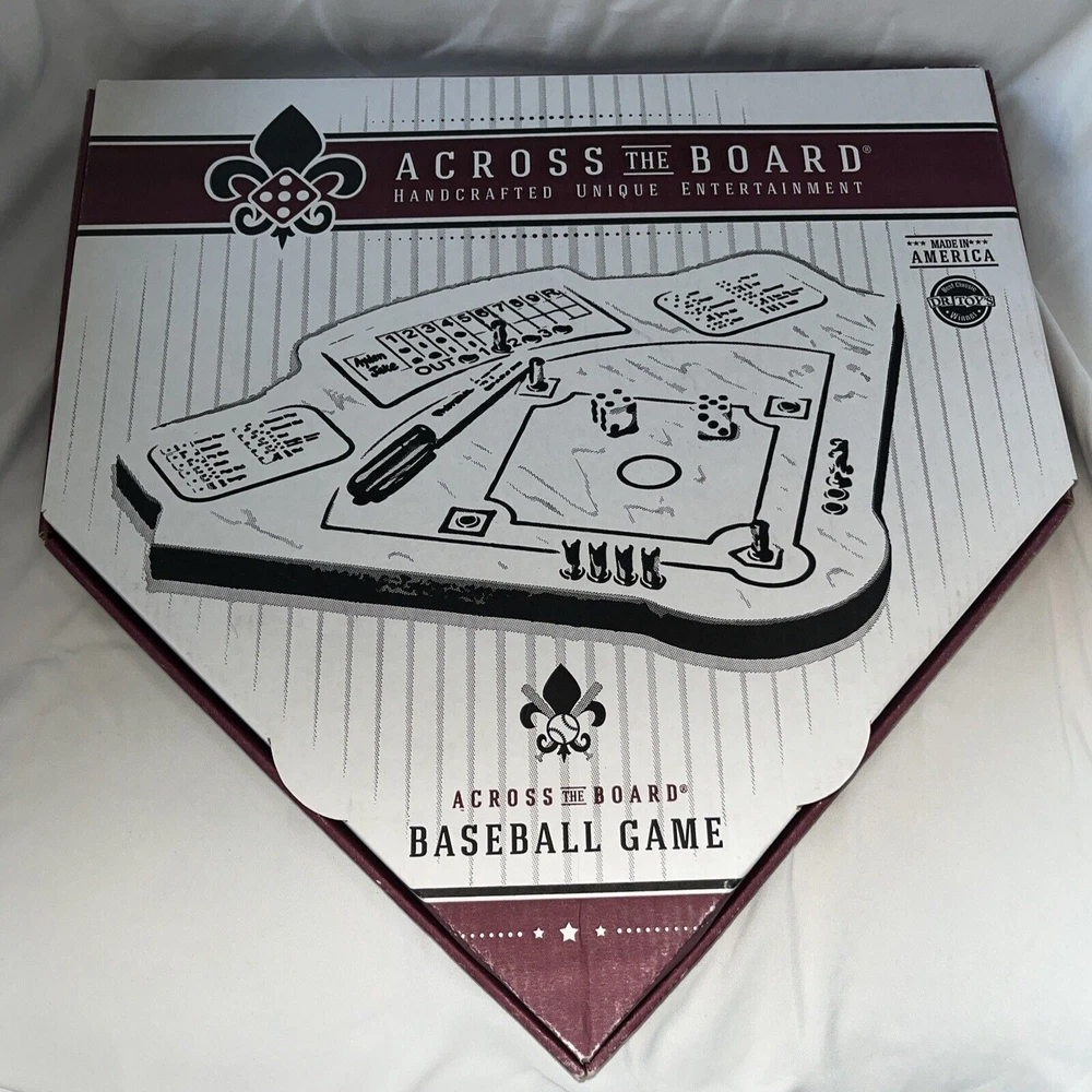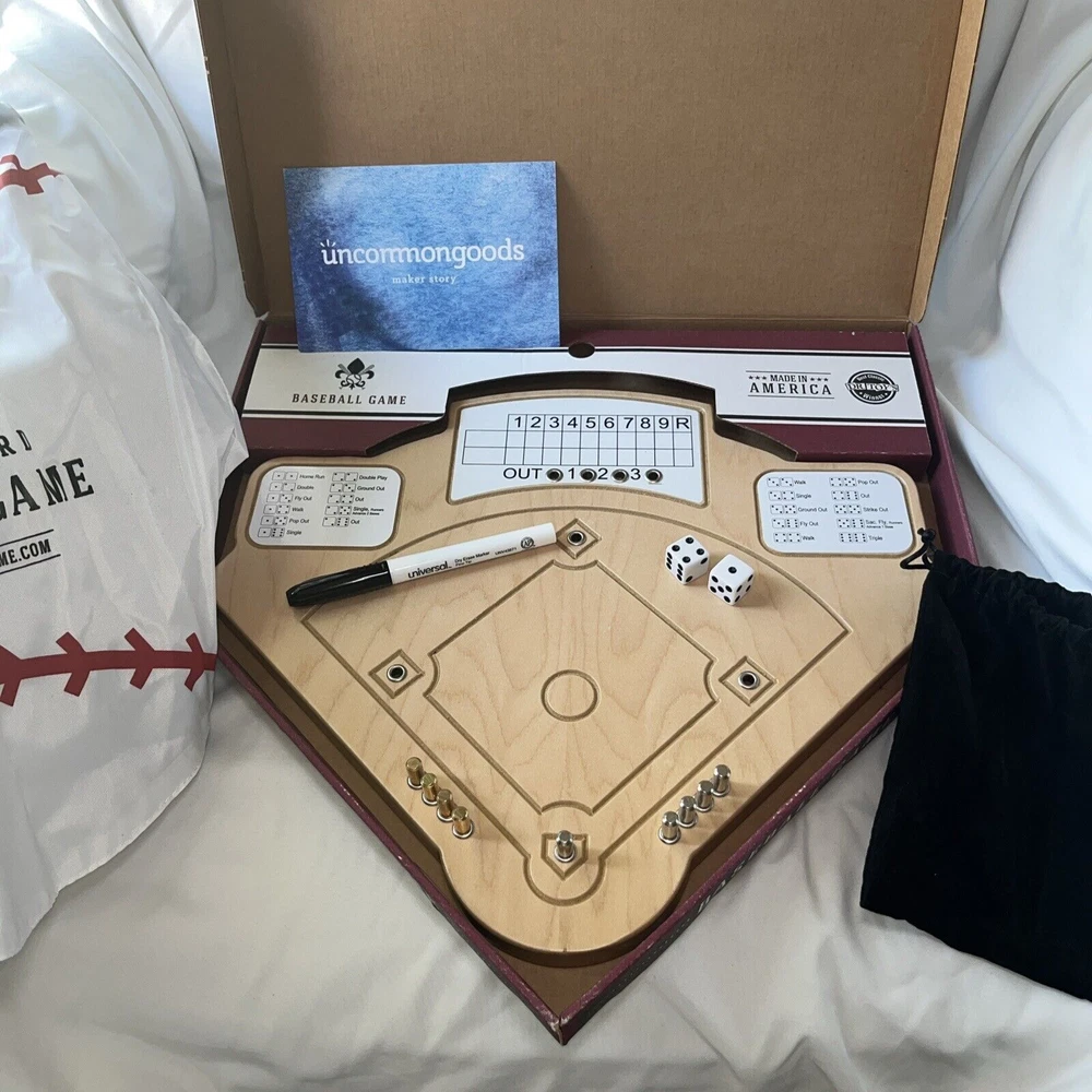 This handcrafted wooden board game sold by Uncommon Goods is a timeless heirloom that will provide hours of entertainment for 2 or more players. The game is themed around baseball and features Across the Board brand components. It was awarded the Best Classic Dr. Toys Winner in 2007 and is suitable for players aged 8 and up. The game board is made in the United States and is perfect for boys, girls, and anyone who loves a good game of strategy and skill. Excellent, preowned condition. Complete game.
