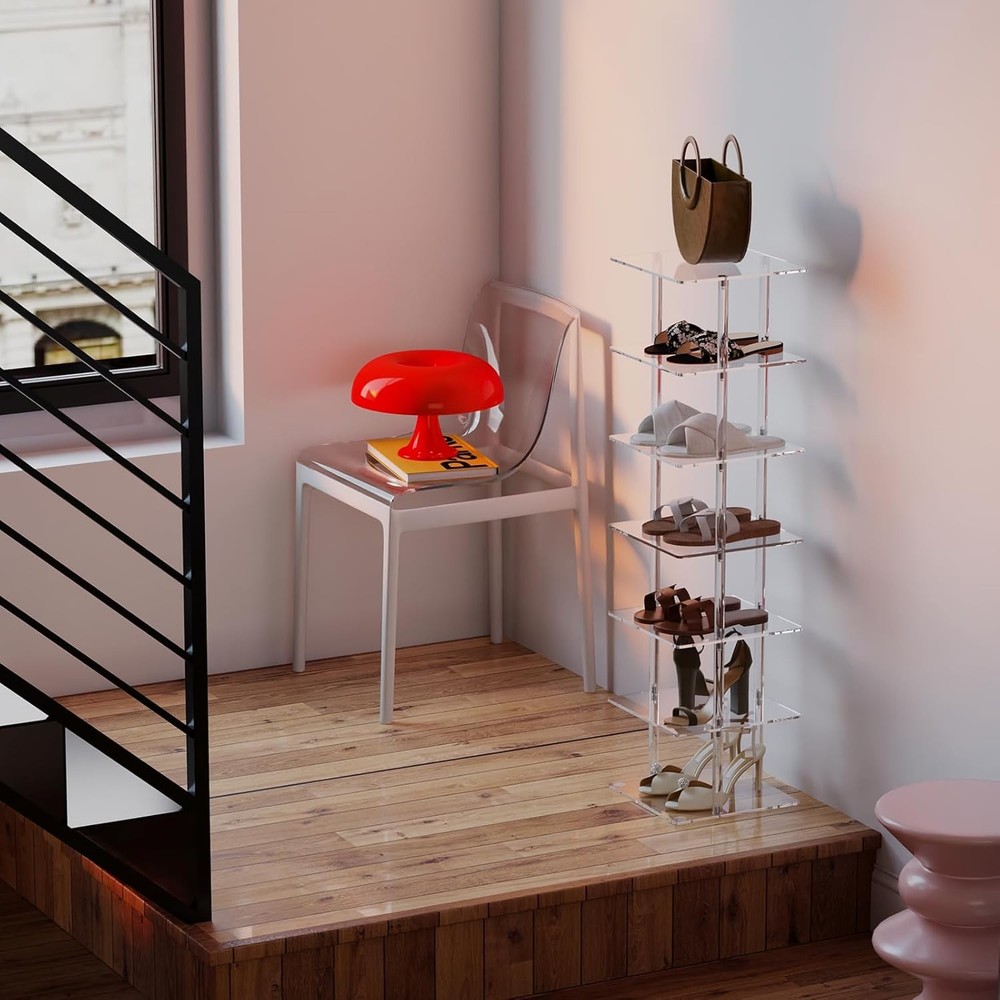 This acrylic shoe rack is a game-changer for small spaces! The sleek, ultra-clear design looks modern while keeping shoes neatly organized. I love how sturdy yet lightweight it is—no wobbling even when fully loaded. The seven tiers fit all my frequently worn shoes perfectly and the vertical design saves so much floor space. It's surprisingly durable for acrylic and wipes clean easily. Perfect for making a cluttered entryway look instantly tidy!
