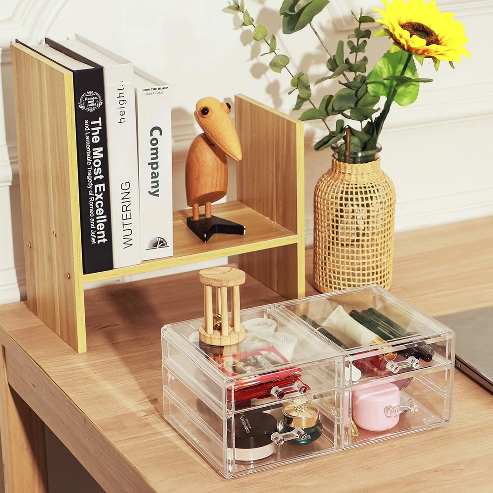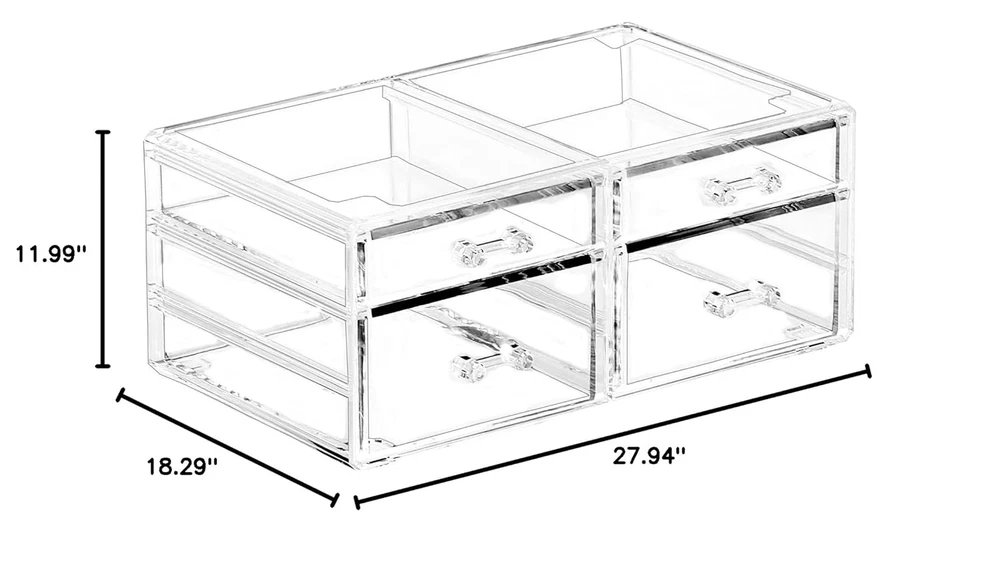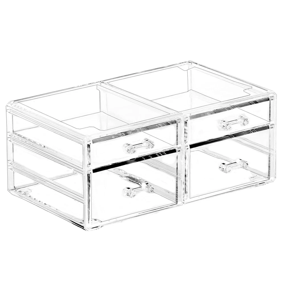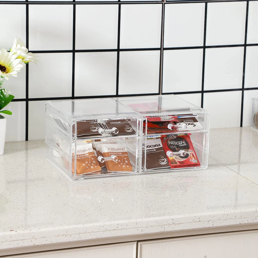 【Cute Stacking countertop drawer】- Size:6.7*11*4.7inches.The cabinet organizers storage has 1 independent drawer organizers, totaling 4 drawers 【Multifunctional cabinet organization】 - Design of drawers of different sizes makes it a perfect organization and storage under sink for storing lotion,skin care,essence, facial cleanser, lipsticks, makeup palettes, eye shadows, concealers, and other skin care products, cosmetics,toiletries makeup,lipstick,toolbox,office supply,craft,stationery,and hair clip accessory desk cabinet organizer 【Stackable Drawers Design-under 】sink storage bins can stack each other,You can use each drawer separately or match it with Our other drawers from our brand,the kawaii storage compact and simple design, does not deform, and is shiny. It is very suitable to be placed on the dormitory,bedroom,Vanity Countertop,dressing table,office desktop,Bathroom Counter tabletop drawers 【This bathroom storage box is Perfect Gift】 - Perfect choice as a pads and tampons organizer gift to women,Girl,girlfriend, daughter, wife, mom, and friends. College dorm room essentials for girls.Ideal gift for valentine's day, mother’s day, thanksgiving day, christmas, birthday and wedding. 【Stylish and Durable bathroom container】: Crafted from premium materials, our organizer cabinet combines durability with a sleek, modern look that complements any décor, whether modern minimalist, Nordic, or vintage. This organizer is also a must-have for beauty bloggers, makeup artists, and college students.Very suitable as: acrylic drawers organizer, mini organizer with drawers, purple makeup organizer, acrylic makeup drawers