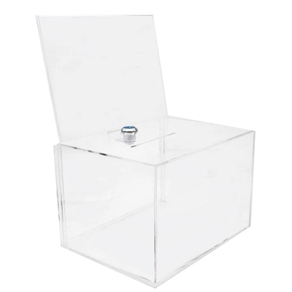 Acrylic Donation Box - Box for Voting, Charity, Polls, Surveys, Sweepstakes8439 Material: Made of clear high quality acrylic Size: The transparent ballot box is 6.3inch x 4.6inch x 3.9inch(L*W*H) Safe Storage: is equipped with a sturdy lock and two keys to keep the contents inside safe and secure. Our clear donation box has 4 brackets on the bottom to fit any desktop tablet. Great Display: Visual Sign Stands easy to switch between graphic or informational sections on a regular basis Colour:transparent Material:acrylic Size:12 x 15.9 x 10.2cm Package Contents: 1 x Donation Box