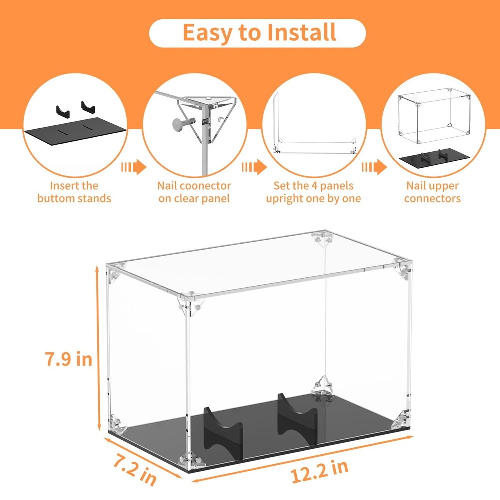 Not:Assembly is required.Instruction is come with the package. It is a good quality acrylic football display cover with a black plastic base. There was a small inserted pedestal in the bottom of the case to “cup” the bottom of the football, to prevent it from rolling around in the case and to keep the football in the correct position for display. Very optically clear with no distortion and the glass is UV protective in case your footballs are displayed near a window. Displays a football and keeps of clean from dust. Keeps the football protected from UVs It is light and easy to use to display a football. This was a perfect fit for my autographed full size football. It will do the trick of keeping the dust and finger prints off the balls when sharing with friends and other fans. It was easly to pull apart and put back together. Nice tight fit. Assembly Required-- You have better watch the video before assembly.It will make you assembly go quickly and easily. Clear To Display -- Made of acrylic,create a clear display visual to viewer.The the signatures on the football could stand out due to the bottom of the case being black.Great display case to show off your collection. Well Protection For Football-- The cube case is sturdy and the football fit built-in cradle perfectly.It keep football safe and sound inside.Also it well protect dust and fingerprint from kids. Fit All Size -- The interior size is 12×7.2×8 inch(L×W×H).football box is big plus to fit for all size of football,including Seniors footballs,basic football,standard football,college football. Nice Gift -- The football case can be nice birthday or festival present to your kids to protect and display their autographed football.