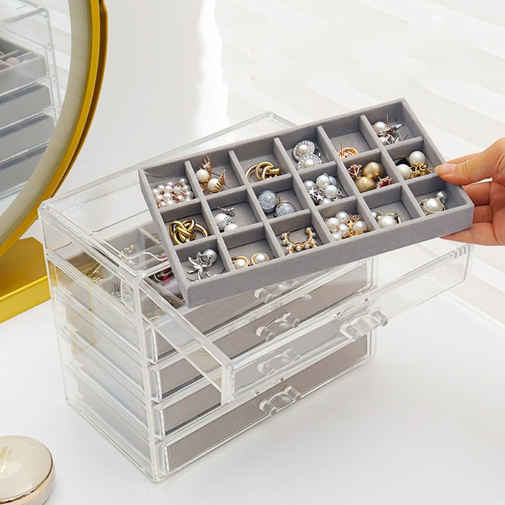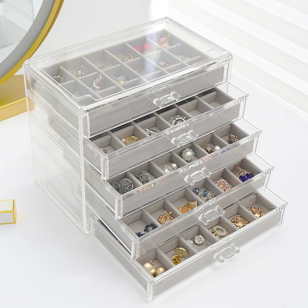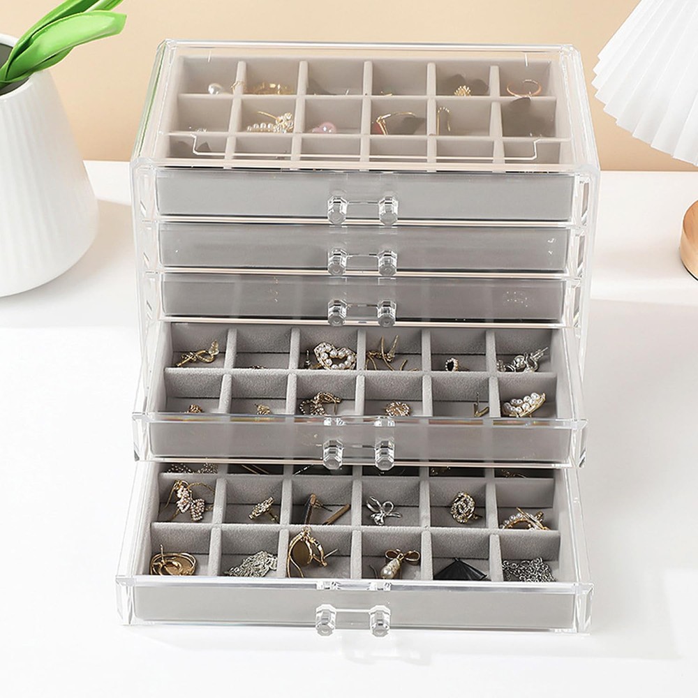 Large Capacity: Jewelry box size 23.5 x 13.6 x 17 cm, 5 drawers of the same design with 90 compartments See Through Design: With the transparent shell, you can easily view and access for matching pair earrings Customize Velvet Tray: You can flexibly adjust the dividers of the tray to store jewelry of various sizes Smooth Track: Smooth slide rail, convenient for pulling and replacing drawer positions Awesome Gift: Gorgeous clear jewelry box organizer is a ideal gift for earring lover or collector