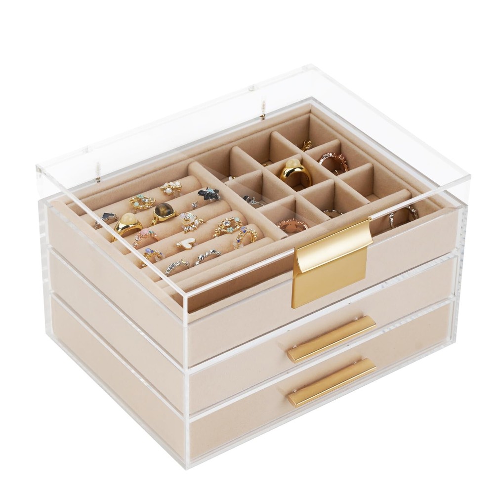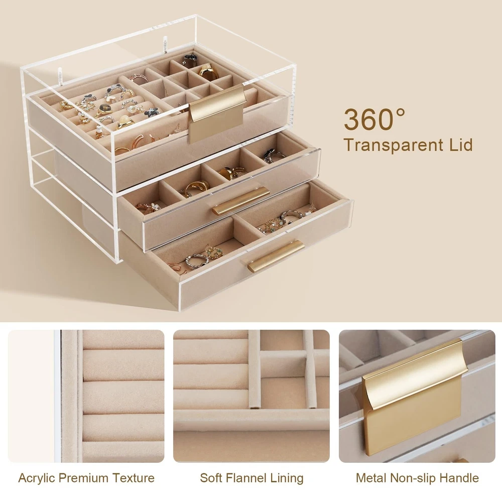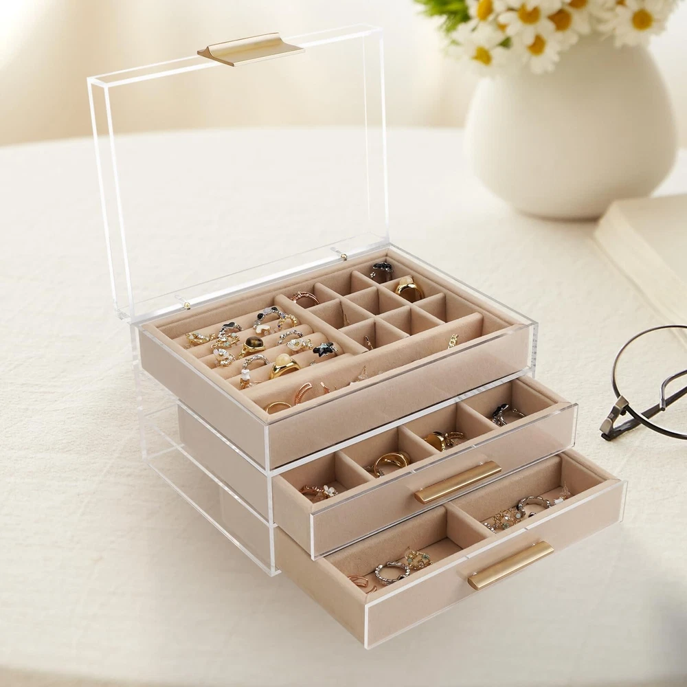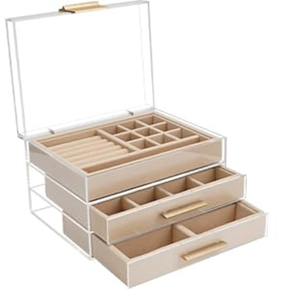 Acrylic Jewelry Box, Three-Layer Jewelry Organizer with 360° Transparent Lid, Suitable for Earrings, Rings, Bracelets, Necklaces, Stud Earrings, Bracelets, Watches (Transparent) - Buy Now with Fast Shipping! Acrylic Jewelry Box, Three-Layer Jewelry Organizer with 360° Transparent Lid, Suitable for Earrings, Rings, Bracelets, Necklaces, Stud Earrings, Bracelets, Watches (Transparent) Product Details Color: Transparent Brand: ESSDIAR Material: Acrylic Style: Acrylic Special Feature: Waterproof, Adjustable, Scratch Resistant Recommended Uses For Product: Necklace, Bracelet, Ring, Watch, Earring, Bangle Product Dimensions: 6.3"D x 8.5"W x 5"H Target Audience: Women Shape: Cuboidal Finish Type: Polished Color: Transparent Brand: ESSDIAR Material: Acrylic Style: Acrylic Special Feature: Waterproof, Adjustable, Scratch Resistant Recommended Uses For Product: Necklace, Bracelet, Ring, Watch, Earring, Bangle Product Dimensions: 6.3"D x 8.5"W x 5"H Target Audience: Women Shape: Cuboidal Finish Type: Polished Inner Material: Flannel Number of Drawers: 2 Number of Compartments: 12 Jewelry Storage Type: Jewelry Box Manufacturer: ESSDIAR Occasion: Valentine's Day Mounting Type: Table Top Item Weight: 3.83 pounds Finish: Polished Special Features: Waterproof, Adjustable, Scratch Resistant Batteries Required?: No Date First Available: July 5, 2024 Key Features ✅ [3-Tier Jewelry Organizer] This clear acrylic jewelry box offers triple-layer storage (flip-top + 2 drawers) to effortlessly organize earrings, bracelets, necklaces, and watches. The ingenious design ensures instant visibility, while the earring organizer slots and dedicated ring holders maximize space efficiency. ✅ [Flexible DIY Storage] Customize every inch with removable dividers! Build compartments for chunky bracelets, delicate chains, or bulky watches. This jewelry organizer for women adapts to growing collections, letting you redesign layouts as trends evolve. ✅ [Cozy & Crystal Clear] Anti-yellowing acrylic maintains pristine clarity, combined with breathable flannel-lined interiors that gently cradle your everyday jewelry a laid-back organizer blending casual charm with reliable protection. ✅ [Perfect Gift Option]: Delight your loved ones with this elegant jewelry box for birthdays or anniversaries. It's not just a jewelry organizer; it's a luxurious gift that adds a touch of sophistication to any dressing table. ✅ [Versatile Use]: Designed for use in bedrooms, vanities, or bathroom counters, this clear jewelry organizer is perfect for storing earrings, rings, bracelets, necklaces, and watches, making it a versatile addition to your accessory collection. Product Description