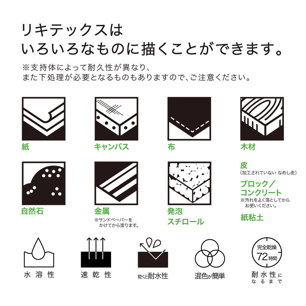 The "Rikitex Basics" has a large capacity and reasonable price. Affordable and economical acrylic paint recommended for beginners. Works with all Likitex Colors and Likitex Medium. A large capacity of 4.6 fl oz (118 ml) and a uniform price for each color. Large capacity, so it is recommended for large projects and live painting. Easy to use one-touch cap type. Prevents lost or forgetting to close the cap Acrylic paints are water-soluble paints that are easy to handle with water. Once dry, it is water resistant and will not dissolve in water and will not bleed through the color of the underneath, giving you a beautiful finish. Acrylic paint dries fast and allows for smooth creation Dries to a flexible coating film that won't crack under thick coats. Dilute with water to create a wide range of expressions such as bleeding and blurring like watercolors, or use it to create a thick and raised look like an oil paint. In addition, it is great for drawing not only paper and canvas, but also for a variety of materials, such as fabric, wood, stone, concrete, etc. Likittex acrylic paints offer a full line of colors to meet a wide range of needs from professionals to light users. Main Materials: Pigment, acrylic resin Features: Water soluble, water resistant, quick drying Primary Country of Manufacture: France Volume: 4.1 fl oz (118 Uses: For large production and introduction to