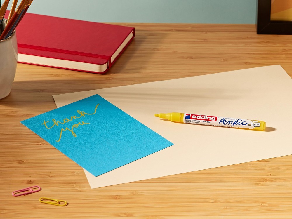 Fine acrylic pen for easy, spontaneous drawing on light or dark surfaces; ideal for materials such as canvases, acrylic paper and painting boards The package contains 1 acrylic marker in traffic-yellow Premium quality acrylic marker, waterproof, pigmented water-based ink; opaque, lightfast and permanent; for a clean application and a matt finish The robust, fine round tip makes easy work of drawing outlines and small details; replacement tips are available Choice of 20 vibrant colours. The edding 5000 & 5100 acrylic markers, plus the edding 5400 3D double liner also come in additional stroke widths