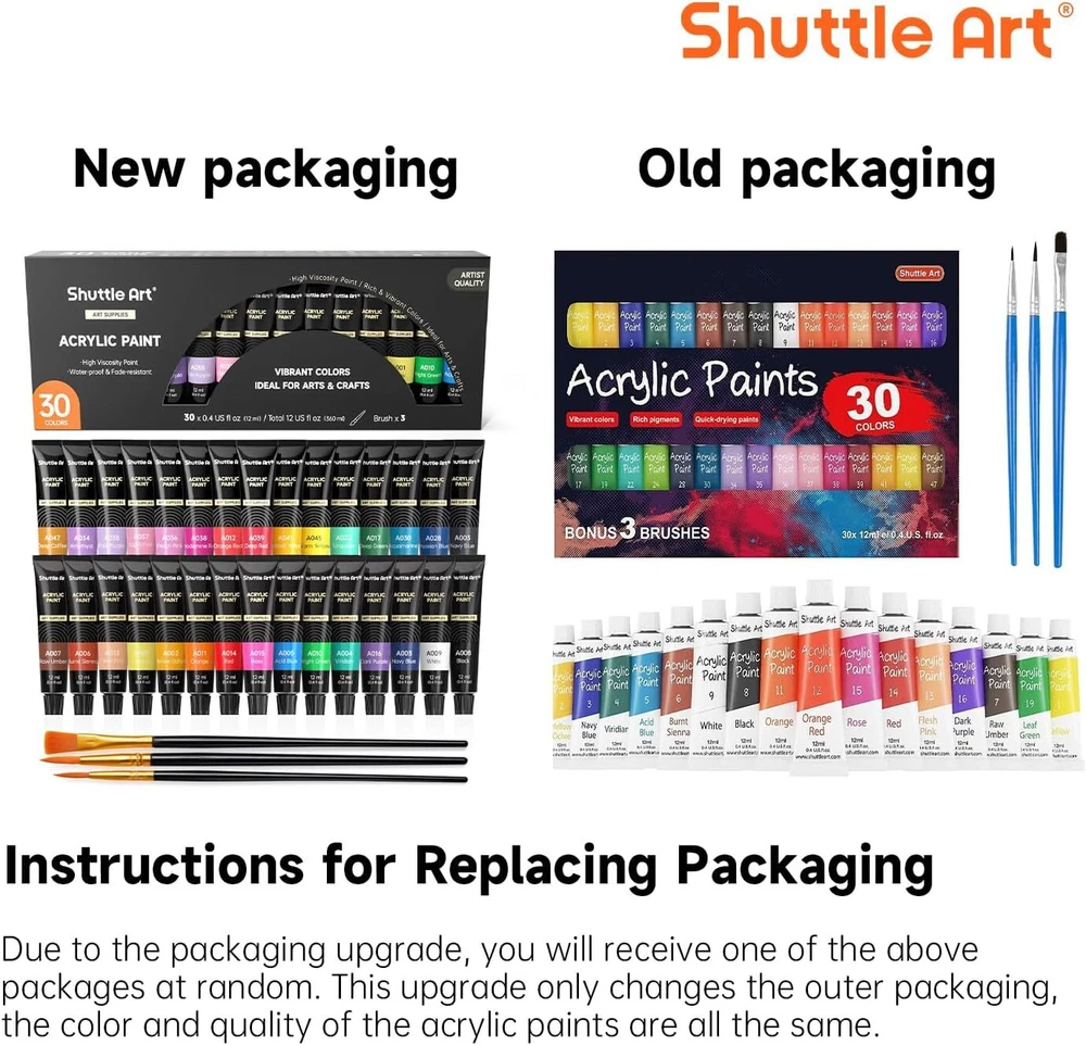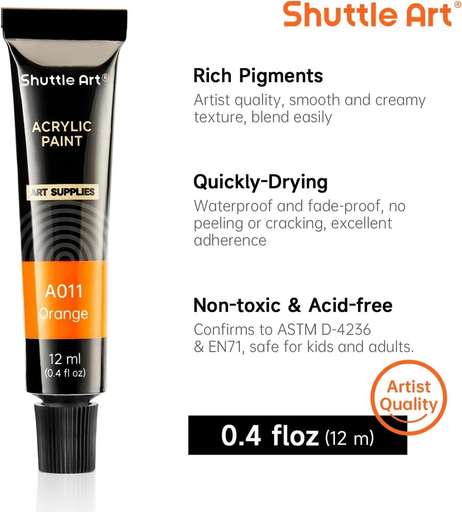 Free Shipping! VIBRANT ACRYLIC PAINTS : Shuttle Art 30 Acrylic Paint Set consists of 30 vibrant assorted colors and with BONUS 3 FREE PAINT BRUSHES. Each tube is filled with 12 ml (0.4 oz) paints with rich pigments that are professional artist quality VERSATILE PAINTS : Paint lay down is creamy and vivid. Great for teens, beginners or artists for wide range of surfaces, such as canvas, ceramic, wood, fabric, clay, walls, nails, crafts and more. Children use acrylic paints in art class and leisure time to develop imagination skills and adults paint to relax and boost creativity, great for creating decorative art for your home DURABLE PAINTS : Acrylics dry very quickly. Paint stays on surface extremely well and is durable and long lasting. It’s permanent, waterproof and fade-proof HIGH QUALITY THICK PIGMENTS : When acrylic pigments are thin, artwork will appear watery and difficult to achieve vibrancy. We have developed a thick and rich pigment that provides superior coverage and maintain smoothness while painting. Conforms to ASTM-D4236, non-toxic and acid-free SERVICE GUARANTEE : Your satisfaction is our top priority, please rest assured to purchase our products. If you are not satisfied with our products or have any questions, please feel free to contact us at any time Product Description 1 PAINT 2 MARKERS 3 PENS 4 PENCILS 5 SCHOOL&OFFICE Artist Quality Acrylic Paint Convenience Tubes Each tube is filled with 12 ml of acrylic paint, making it easy to carry around for storage and giving good control over the amount of paint used during application. Artist Quality Paint These rich, vibrant pigments feature smooth, highly pigmented colors that blend easily to produce true, consistent shades. Ideal for Painting & Crafting Suitable for Kids and Beginners Our acrylic paints are suitable for all ages and skill levels. Whether painting or crafting, these tubes are the perfect introduction to the world of painting. Multipurpose Paint Our acrylic paints are suitable for most surfaces, including canvas, wood, rocks, fabric, ceramic, pumpkin painting, clay, craft and more. Acrylic Paint Guide