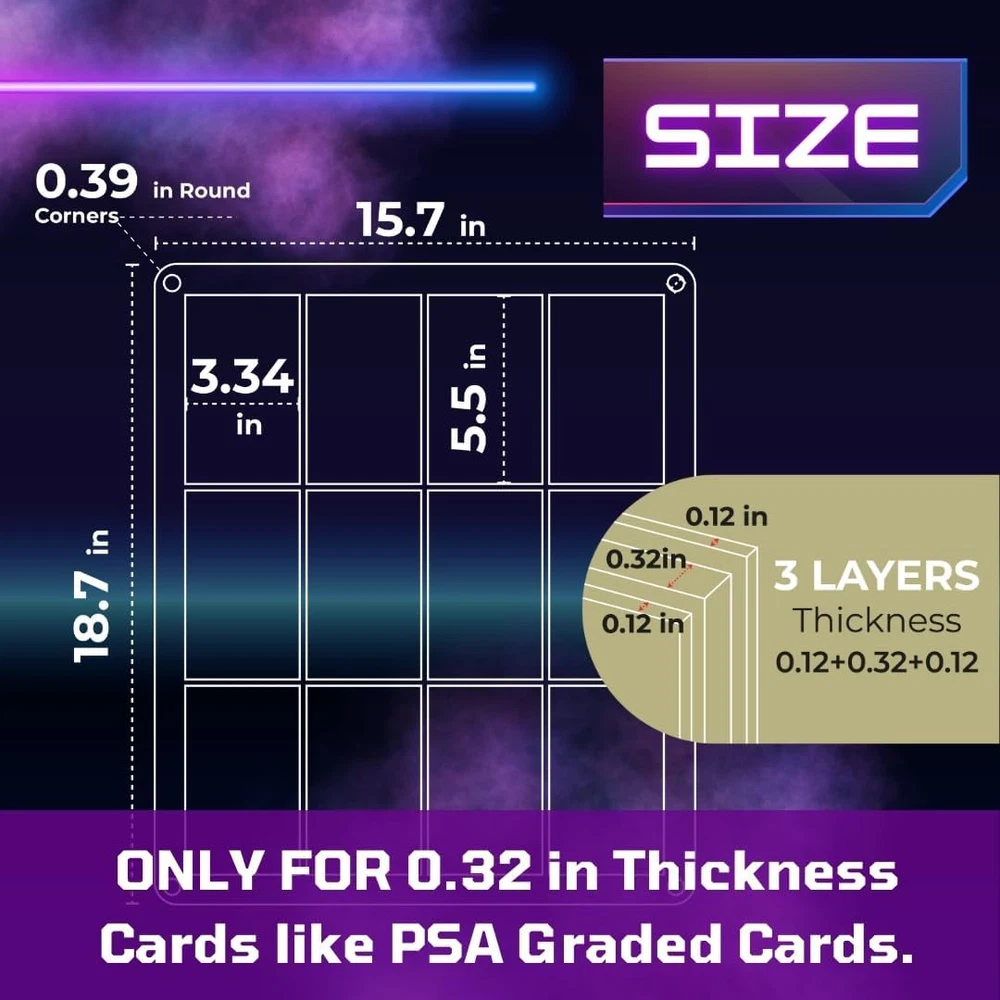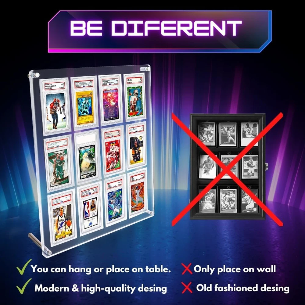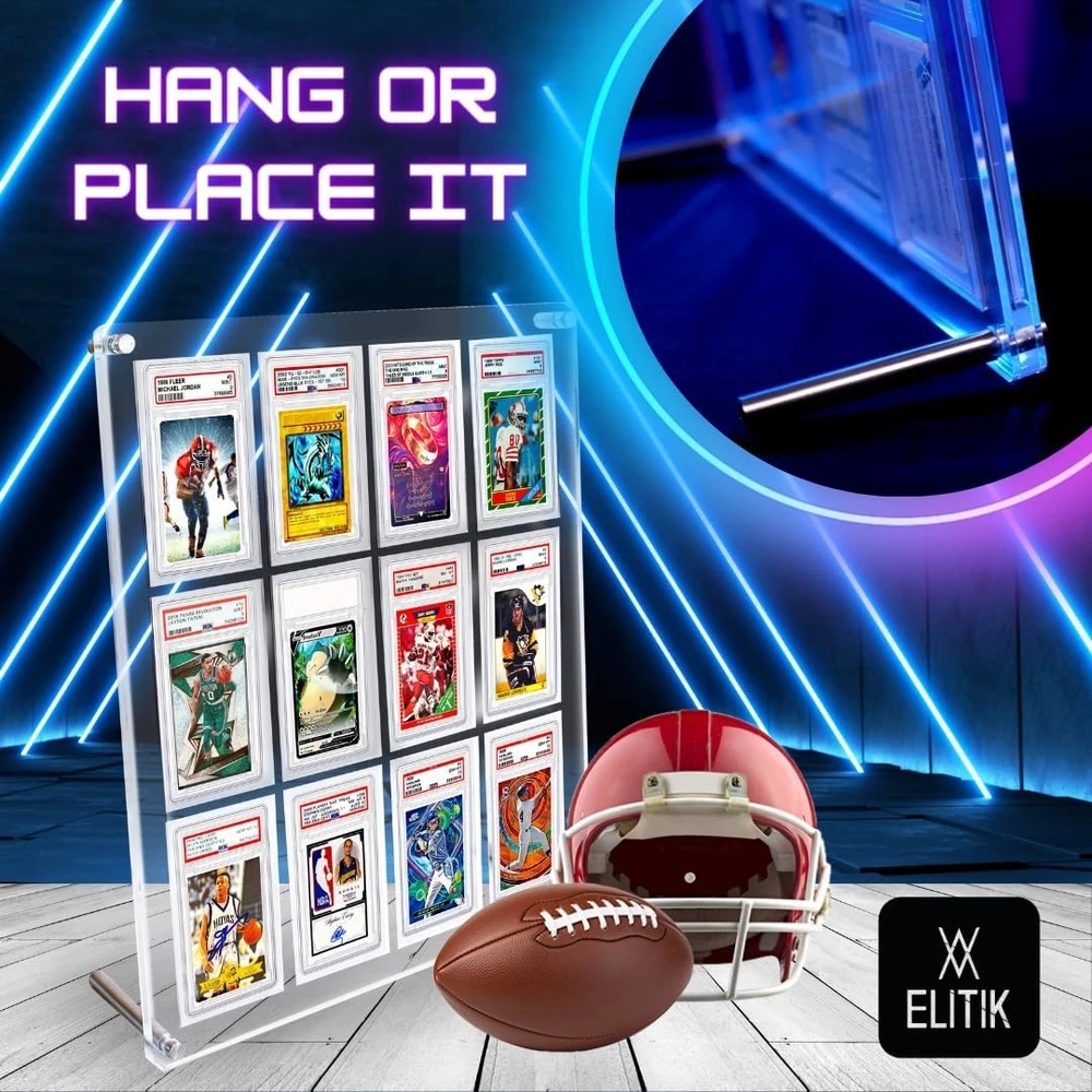 ??? Best card frame to show off your collector cards ???- Sport cards collection display case is made of high quality 98% UV protection acrylic glass. This baseball card display case can well protect your cherished memorabilia or collectibles. The frame outer size is 15,7in X 18,7in X 1,57in, Compartment size for the slabs is 3,34in X 5,5in X 0,31in. NOTE: Cards and slabs are not included. ??? All-in-one wall display case mount and desktop display??? - You can use our graded card display case as a desktop showcase or hang it on the wall. Enjoy dual functionality with our graded card case ??? proudly display on your desk or easily mount it on your wall for maximum versatility. ??? Acrylic Desing??? - Our versatile acrylic card display frame serves as an elegant desk collection showcase or a sophisticated sports card display case for treasured baseball cards packs memorabilia. Unlike others made of wood, which can impart a dark and old-fashioned appearance to your cards, our transparent acrylic trading card display frame design allows your collection to shine in all its glory. ??? Versatile trading card frame options??? - Our card stands for sports cards effortlessly accommodates both horizontal and vertical trading card frames, securely fastening to tabletops. It also transforms into a stylish baseball card storage, serving as a protective slab case for graded cards. Experience the ultimate in multifaceted acrylic card display. ??? Card Protection??? - Elitik's trading card display is crafted from Grade-A acrylic, boasting 92% transparency and 98% UV protection. This card stand safeguard your pokemon slabs from yellowing over time, ensuring an ULTRA-CLEAR view of your cards. This is a perfect card collector gifts. ???Slot Size Comparison: ONE TOUCH vs. PSA Display???To ensure proper fit, we recommend measuring your card or case before purchasing. - The slot for the ONE TOUCH display measures 11.7 cm x 8.2 cm x 0.8 cm (4.61 in x 3.23 in x 0.31 in), designed specifically for magnetic ONE TOUCH cases. - The slot for the PSA display measures 14 cm x 8.5 cm x 0.8 cm (5.51 in x 3.35 in x 0.31 in), tailored to fit PSA-graded slabs.