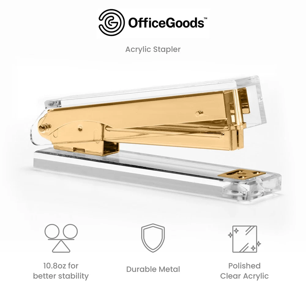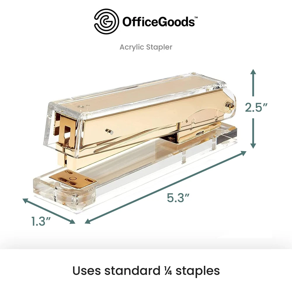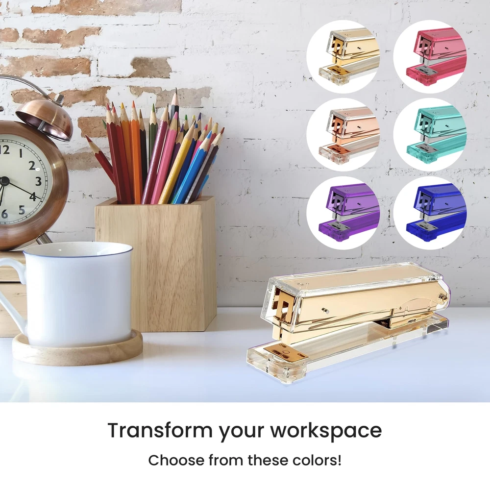 The Acrylic Stapler is elegantly designed with a high transparent luster and a crystal-like appearance with smooth, shiny edges that looks great on anyone's desk. Bring style to your home or office with our gold- or silver-accented acrylic stapler; this handmade product enhances any décor. This cool desk product makes a great gift; create a set with a matching tape dispenser and pencil holder (sold separately). Using standard staples (not included), you can easily attach 12-15 sheets, while non-skid feet help reduce movement and provide stability. This one-hand stapler will shine on your desktop or is small enough to fit in a drawer conveniently. Made with heavy acrylic for daily use and measures 5.25" L x 1.25 W x 2.5" H; clean as needed with a damp cloth. Unique stapler design - Elevate your workspace with a stapler for desk that combines form and function. This manual office stapler unites acrylic and metal for a modern look and aesthetic appeal. Reliable Stapling Performance - Effortlessly staple up to 15 sheets with this sleek stapler for your desk. Measuring 5.30 L x 1.30 W x 2.50 H, it uses standard 1/4" staples for everyday tasks. Multiple use - This long stapler weighs 10.8 ounces; it's a versatile tool that can be used for stapling and holding down paper. For optimal stapling, replace staples when the strip reaches five. A fancy stapler for colorful ideas - choose from these bright colors to complement your style. Available in rose gold, green, purple, pink, blue, silver, golden. Match your - offers acrylic staplers and many more essential office products, creating a stylish and cohesive look, all crafted with the best quality and aesthetic design in mind.