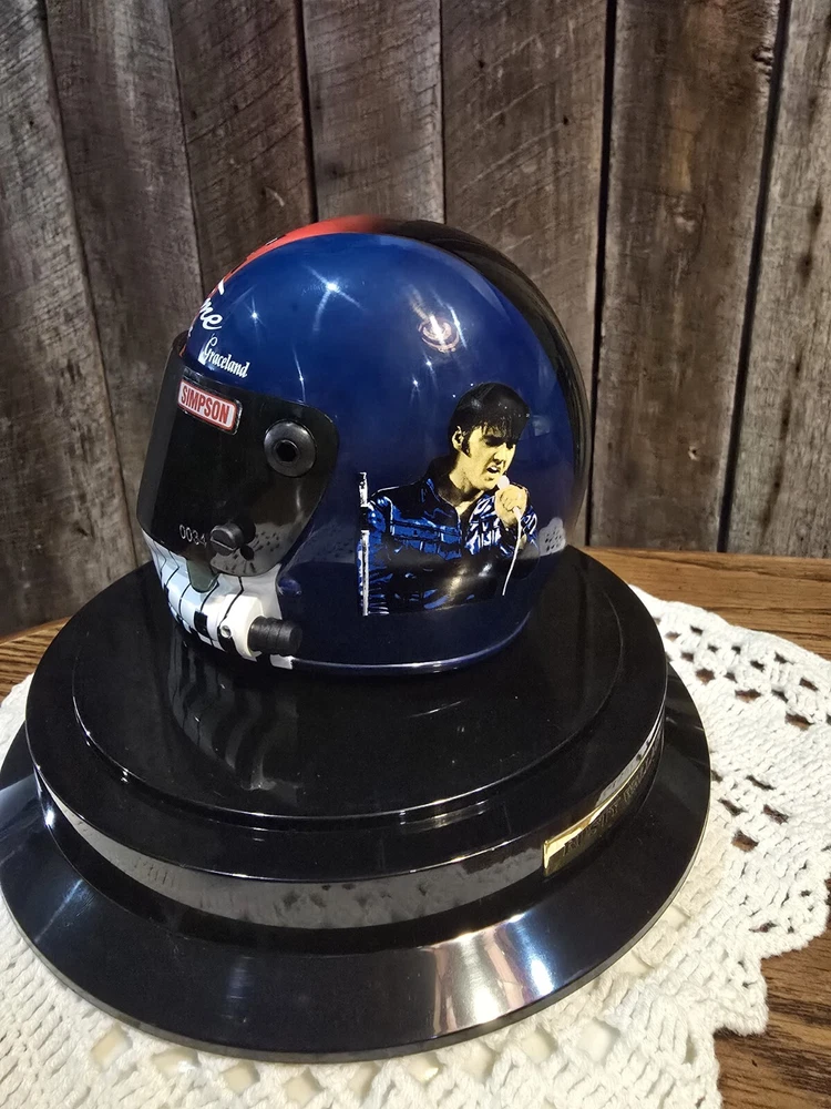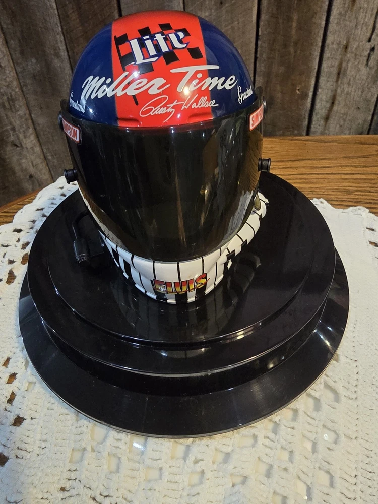 This is a special edition Miller Lite helmet worn by Rusty Wallace in the 1998 NASCAR race. The helmet features a unique Elvis Presley design, as Rusty is a fan of the King of Rock and Roll. This item is perfect for collectors of racing memorabilia and fans of NASCAR. It is a great addition to any sports fan's collection.