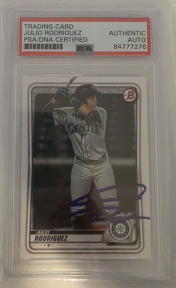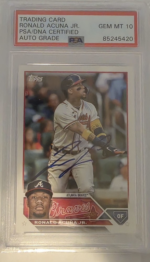 3 of Today's Baseball superstars future hall of famers. When collecting Autographs everyone knows there's nothing better than the actual player's hand writing Signatures! We also know a signature means nothing without certification. Rest easy with the satisfaction of having PSA The leader of grading and certification guarantee! These cards have been given the top Autograph grades of GEM MINT 10. PSA/DNA CERTIFIED JULIO RODRIGUEZ AUTOGRAPH 2020 BOWMAN DRAFT 1ST ROOKIE CARD ON CARD SIGNATURE GUNNER HENDERSON AUTOGRAPH 2019 BOWMAN DRAFT ROOKIE ON CARD SIGNATURE RONALD ACUÑA JR. AUTOGRAPH 2023 TOPPS SERIES 1 ON CARD SIGNATURE