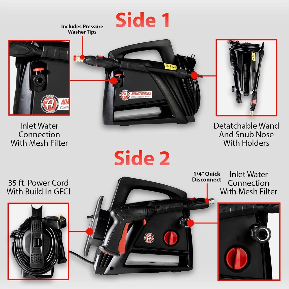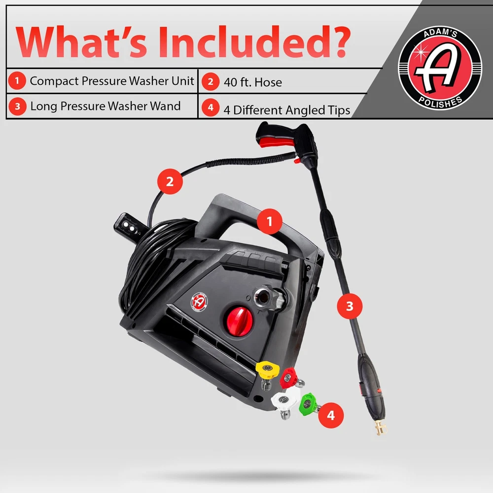 ✅ POWERFUL - The Compact pressure washer packs a punch with a maximum pressure of 1500 PSI and an operating PSI of 1350 at 1.2 gallons per minute (GPM). Its high flow rating makes it a versatile tool for auto detailing and household projects, delivering impressive performance despite its compact size. ✅ LIGHTWEIGHT & PORTABLE - This pressure washer is designed with convenience in mind. Its incredibly small footprint allows for easy storage, and it can be placed on a shelf or cart during use, ensuring portability and mobility. You won't have to sacrifice power for portability with this unit. ✅ BUILT TO LAST - Durability is a key feature of the Compact pressure washer. It's constructed to withstand the demands of regular use and comes with a 40-foot pressure washer hose for extended reach. The 35-foot power cord includes a built-in GFCI, enhancing safety during operation. ✅ EASY TO USE - With a standard ¼” quick disconnect connection at the sprayer end, this pressure washer is compatible with most foam cannons and pressure washing accessories, making setup a breeze. The inlet water includes a mesh filter to ensure clean and hassle-free operation. Experience the perfect blend of power and convenience with this pressure washer for all your detailing and cleaning needs. ✅ 110% SATISFACTION GUARANTEE - We stand behind our products, and we want our customers to be completely satisfied with their purchase. If you're not satisfied with our detailing kits, waxes, sealants, ceramic coatings, car accessories, or any of our high-quality car cleaning products, let us know and we'll make it right!