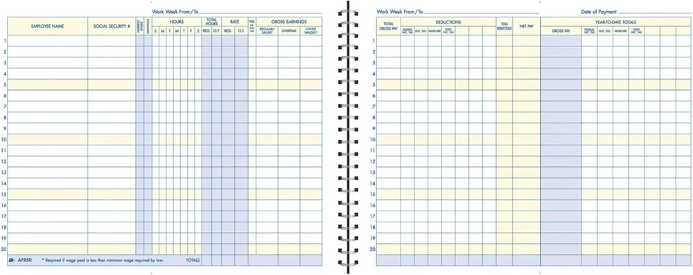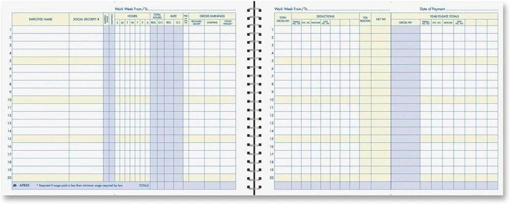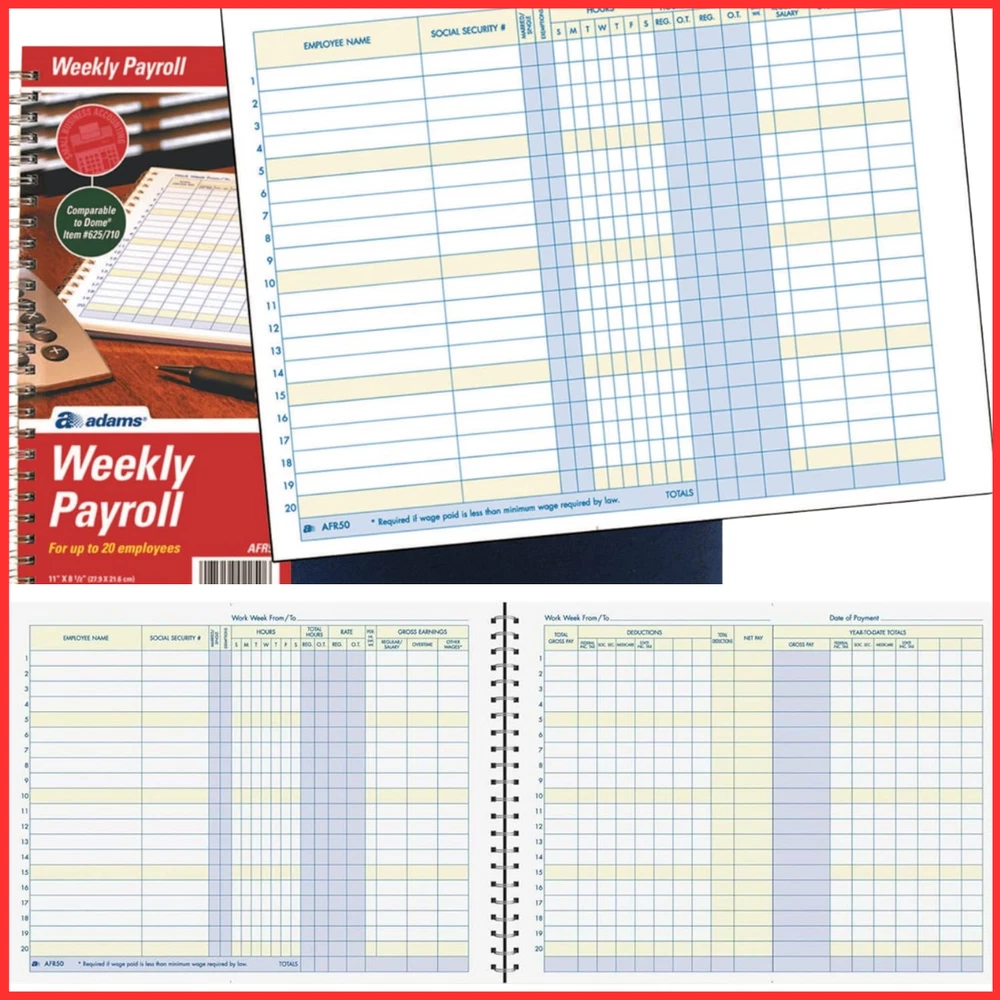 Tracks weekly hours, pay rates, taxes and other deductions Wire-o spiral binding allows book to lay flat so rows line up across the pages Summary page in back of book Blue and yellow printing designed to reduce eye strain Up to 20 employee capacity Adams Business Forms provide the tools to help keep track of messages, finances, transactions, employees, taxes, and customers to businesses throughout the world. These products are the perfect way to create and maintain a professional image for small businesses and service providers. The Adams Weekly Payroll Record tracks weekly hours, pay rates, taxes and other deductions for up to 20 employees. The special Wire-o spiral binding allows book to lay flat so rows line up across the non-dated pages. The back of the book provides a convenient summary page for quick totals at a glance. The Adams Weekly Payroll Record features blue and yellow printing which is designed to reduce eye strain. Whether it's a multi-part form, notebooks, writing pads, record books, or any of the hundreds of items we offer, you can count on Adams products to help!