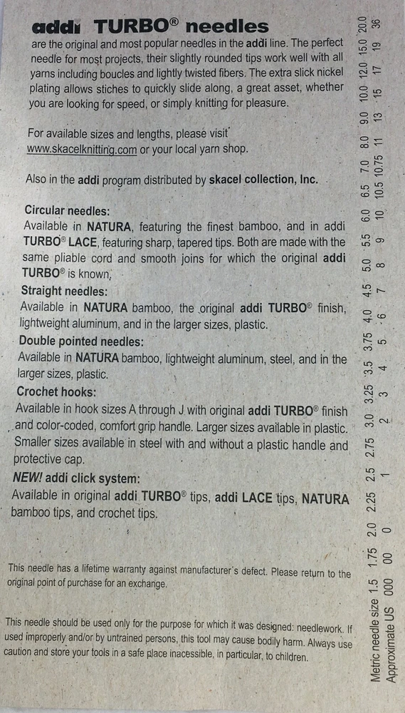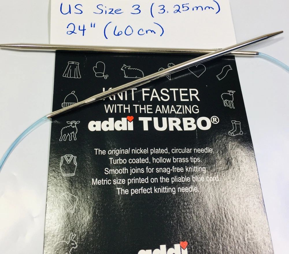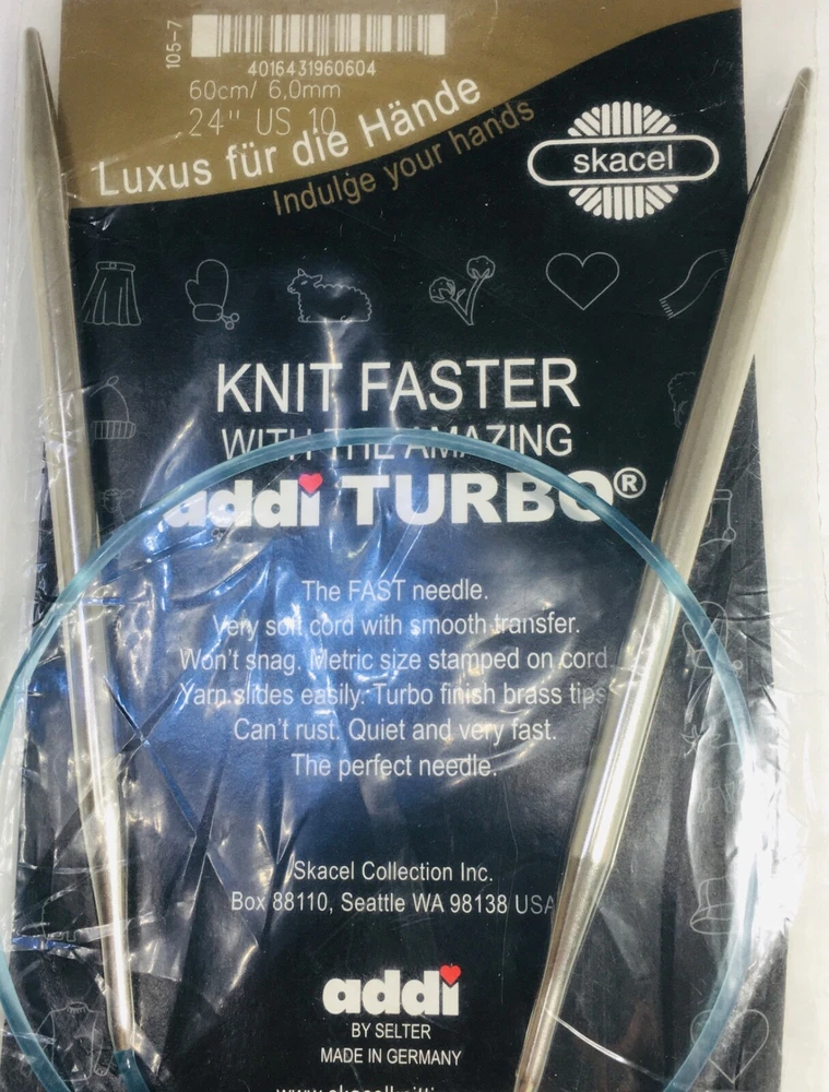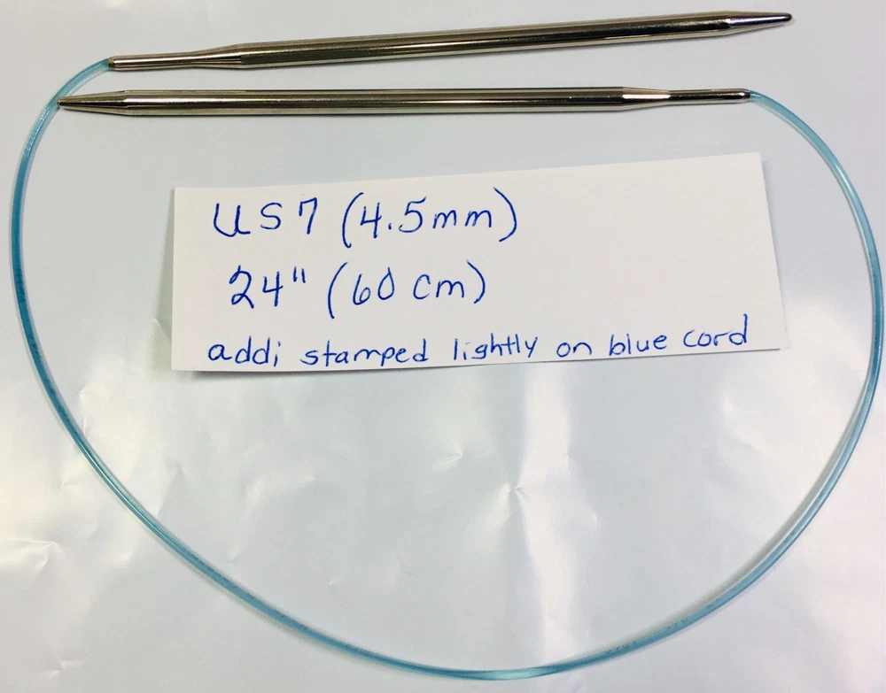 Up For Your Consideration Today: One (1) Pair Of Circular Knitting Needles with Addi quality cords and joins Addi Turbo Original Circular Knitting Needles * Slick addi Turbo nickel-plated finish. * Soft pliable blue cords * Smooth joins for snag-free knitting. * Size stamped on cord on larger sizes. * Hollow, coated brass tips. * Made in Germany Condition: Preowned, in like-new condition. Always stored in my craft room under heat and air. Clean, no spots or stains, and no bad odors. I have a lot of Addi knitting needles for sale in my eBay store right now. I combine shipping, to learn how … please read last photograph. Please see a ll the photos of these needles - click on them to zoom in and make them larger. These photos are the best description of these knitting needles. The last photograph explains how to combine shipping when you purchase more than one listing from my eBay store at the same time. I make every effort to accurately describe items, and photograph the true color, but if I misrepresented an item, please contact me first through eBay, so that I may resolve the situation, before leaving neutral or negative feedback. I strive to keep my 100% feedback rating. Thank you for looking at my listings and being supportive of my efforts. My home is smoke and pet free.