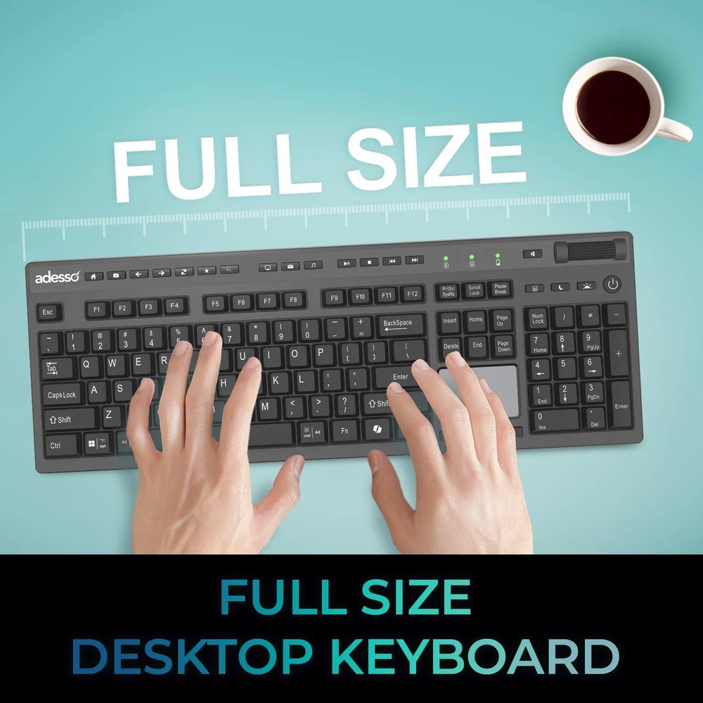 The Wireless Touchpad Keyboard offers a complete solution for those seeking a seamless computing experience with 2.4GHz RF wireless technology and a 30 ft range. Designed for ultimate convenience, it features a built-in touchpad with left and right mouse buttons and a scroll pad, eliminating the need for a separate mouse. The 104-key QWERTY layout provides a familiar and comfortable typing experience, while 13 Internet hotkeys and 8 multimedia hotkeys ensure quick access to essential functions. Its sleek, modern design with chrome accents and a piano finish makes it a stylish addition to any workspace. Compatible with Windows 10 and above, as well as notebooks, iPads, iMacs, and smart phones with USB connectivity, this keyboard is a must-have for those who value efficiency and elegance. Wireless Convenience: Enjoy seamless connectivity with 2.4GHz RF wireless technology powered by 2 AAA Batteries. No cables or line of sight required. Up to 30 ft working range. Integrated Touchpad: Built-in touchpad eliminates the need for a mouse, includes left and right mouse buttons and a scroll pad for effortless navigation of documents and web pages Multimedia Hotkeys: 13 Internet hotkeys for quick access to Home Favorite Back Forward Refresh Stop Search My Computer Email Calculator Sleep Wake Power. 8 multimedia hotkeys for volume and media control Full 104 Key Layout: Standard US QWERTY keyboard layout with membrane keys for a comfortable typing experience. num lock caps lock and battery low indicators for easy monitoring Compatibility: Works with Windows 10 and above PCs notebooks iPads iMacs and smart phones with USB connectivity; nano USB wireless receiver for plug and play setup