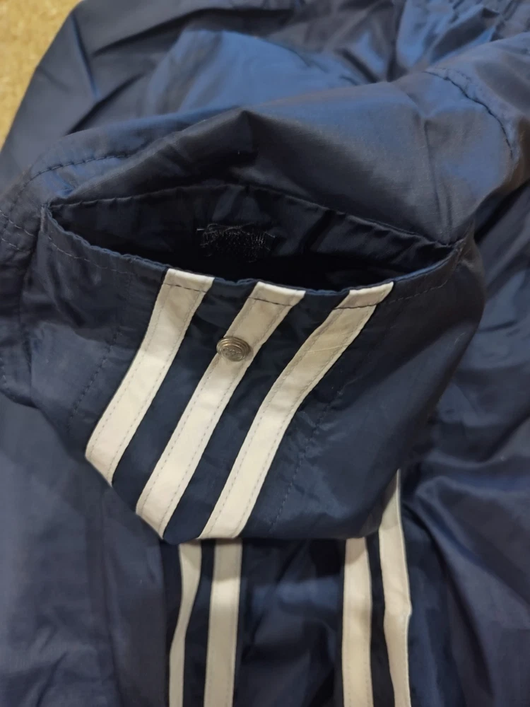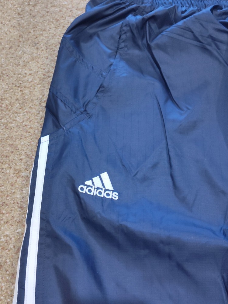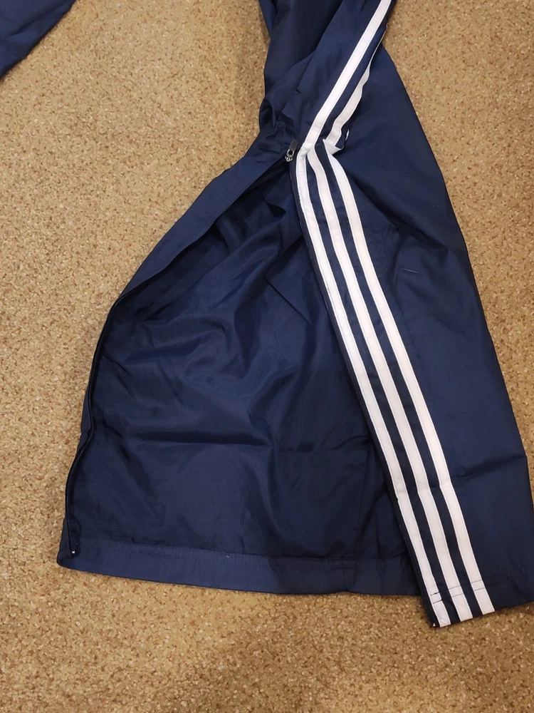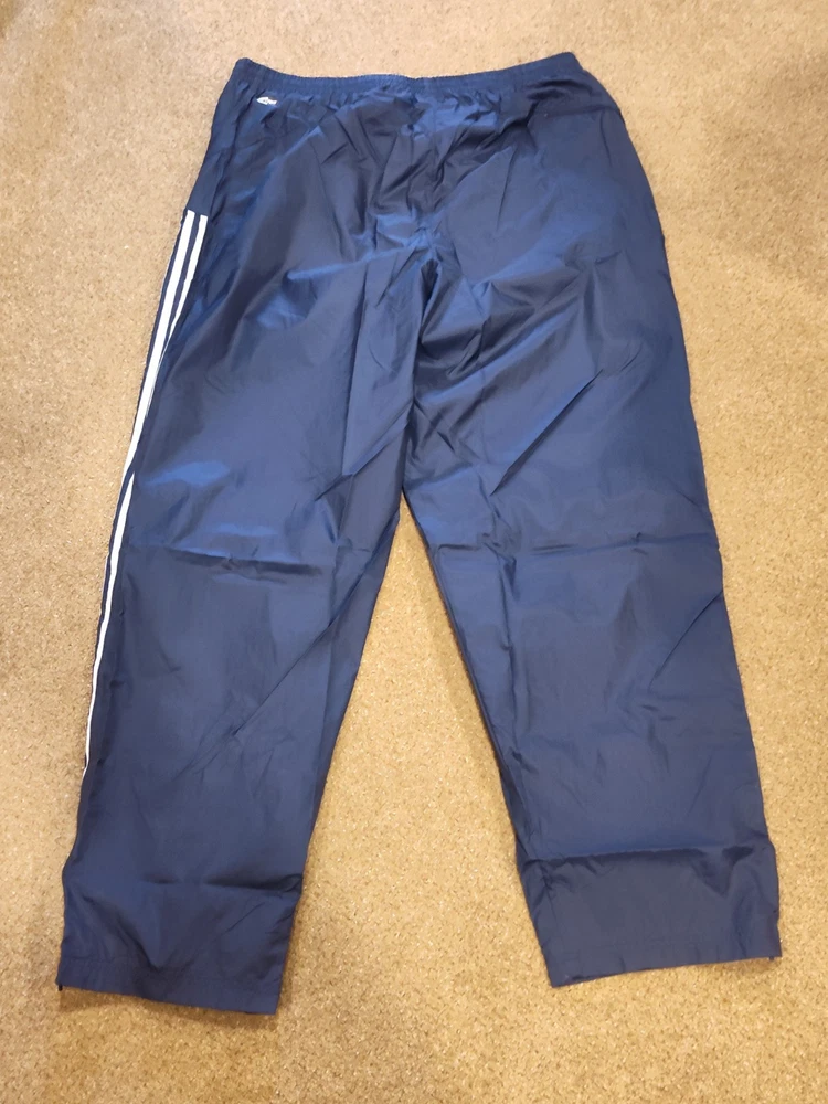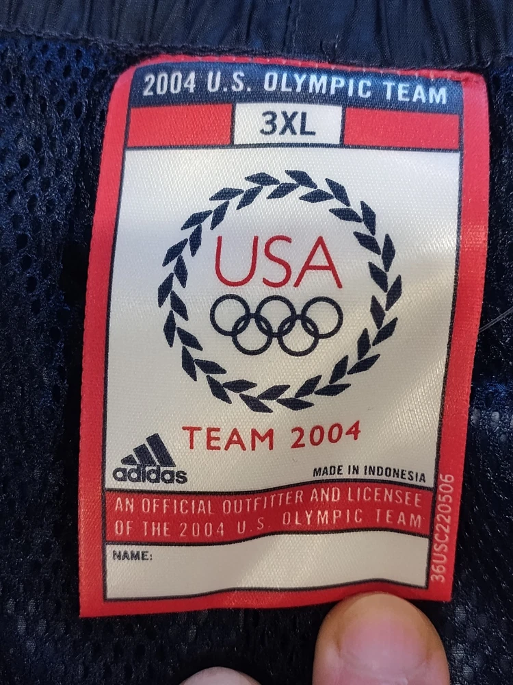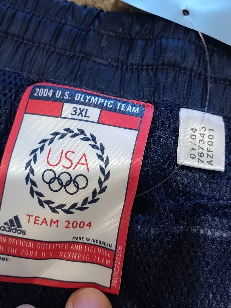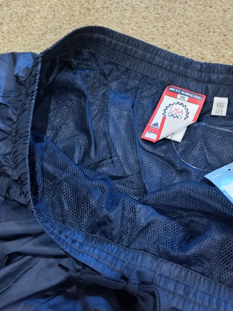 New Adidas 2004 Athens Olympics USA Teflon Track Pants Navy Mesh Lined Vintage Men's 3XL. Zipper opening leg bottoms. 4 pockets: 2 front hip pockets, one back zipper pocket and one side pocket.