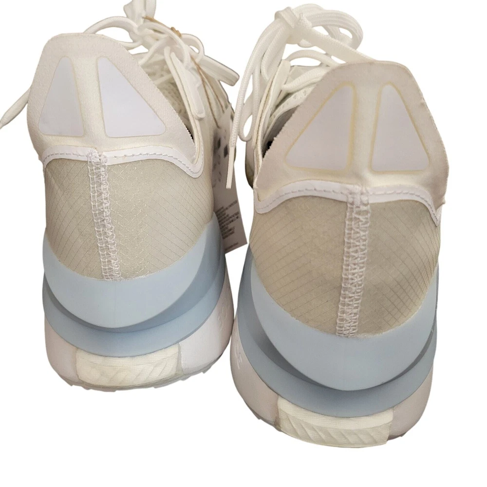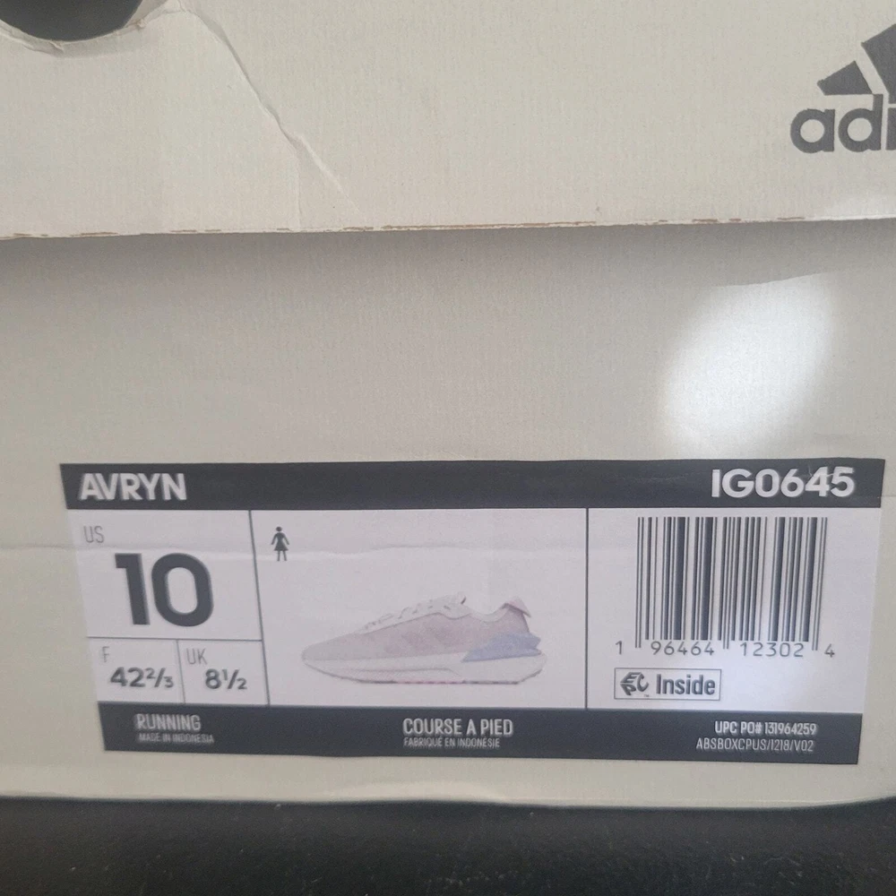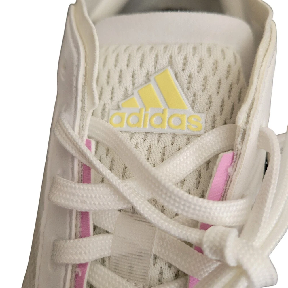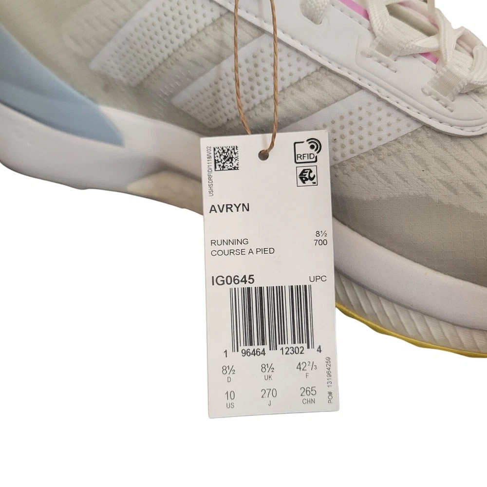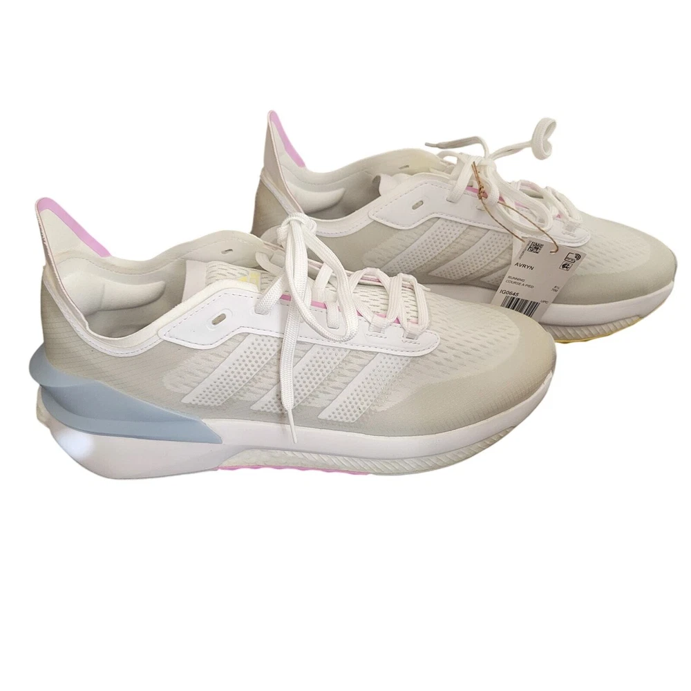 Adidas Avryn White Wonder Blue Women's Athletic Sneaker Women's Running White, Gray and Blue on the top of the shoe The bottom of the shoe is pink, gray, and yellow Sole material is rubber Mesh Upper Lace-up Mid Sole Layers Boost Bounce Technology that delivers Comfort and Support These are new but they may have been returned and may have been tried on. MSRP is $140.00