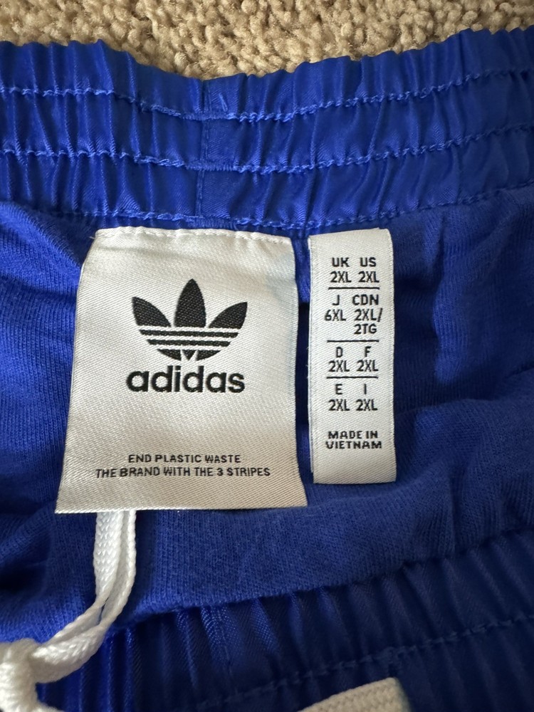 Occasion: Activewear Season: Fall, Spring, Summer Country of Origin: Pakistan Material: Polyamide Size Type: Regular Brand: adidas Personalize: No Handmade: No Theme: Classic Pattern: Solid Vintage: No Inseam: 5 in Closure: Drawstring Performance/Activity: Cross Training, Gym & Training, Running & Jogging Department: Men Fabric Type: Microfiber Fit: Athletic Garment Care: Machine Washable Product Line: adidas Originals Color: Blue Features: Regular fit track shorts, Drawcord on elastic waist Size: 2XL Style: Athletic Compression Area: Waist
