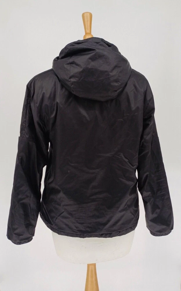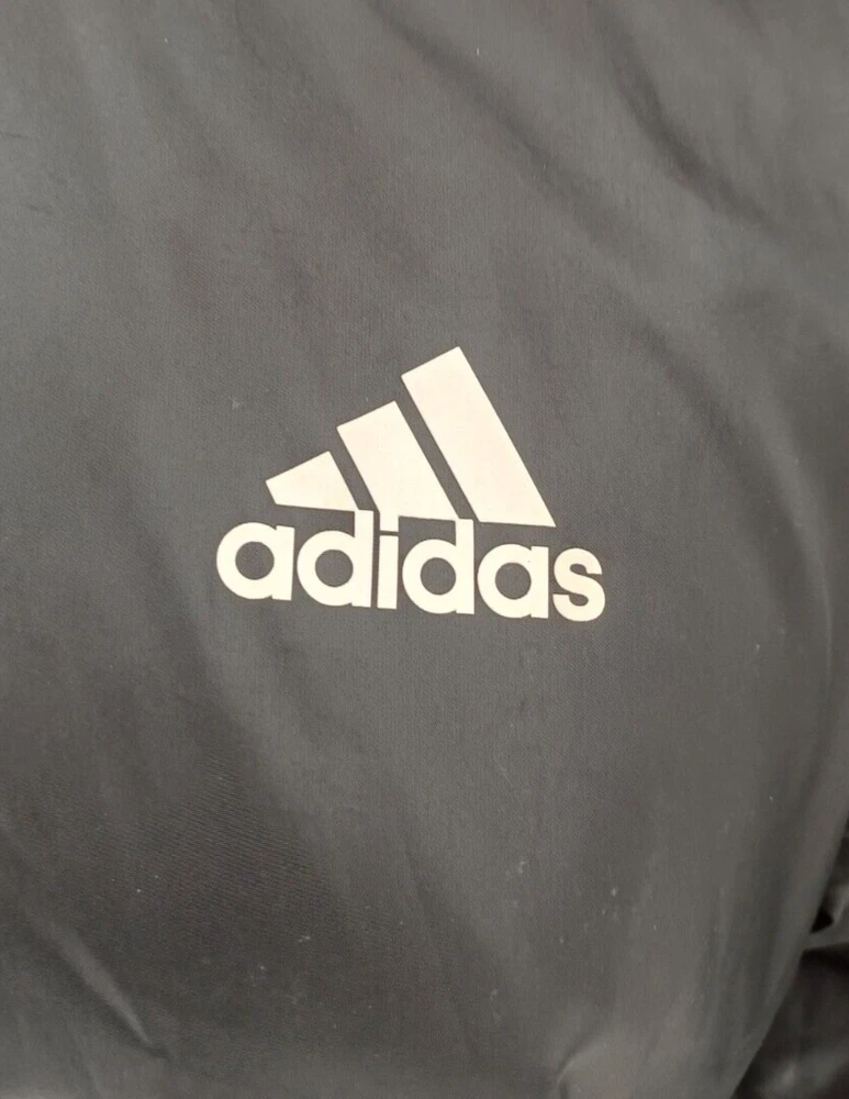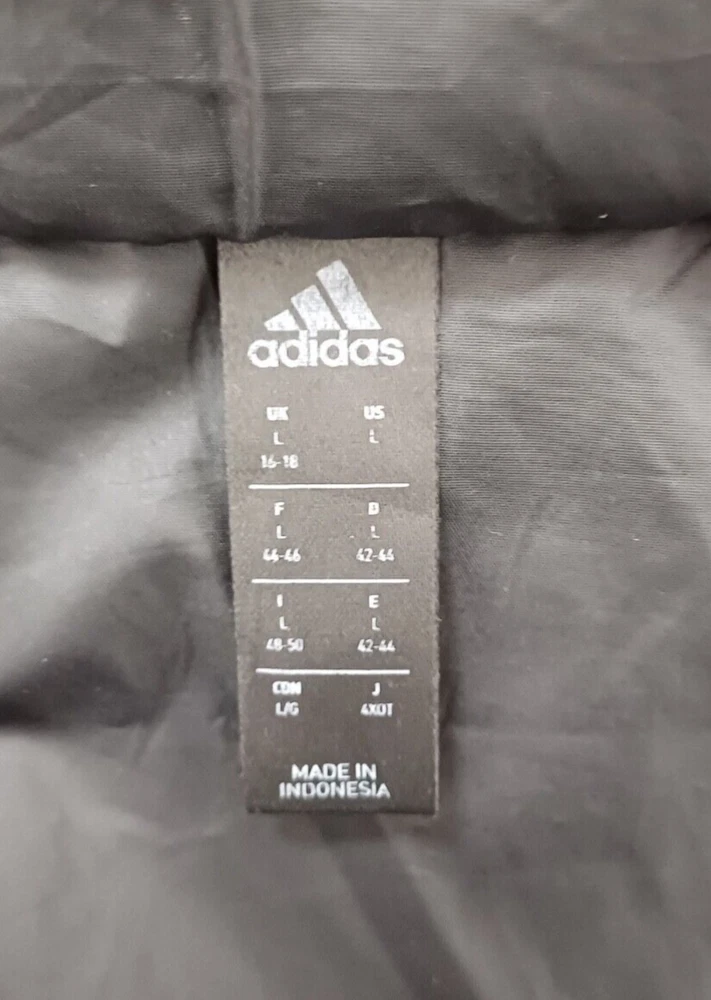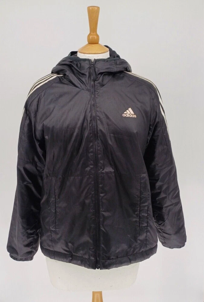 Adidas Insulated Hooded Jacket Women's Size Large. A black zip up insulated jacket. It says UK size 16-18 on the label but it fits like a UK 12-14. It’s in very good condition however there is some light wear and some discolouration on the white stripes. As well as this, there are some small marks on the back. Measurements: Pit-to-pit: 22.5 inch Chest: 45 inch Pit-to-cuff: 19.5 inch Length: 25 inch