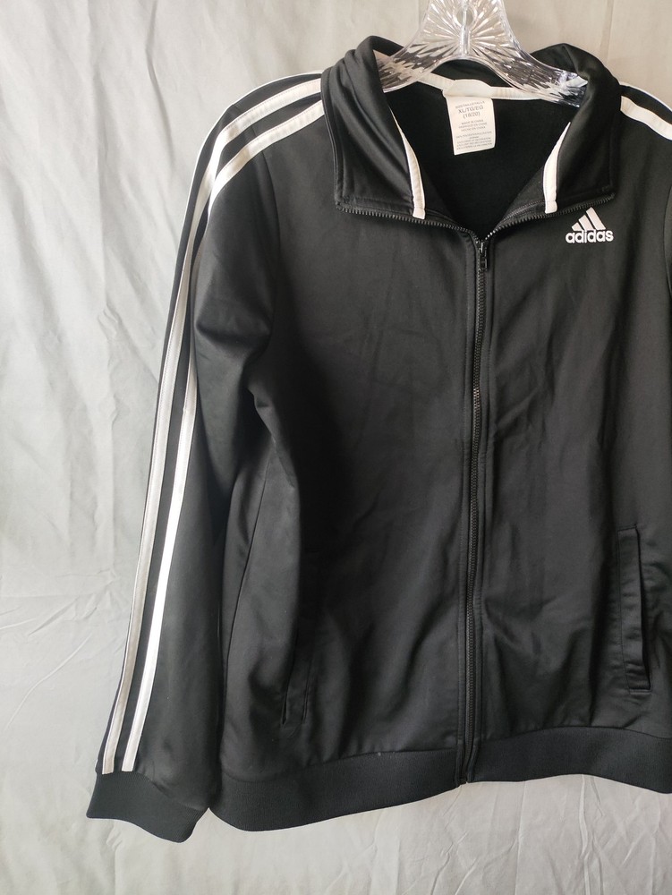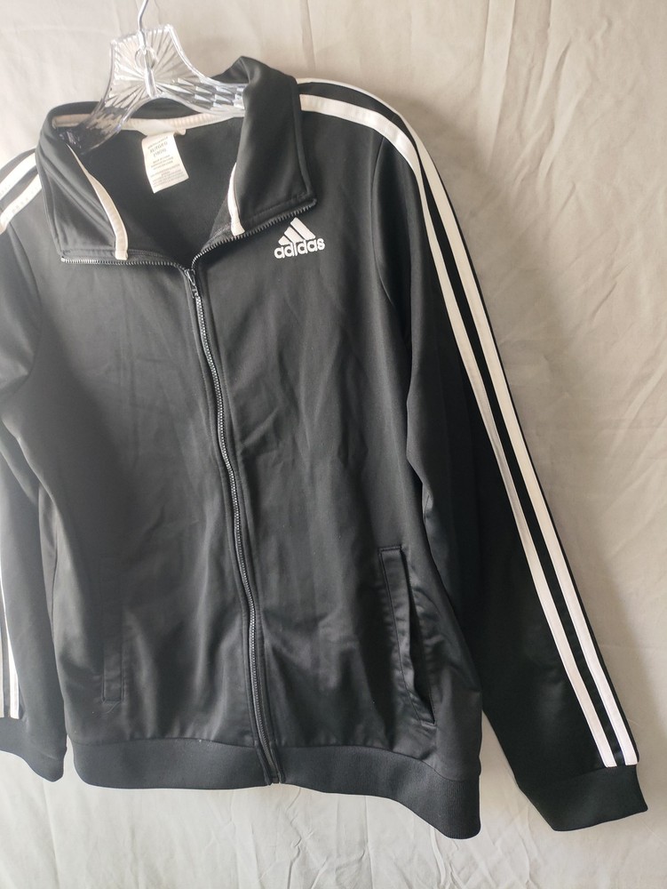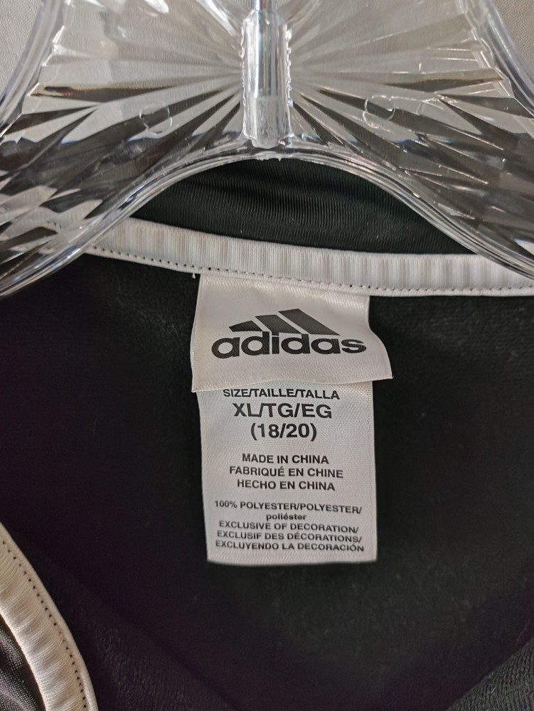 Adidas Jacket Mens XL Black White Track Full Zip Athletic 3 Stripes Logo Polyester Condition: Gently worn, no visible flaws. Zipper and trim are fully functional, with no stains or holes detected. Shell: 100% polyester Classic Adidas three-stripe design on both sleeves Embroidered Adidas logo on front left chest Full zip front closure Two front hand pockets Ribbed cuffs and hem for a secure fit Tag size: XL (18/20) - Mens Main color: Black with white stripes Style: Athletic track jacket Perfect for sports, athleisure, or everyday casual wear Made in China