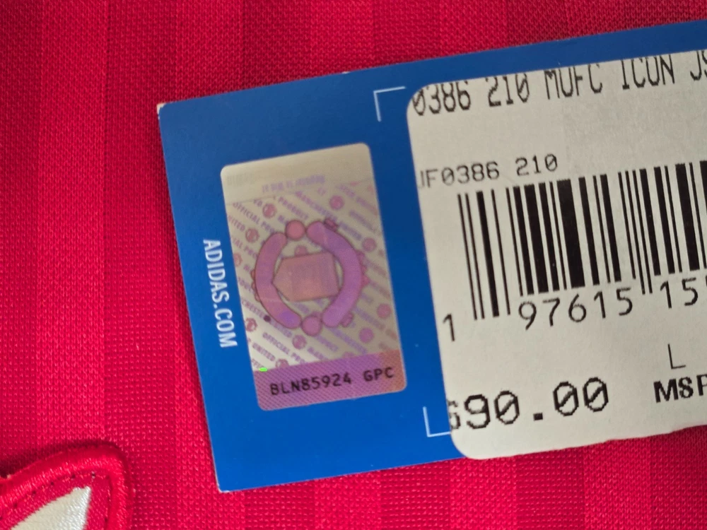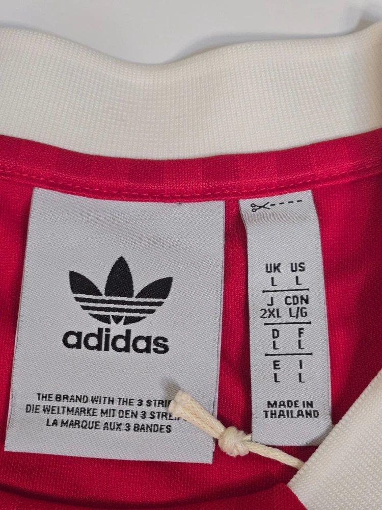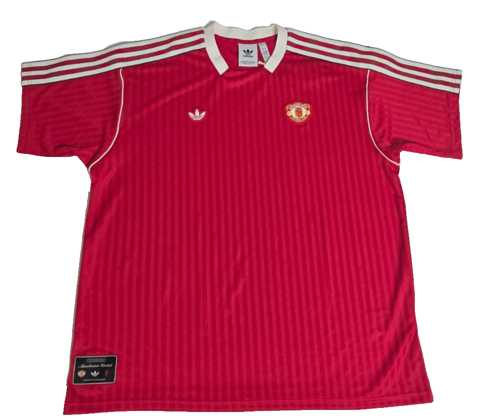 The product is a brand new, officially licensed Adidas Manchester United FC Red Terrace Icon Jersey in size L for men. Made in Thailand, this soccer jersey in red color is designed for fans of the English Premier League team, Manchester United. Perfect for showing support for your favorite club during matches and displaying team pride. MSRP: $90.00