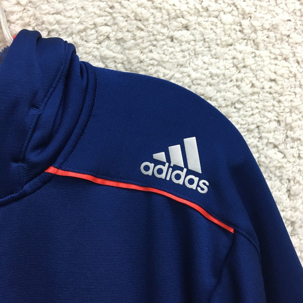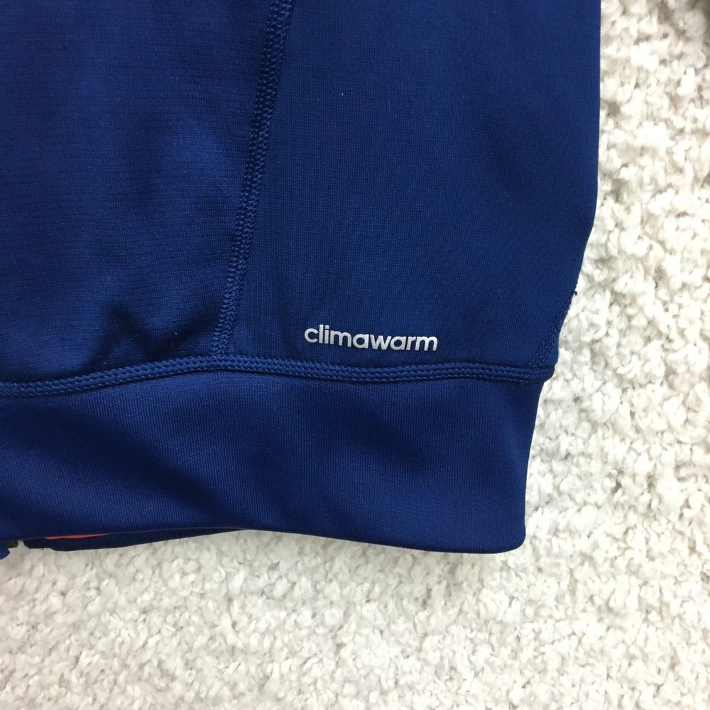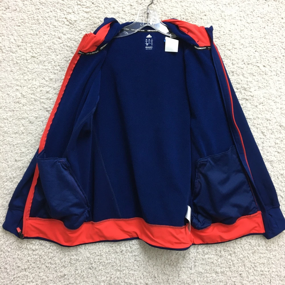 Adidas Jacket Mens Small Blue ClimaWarm Full Zip Hooded Athletic Red Trim Pockets Condition: Gently worn, no visible flaws, zippers and seams all intact Material: 95% polyester, 5% spandex Features a full zip front with bright red contrasting zippers and piping Two zippered hand pockets for secure storage Drawstring adjustable hood for added warmth ClimaWarm thermal insulation for cold weather workouts Adidas logo embroidered on left chest Interior waffle lining for extra warmth and comfort Color: Deep blue with red accents Made in Thailand Tag size: Small (Mens) Approximate flat measurements: Pit to pit 20 in; Back length 27 in Inventory Number: Z1253