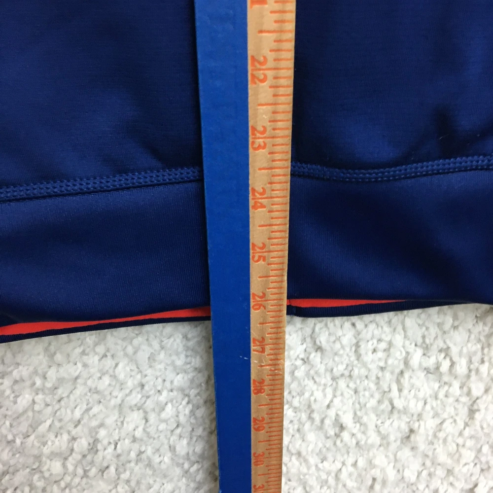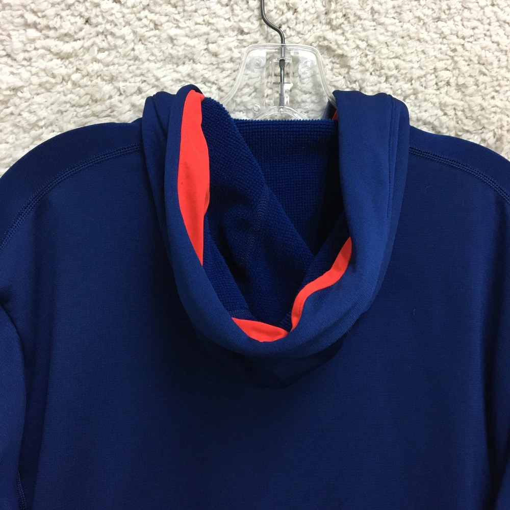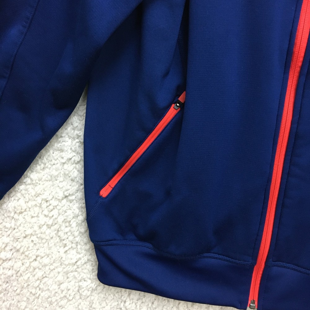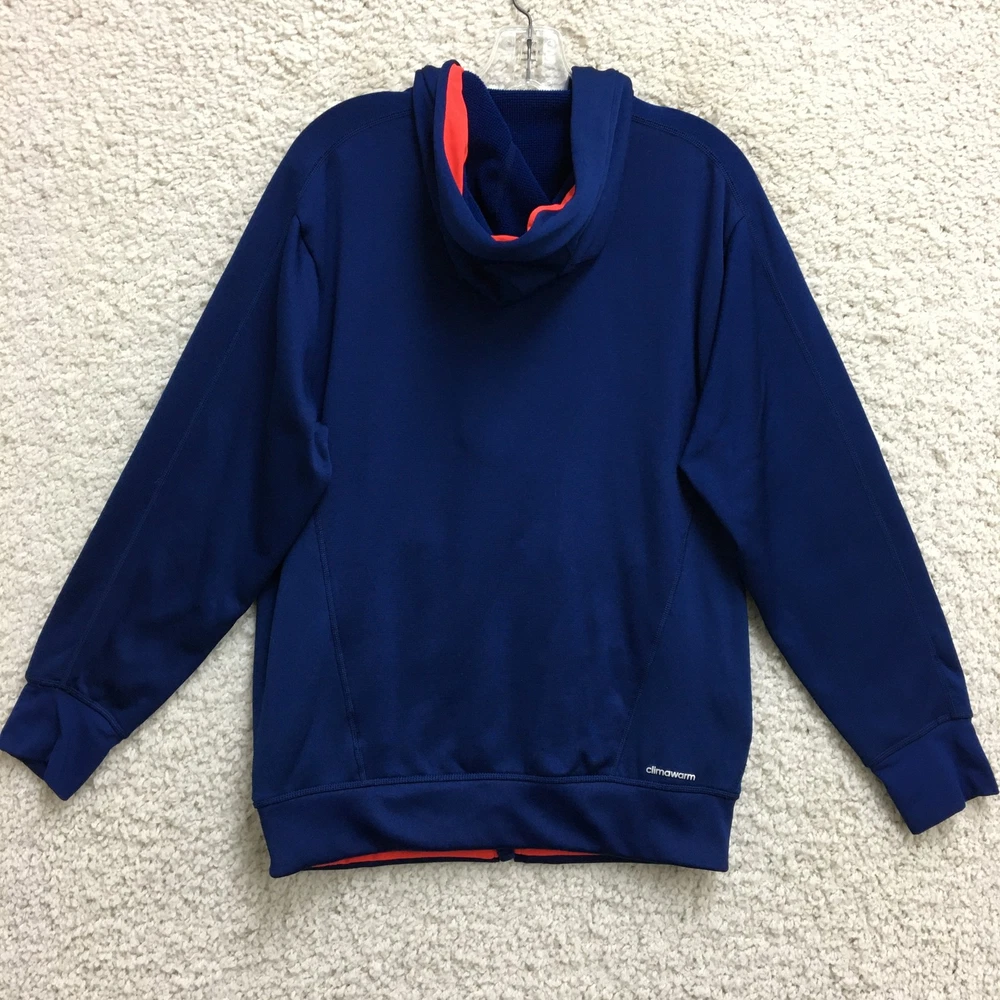 Adidas Jacket Mens Small Blue ClimaWarm Full Zip Hooded Athletic Red Trim Pockets Condition: Gently worn, no visible flaws, zippers and seams all intact Material: 95% polyester, 5% spandex Features a full zip front with bright red contrasting zippers and piping Two zippered hand pockets for secure storage Drawstring adjustable hood for added warmth ClimaWarm thermal insulation for cold weather workouts Adidas logo embroidered on left chest Interior waffle lining for extra warmth and comfort Color: Deep blue with red accents Made in Thailand Tag size: Small (Mens) Approximate flat measurements: Pit to pit 20 in; Back length 27 in Inventory Number: Z1253