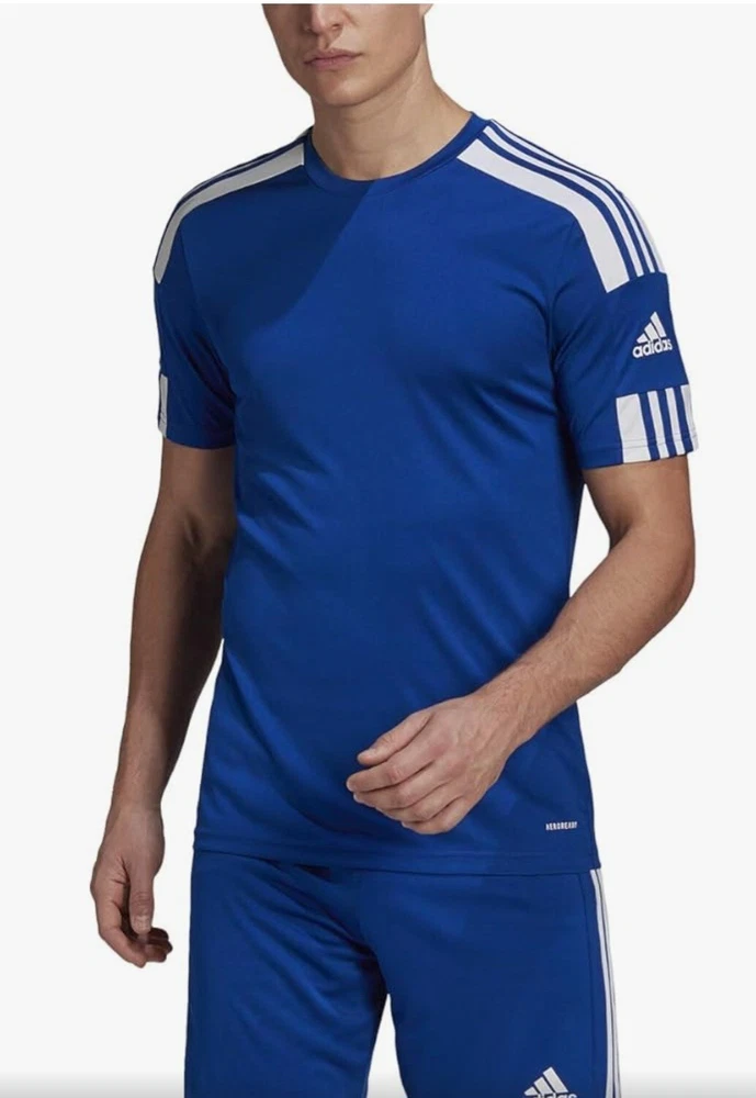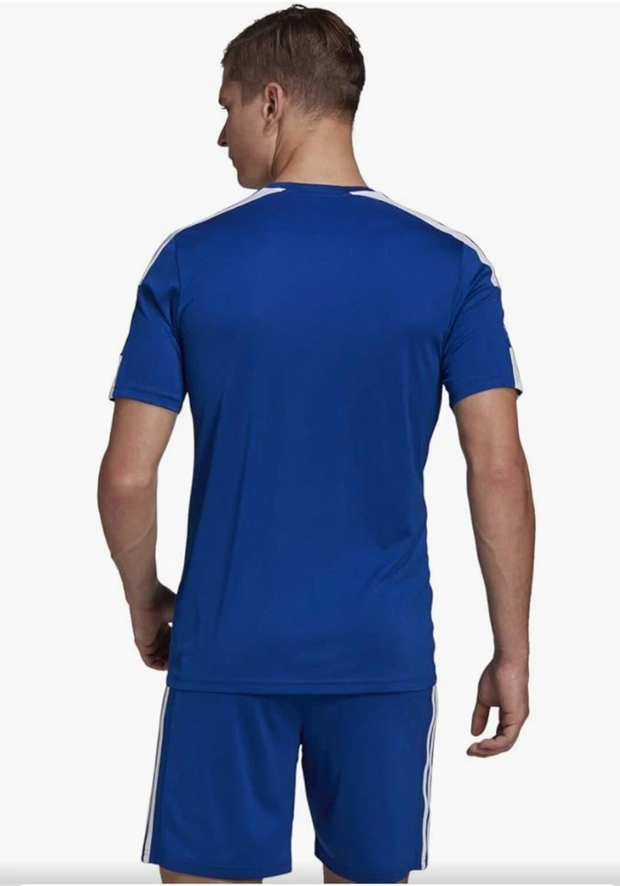 Elevate your activewear game with this Adidas Men's Squadra 21 Sports Shirt Football Short Sleeve Soccer Jersey. The royal blue and white jersey features an asymmetrical sleeve, crew neckline, and pullover closure. It's made of a lightweight and breathable jersey fabric with contrasting trim and moisture-wicking technology for all seasons. The shirt is machine washable and quick-drying, making it perfect for soccer and football activities. It also comes with a tagless design and is compressible for easy storage. Get ready to astound the crowd with this stylish and functional jersey from Adidas.