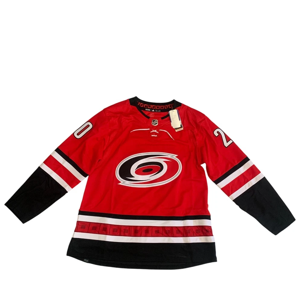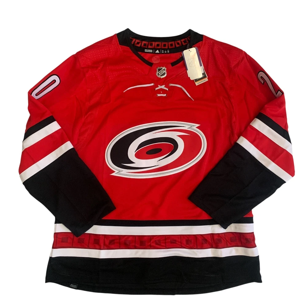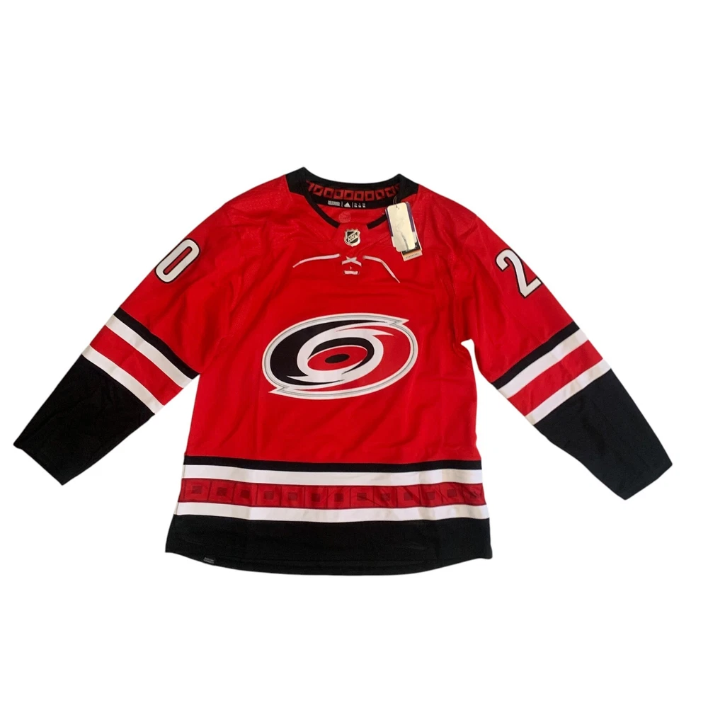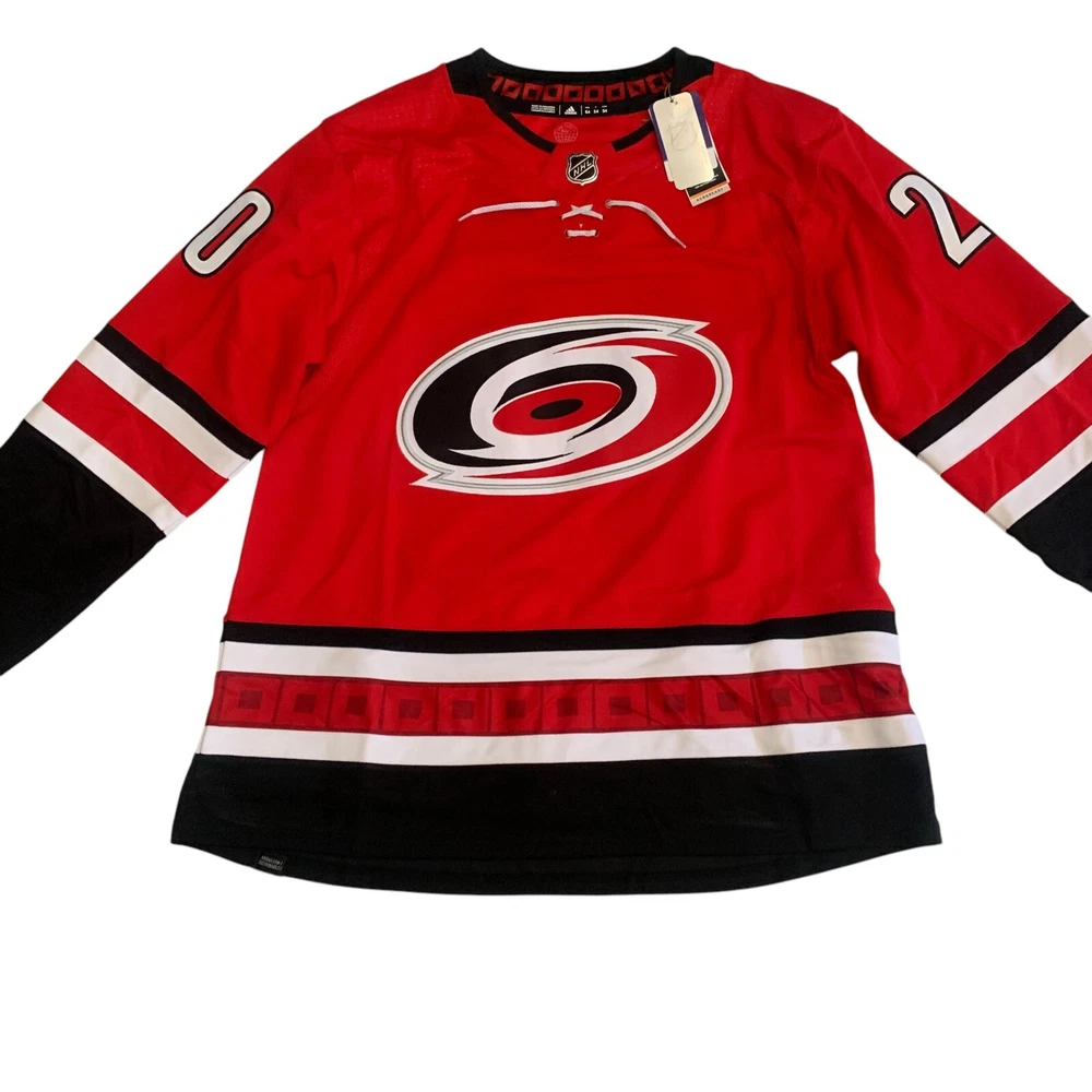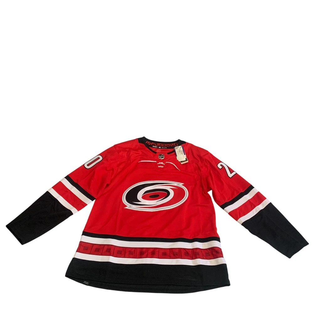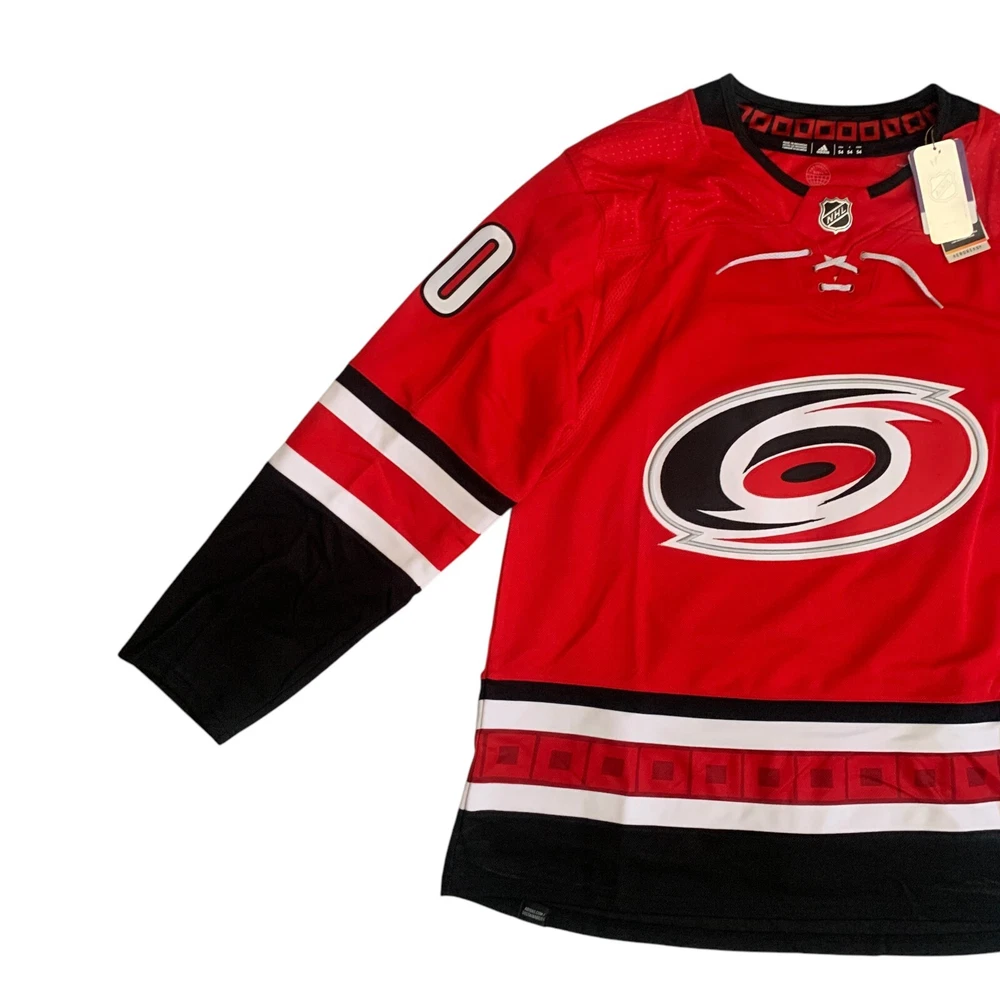 Material: 100% Polyester Recycle Team: Carolina Hurricanes Gender: Men Pre & Post Season: Regular Season Color: Red League: National Hockey League (NHL) Country/Region of Manufacture: Indonesia Brand: adidas Size: 54 Player: Sebastian Aho Sport: Hockey Product: Jersey