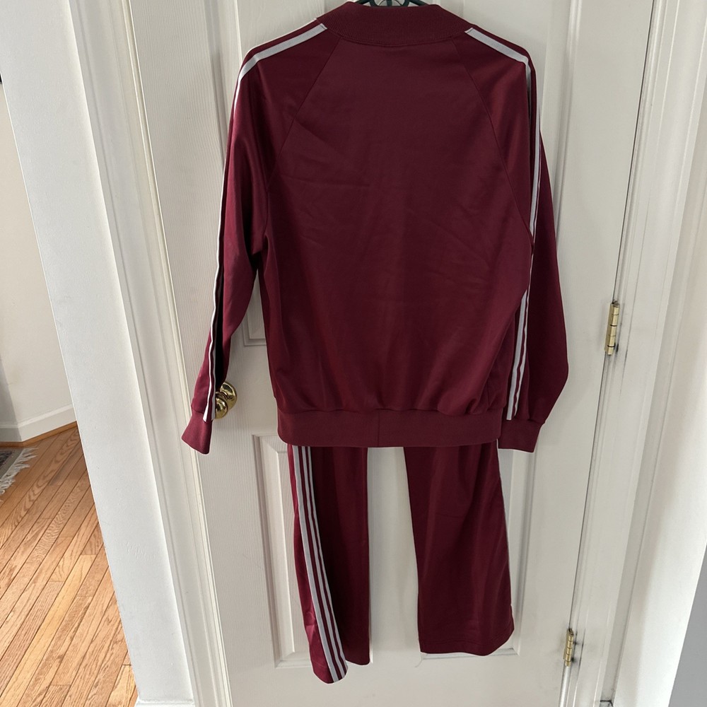 The Adidas Men's Track Suit from the 1980s is a vintage two-piece activewear set in a burgundy color. Made of 50% polyester and 50% Arnel Triacetate, this track suit features a closed neckline, long sleeves, and a zip closure for easy wear. The regular fit and logo accents give it a classic look, perfect for summer, fall, or spring seasons. Machine washable for easy garment care, this retro track suit is a stylish addition to any man's wardrobe.
