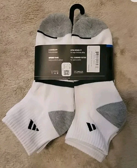 Adidas Men's cushioned 3 stripes Quarter Socks 6 Pair White/Black/Gray Size 6-12. Condition is New with tags. Shipped with USPS Ground Advantage.