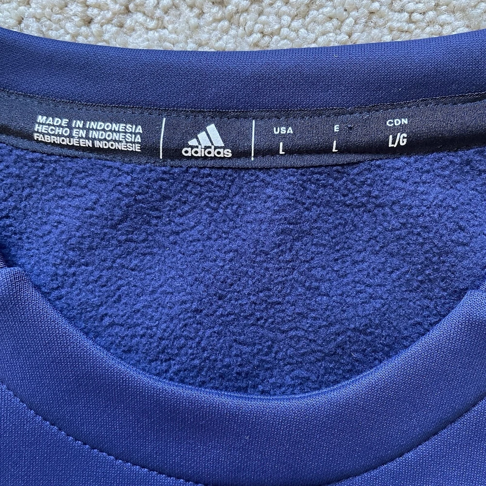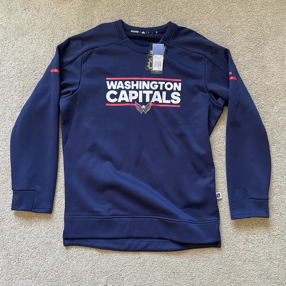 Step up your game day attire with the Adidas NHL Washington Capitals Long Sleeve Player Crewneck in a striking navy blue. Designed for the ultimate Capitals fan, this crewneck is both comfortable and stylish, featuring the team's colors and logo for a look that shows your support for the squad. The size large fits true to size, ensuring a great fit for your game day ensemble or casual outings. Officially licensed by the NHL, this sweatshirt signifies your allegiance to the Washington Capitals during the regular season and beyond. Crafted with quality materials, it's a staple for any hockey enthusiast looking to rep their team with confidence. Whether you're at the arena or enjoying the game from home, this Adidas crewneck is a perfect addition to your collection. MSRP $90