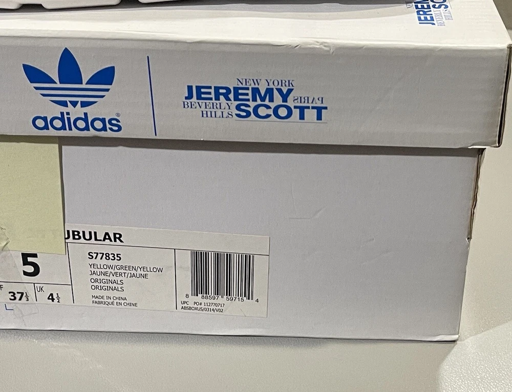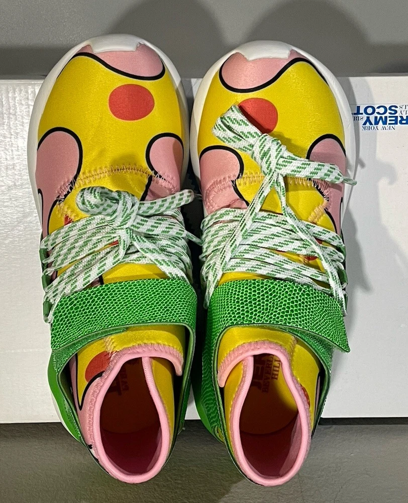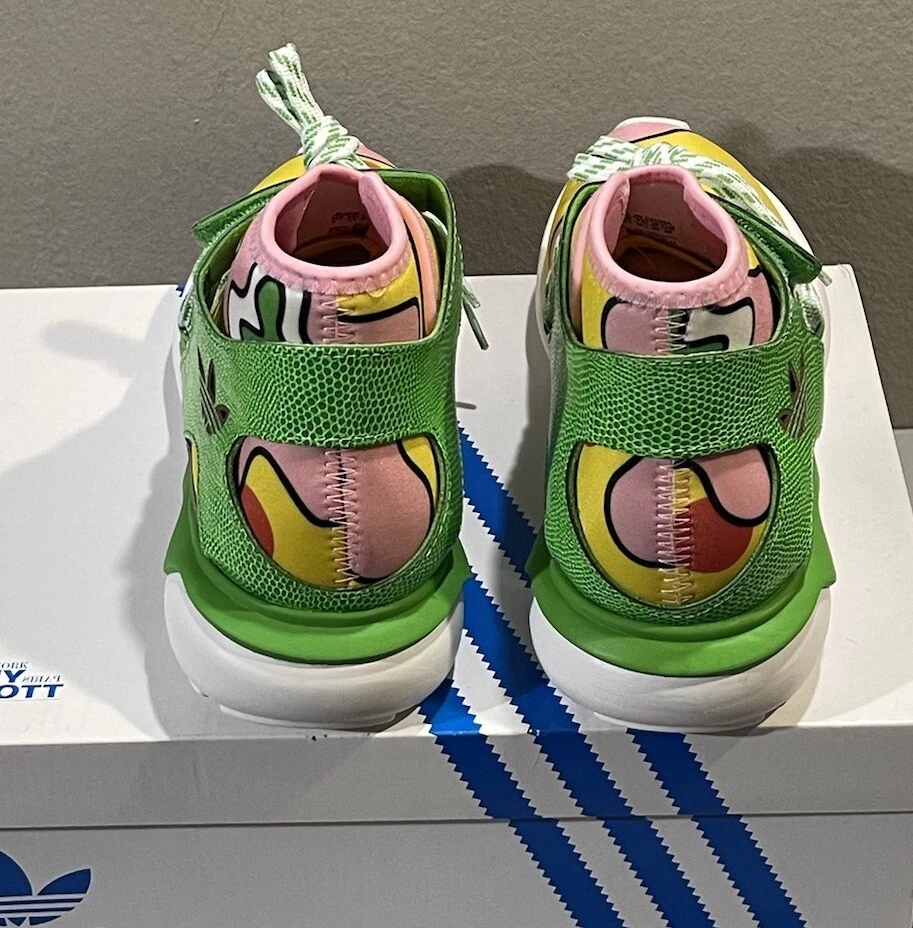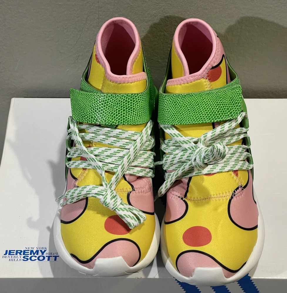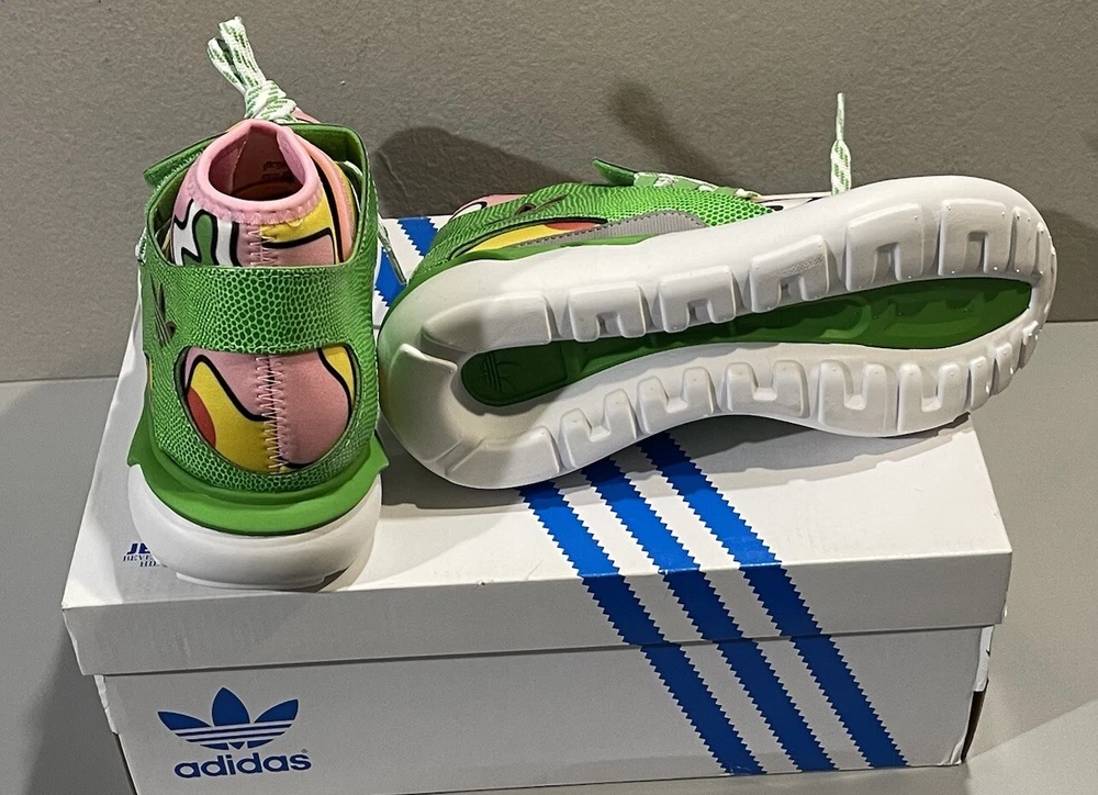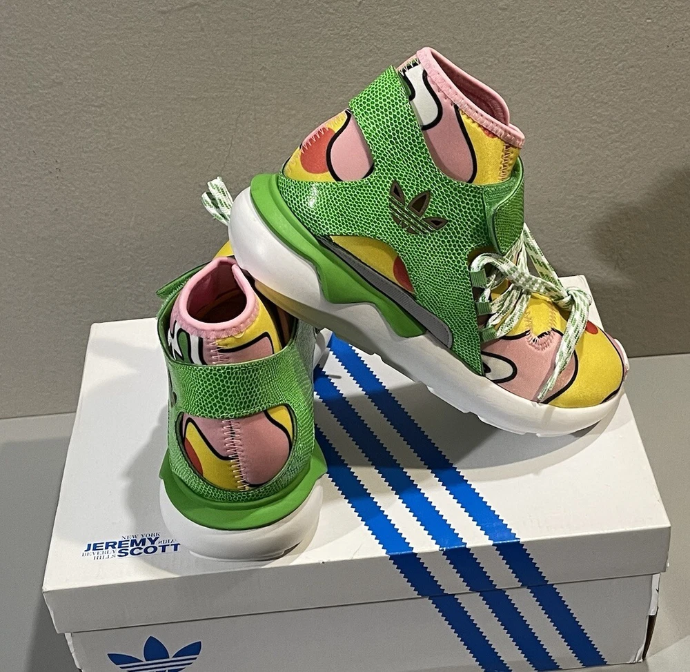 Elevate your sneaker game with the Adidas Originals Jeremy Scott JS Tubular in size 5. These athletic sneakers feature a multicolor design with hits of neon green on the heel, signature three stripes, and a green leather strap on the upper canvas. The variation of colorways and textured accents, including snakeskin on the ankle strap and an allover floral print on the neoprene lining, make these shoes a standout addition to any wardrobe. With a mid-cut and lace-up closure, these sneakers are perfect for casual occasions and cross-training activities, including crossfit, skateboarding, basketball, running, and jogging. The Adidas x Jeremy Scott JS Tubular is a limited edition collectible version from the Fw15 Collection and features the Adidas brand logo detail. Don't miss out on this unique and stylish pair of sneakers.