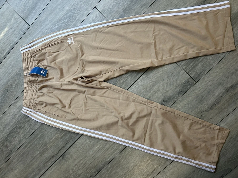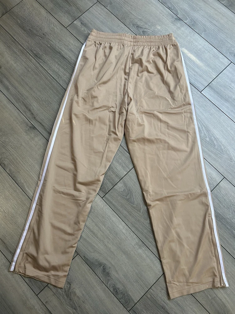 The Adidas Originals Track Pants in size Medium are made of 100% recycled polyester tricot fabric in a stylish tan color with a striped pattern. These jogger-style pants feature a drawstring closure, front zip pockets, and a drawcord on the elastic waist for a comfortable fit. The pants belong to the Adidas Firebird product line and are suitable for various occasions including travel, parties, casual outings, and workwear. Designed for men, these track pants have a regular fit and a straight leg style, making them ideal for activities like gym training, soccer, and running. NEW with TAGS . Pet&smoke free home. I have size medium & Large.