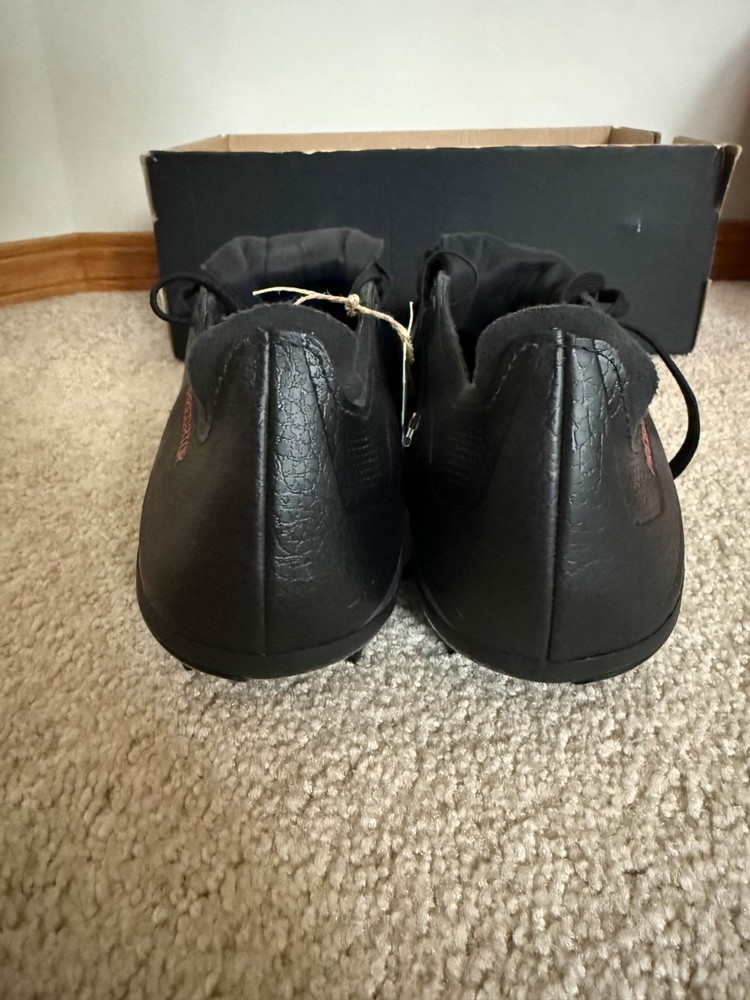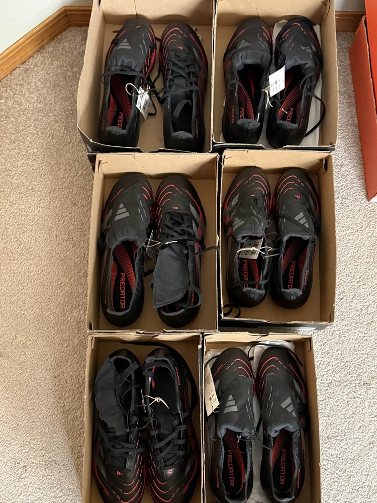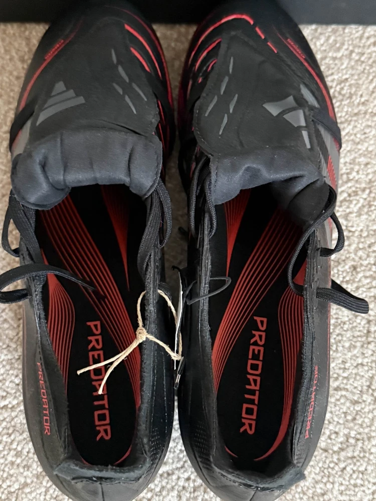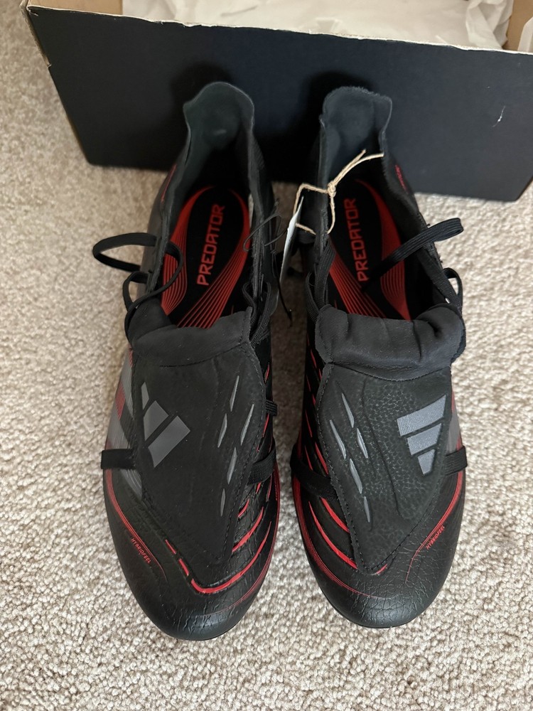 The Adidas Predator League FT FG/MG Men's Black Red Soccer Cleats are a new pick-your-size option for soccer players. These cleats feature a classic black and red color scheme, with the Adidas Predator League FT Fold Over Tongue Stealth Victory Pack design. Made with materials sourced from Indonesia, these cleats are specifically designed for men who play soccer. The Adidas brand ensures quality and performance on the field, making these cleats a reliable choice for any soccer enthusiast. We have many different sizes from size 7 Mens to size 12 Mens. The boxes do not have lids and may be in varying condition. All shoes are brand new with no wear.