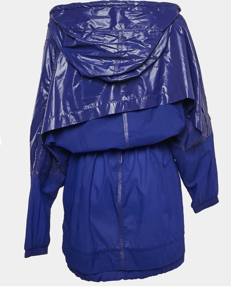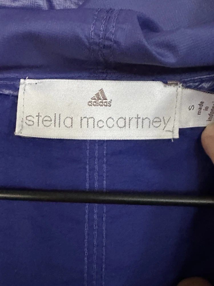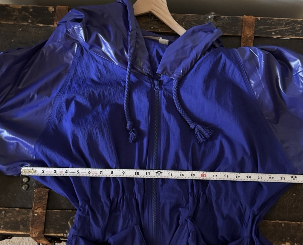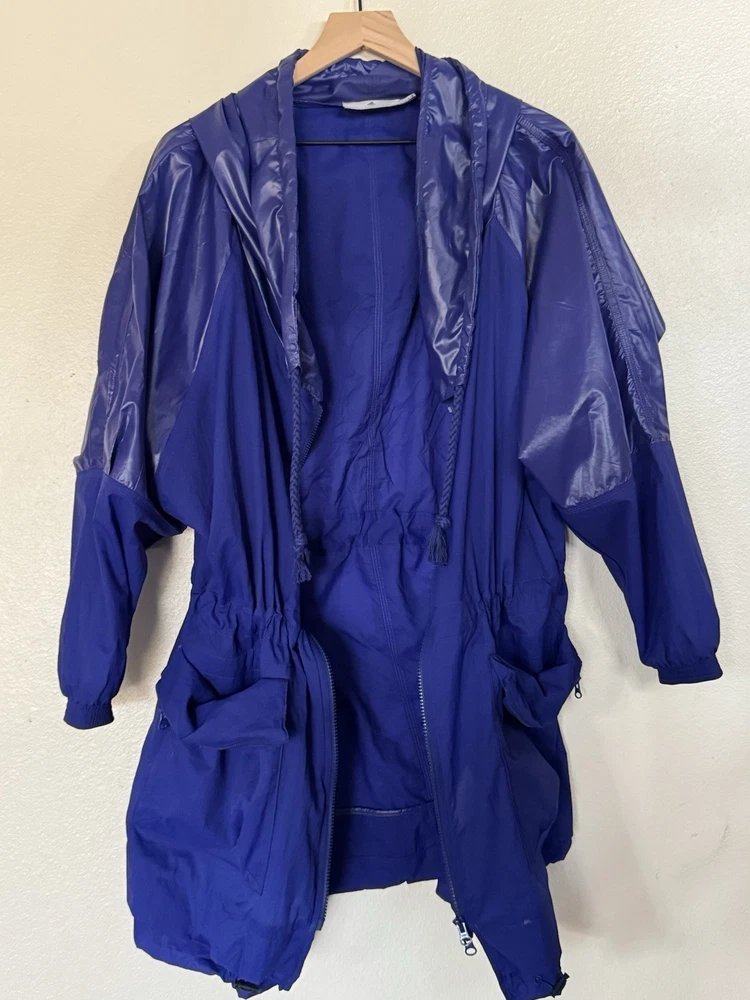 Super cool cinched waist windbreaker jacket with hoodie by adidas x Stella McCartney. It is a size Small but it is an oversized jacket. See pictures for measurements.