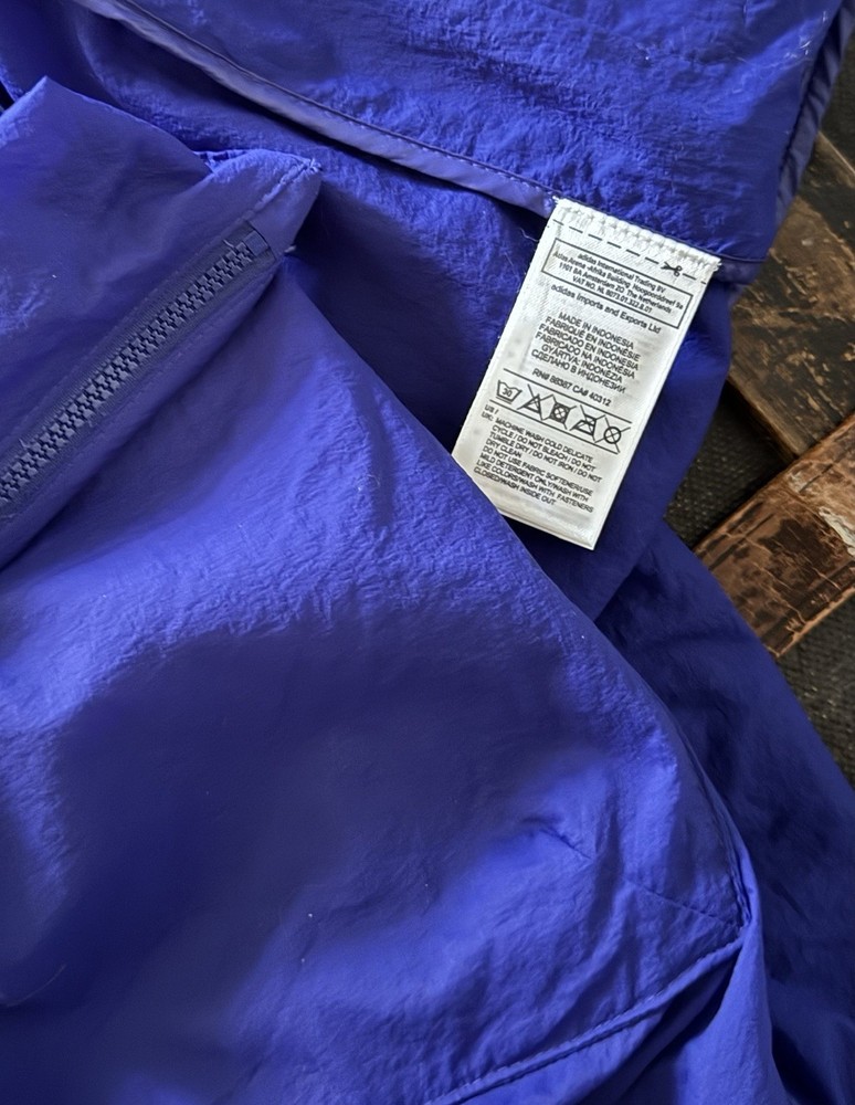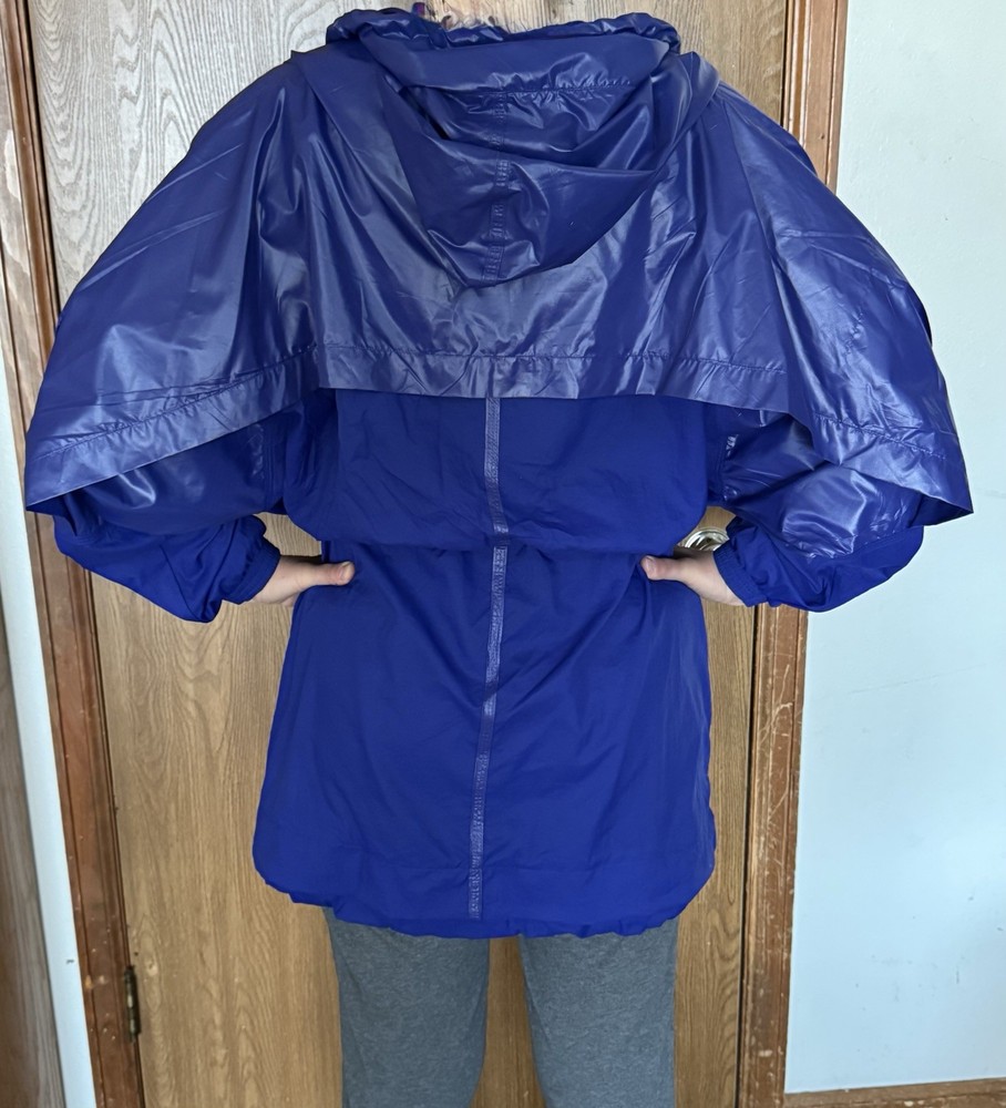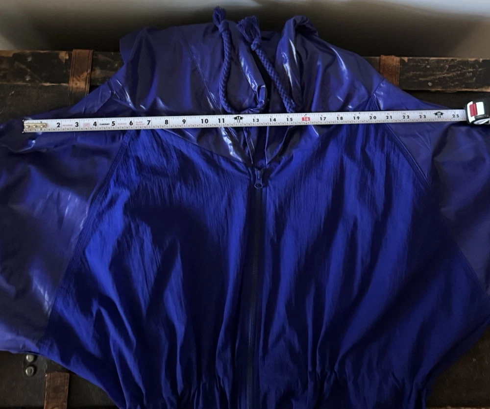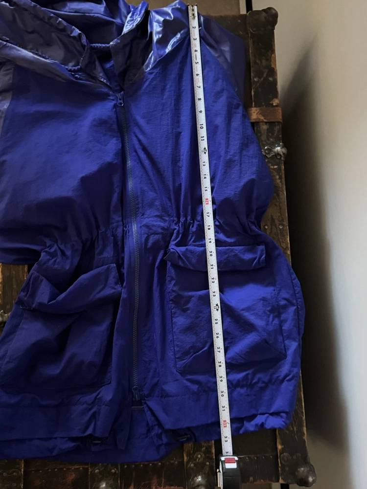 Super cool cinched waist windbreaker jacket with hoodie by adidas x Stella McCartney. It is a size Small but it is an oversized jacket. See pictures for measurements.