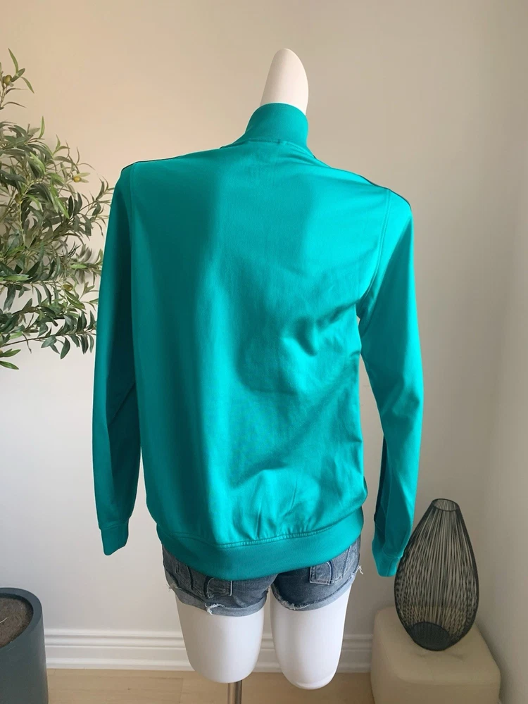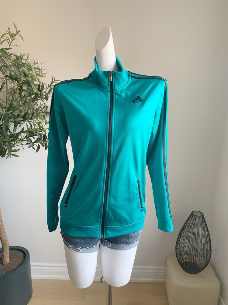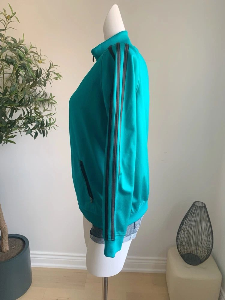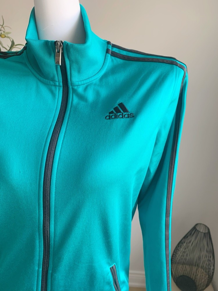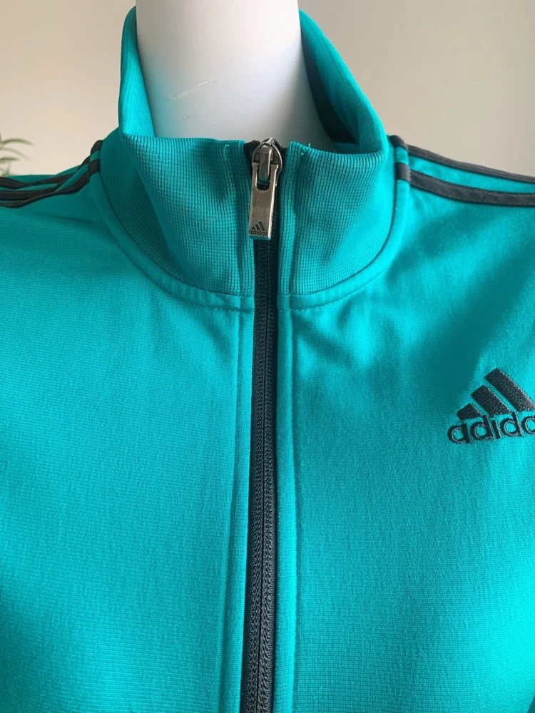 Size: L (fits M–L) Measurements (cm): Shoulder: 39 Bust: 104 Length: 63 Classic Adidas zip-up track jacket in a vibrant teal (turquoise) color. Features a high neck design with signature stripe detailing along the sleeves, giving a clean sporty look. Made of smooth polyester fabric with a slight stretch, comfortable and easy to wear. Full zip closure with side pockets. Condition is excellent with no noticeable stains, damage, or heavy wear. Perfect for casual, athleisure, or everyday sporty styling. Please compare measurements as sizing may vary. Fit is subjective and no returns for fit issues.