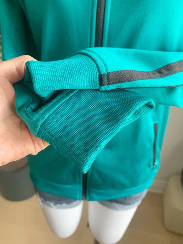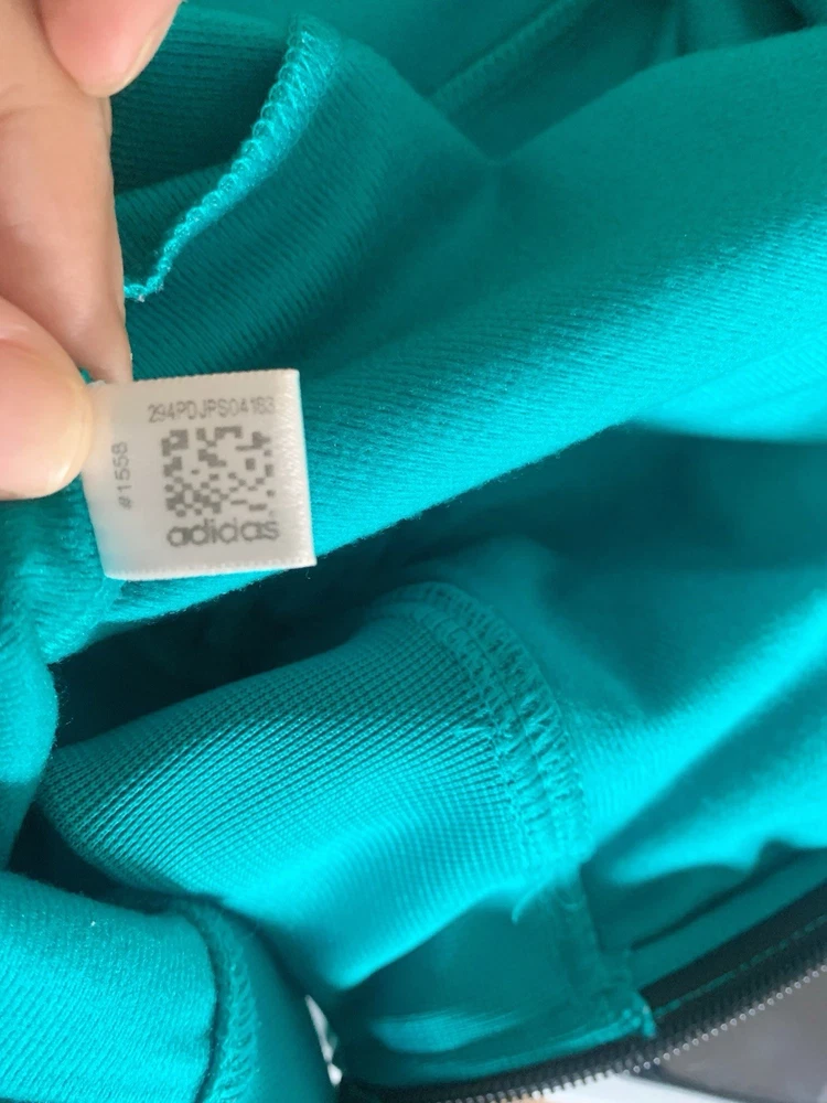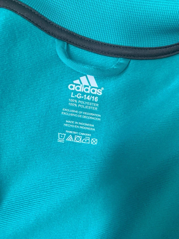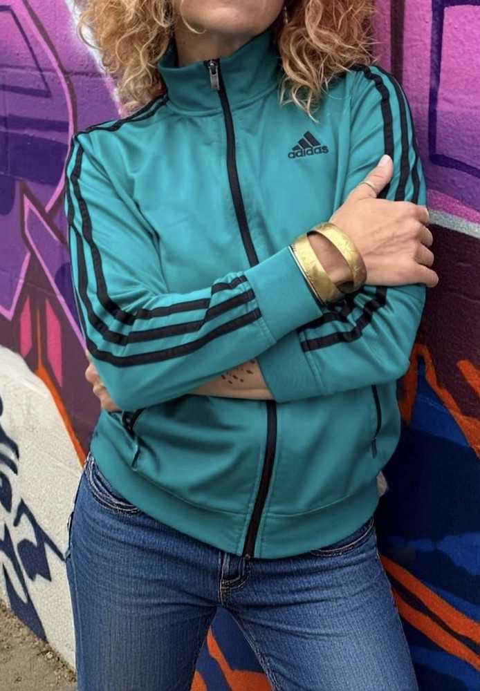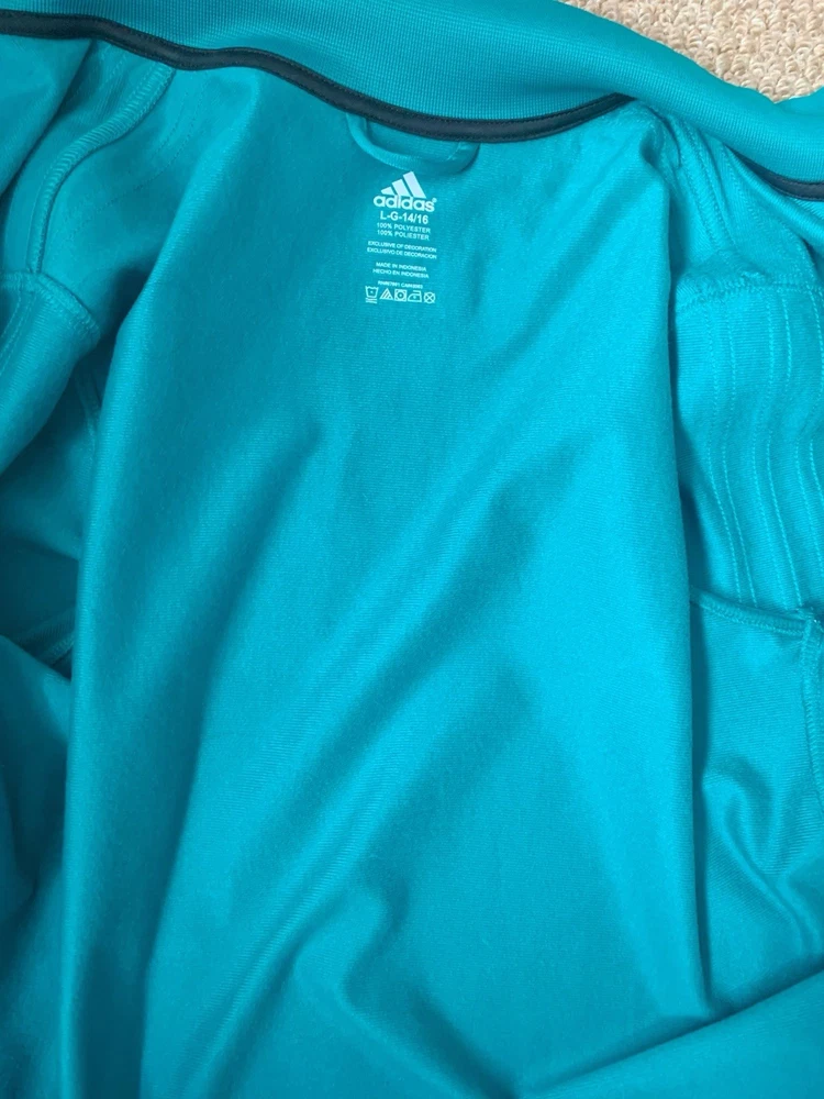 Size: L (fits M–L) Measurements (cm): Shoulder: 39 Bust: 104 Length: 63 Classic Adidas zip-up track jacket in a vibrant teal (turquoise) color. Features a high neck design with signature stripe detailing along the sleeves, giving a clean sporty look. Made of smooth polyester fabric with a slight stretch, comfortable and easy to wear. Full zip closure with side pockets. Condition is excellent with no noticeable stains, damage, or heavy wear. Perfect for casual, athleisure, or everyday sporty styling. Please compare measurements as sizing may vary. Fit is subjective and no returns for fit issues.