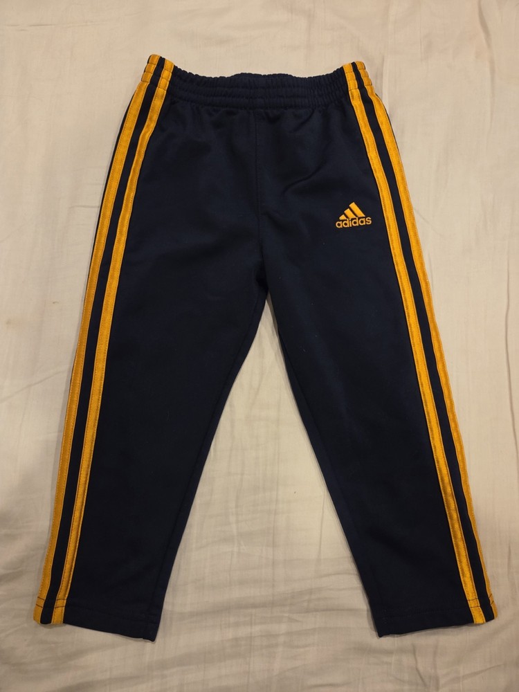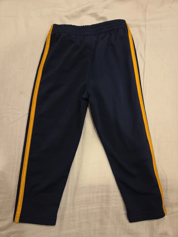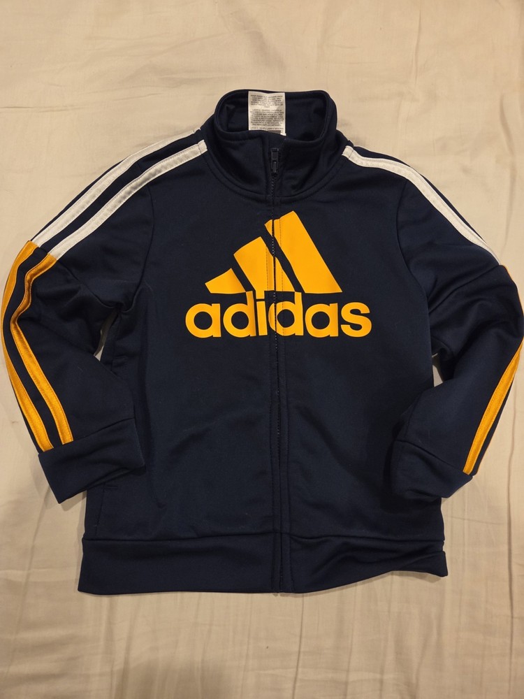 This authentic Adidas 2-piece tracksuit includes a full-zip track jacket and matching elastic-waist joggers in a striking navy and yellow colorway. Made from durable, classic tricot fabric with the iconic three-stripe branding, this set offers a comfortable, athletic fit for active toddlers. In New Without Tags (NWOT) condition, it shows no signs of wear and is perfect for sports, daycare, or casual daily wear.