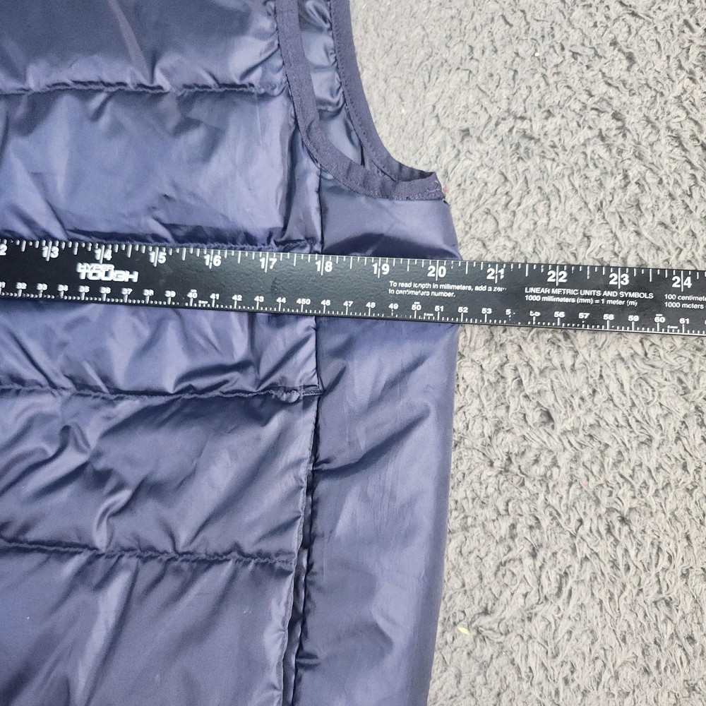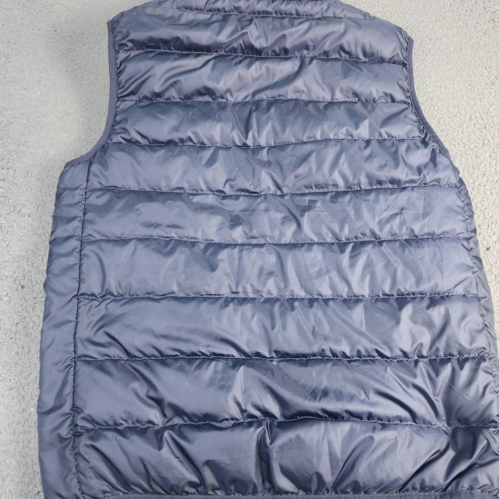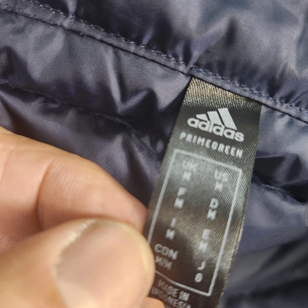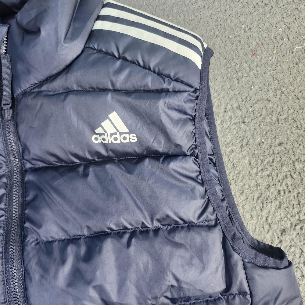 Brand: adidas. Style: Mens insulated puffer vest with stand-up collar and horizontal quilted baffles. Color: Dark navy blue with contrast white 3-Stripes at the shoulders and white adidas chest logo. Size: Mens Medium (interior size tag lists M with multi-country size equivalents). Material: Polyester shell, polyester lining, and polyester insulation as indicated on the interior care label. Country of origin: Made in Indonesia. Design details: Full-length front zipper closure, sleeveless armholes with knit binding, and horizontal quilting throughout the body for added warmth. Branding and accents: adidas performance logo printed at the left chest, three-stripe shoulder detail, and Primegreen branding on the interior neck label. Features and use: Lightweight padded sport vest with two front on-seam hand pockets and a regular fit, ideal for training, casual wear, travel, or layering in cooler fall and winter weather. Tag details: Interior labels reference adidas Primegreen construction and provide fabric content and care instructions.