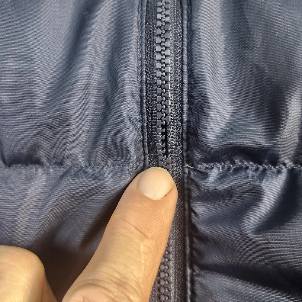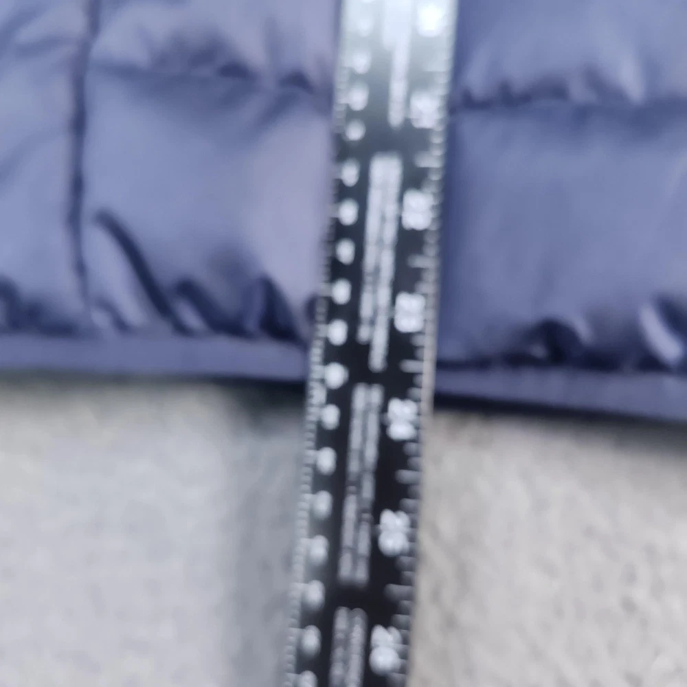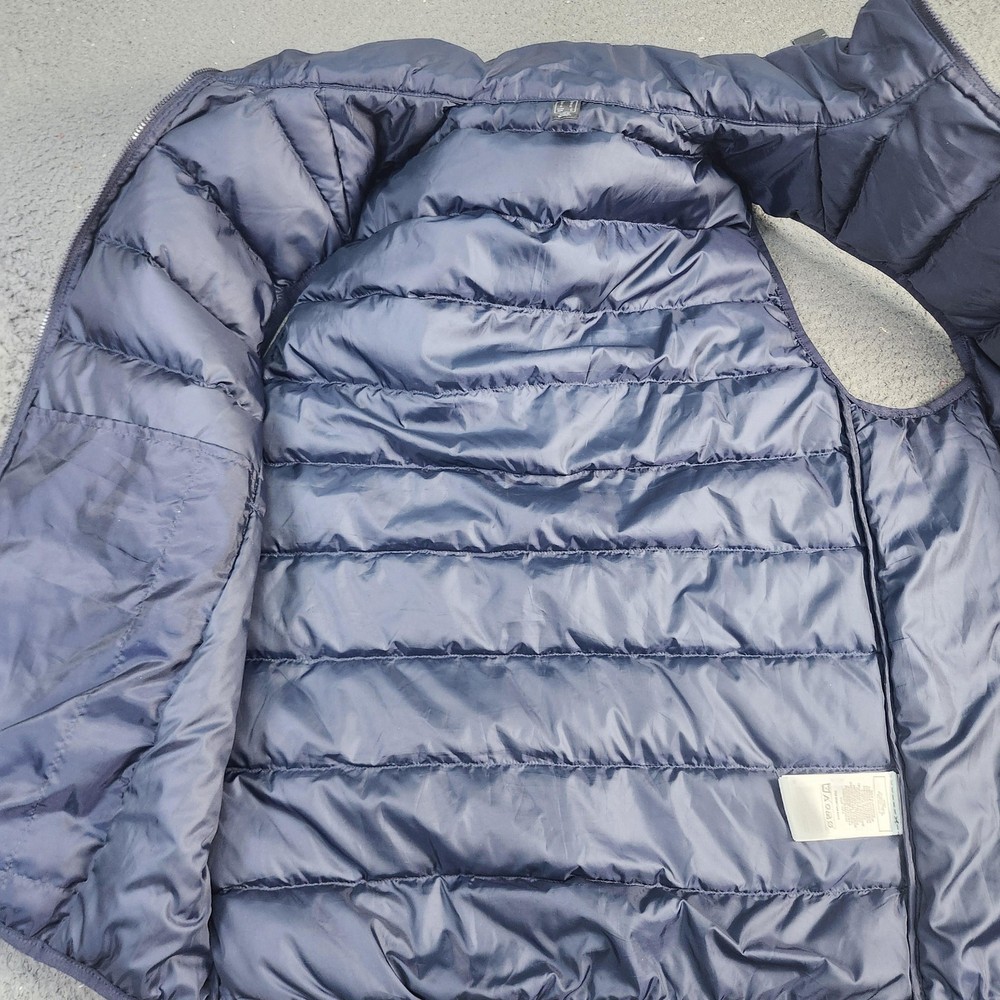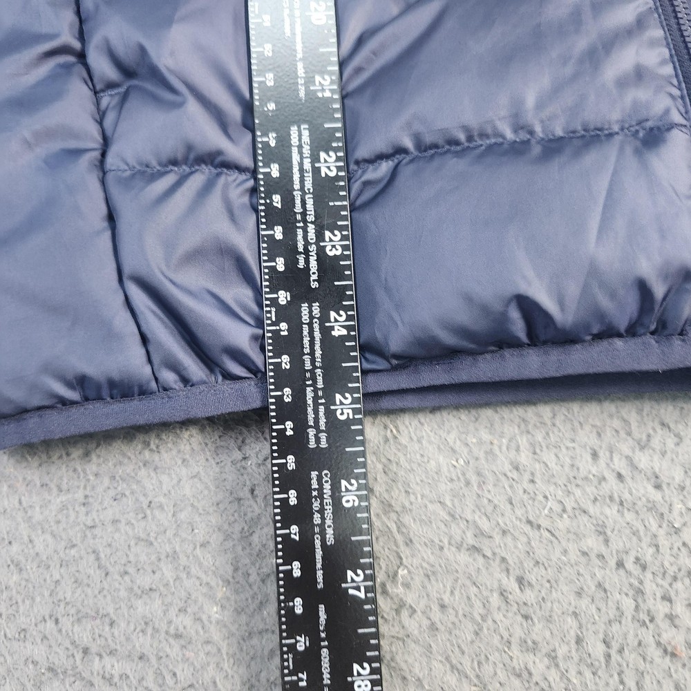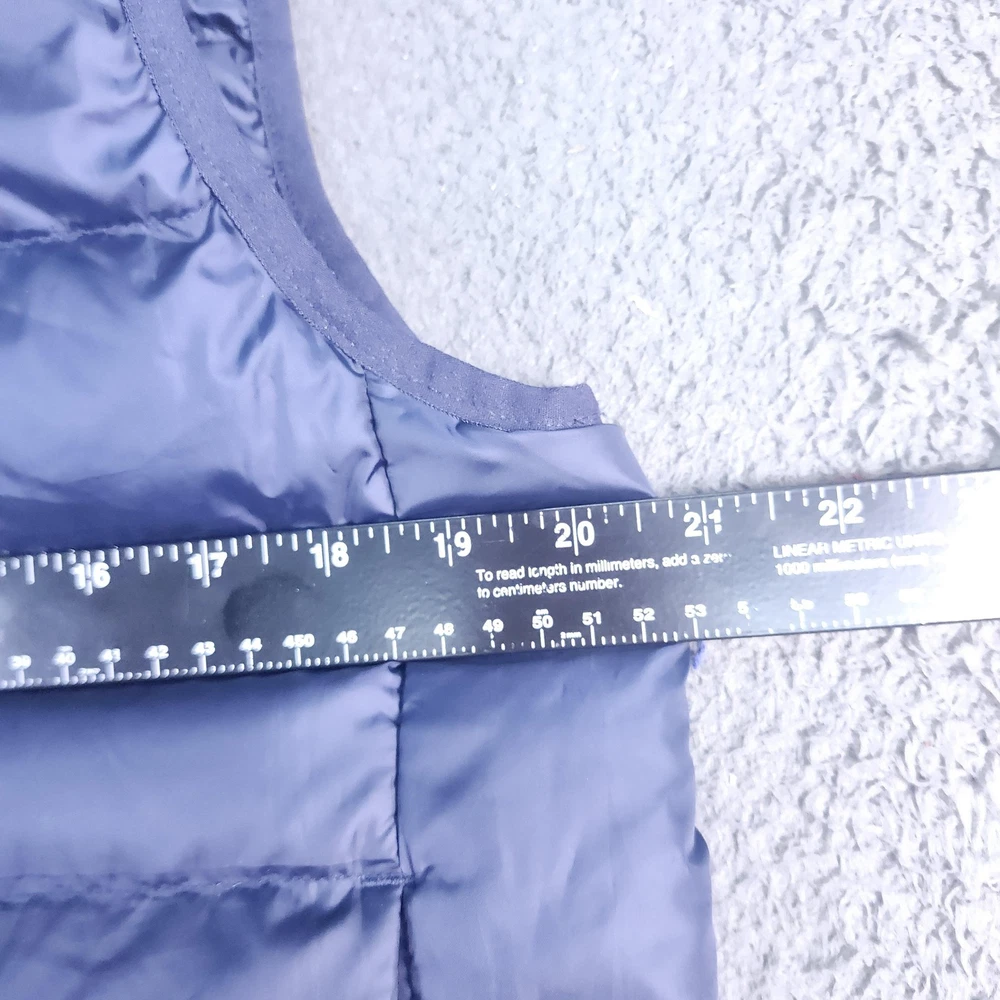 Brand: adidas. Style: Mens insulated puffer vest with stand-up collar and horizontal quilted baffles. Color: Dark navy blue with contrast white 3-Stripes at the shoulders and white adidas chest logo. Size: Mens Medium (interior size tag lists M with multi-country size equivalents). Material: Polyester shell, polyester lining, and polyester insulation as indicated on the interior care label. Country of origin: Made in Indonesia. Design details: Full-length front zipper closure, sleeveless armholes with knit binding, and horizontal quilting throughout the body for added warmth. Branding and accents: adidas performance logo printed at the left chest, three-stripe shoulder detail, and Primegreen branding on the interior neck label. Features and use: Lightweight padded sport vest with two front on-seam hand pockets and a regular fit, ideal for training, casual wear, travel, or layering in cooler fall and winter weather. Tag details: Interior labels reference adidas Primegreen construction and provide fabric content and care instructions.