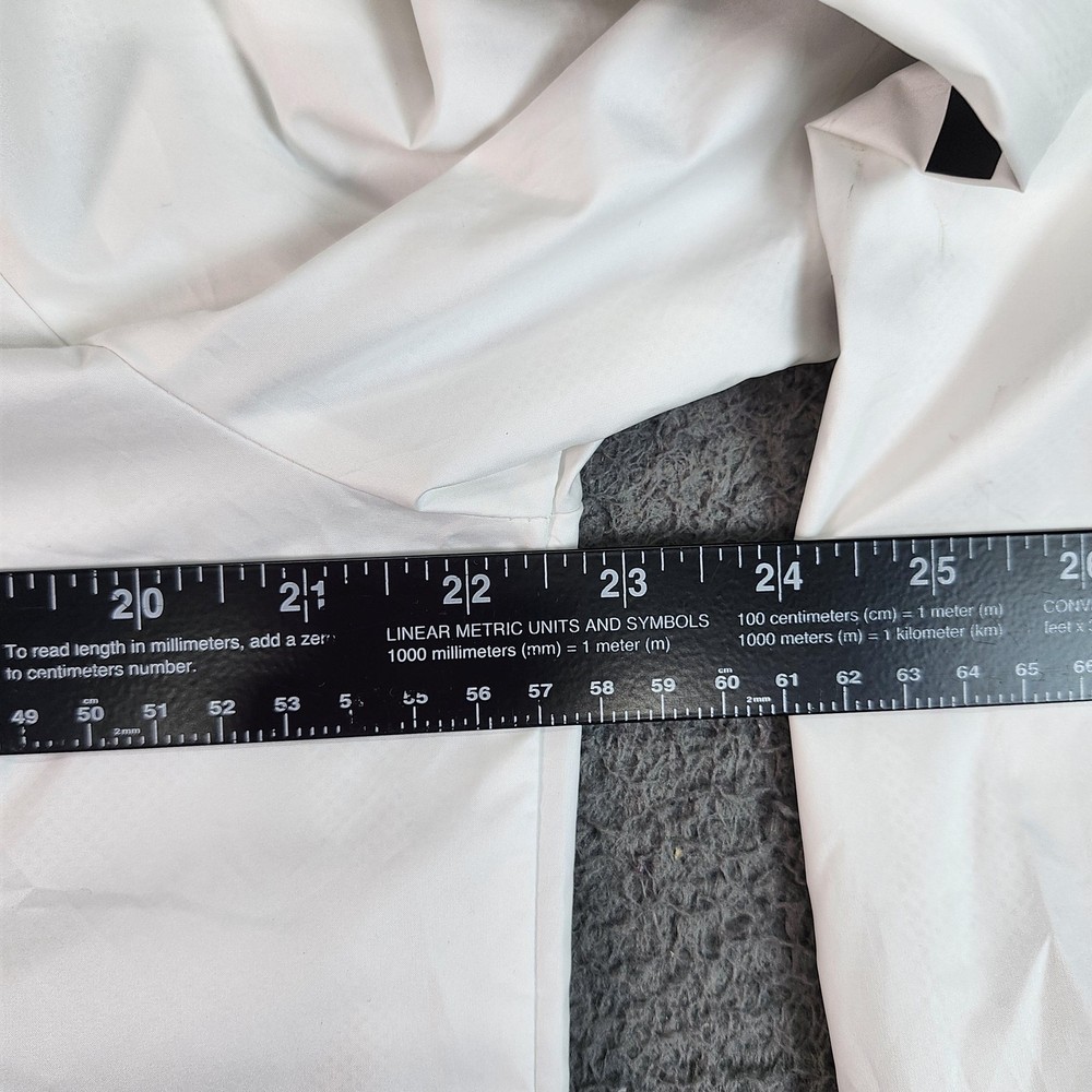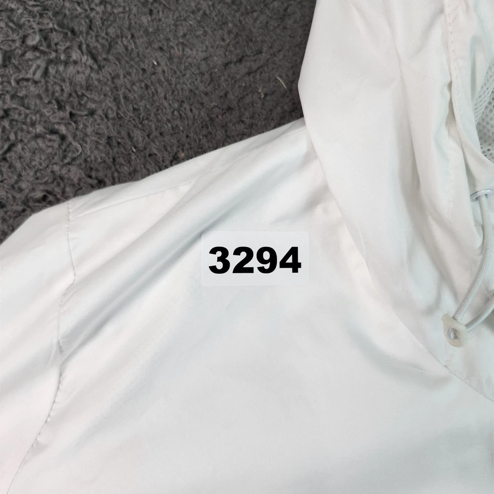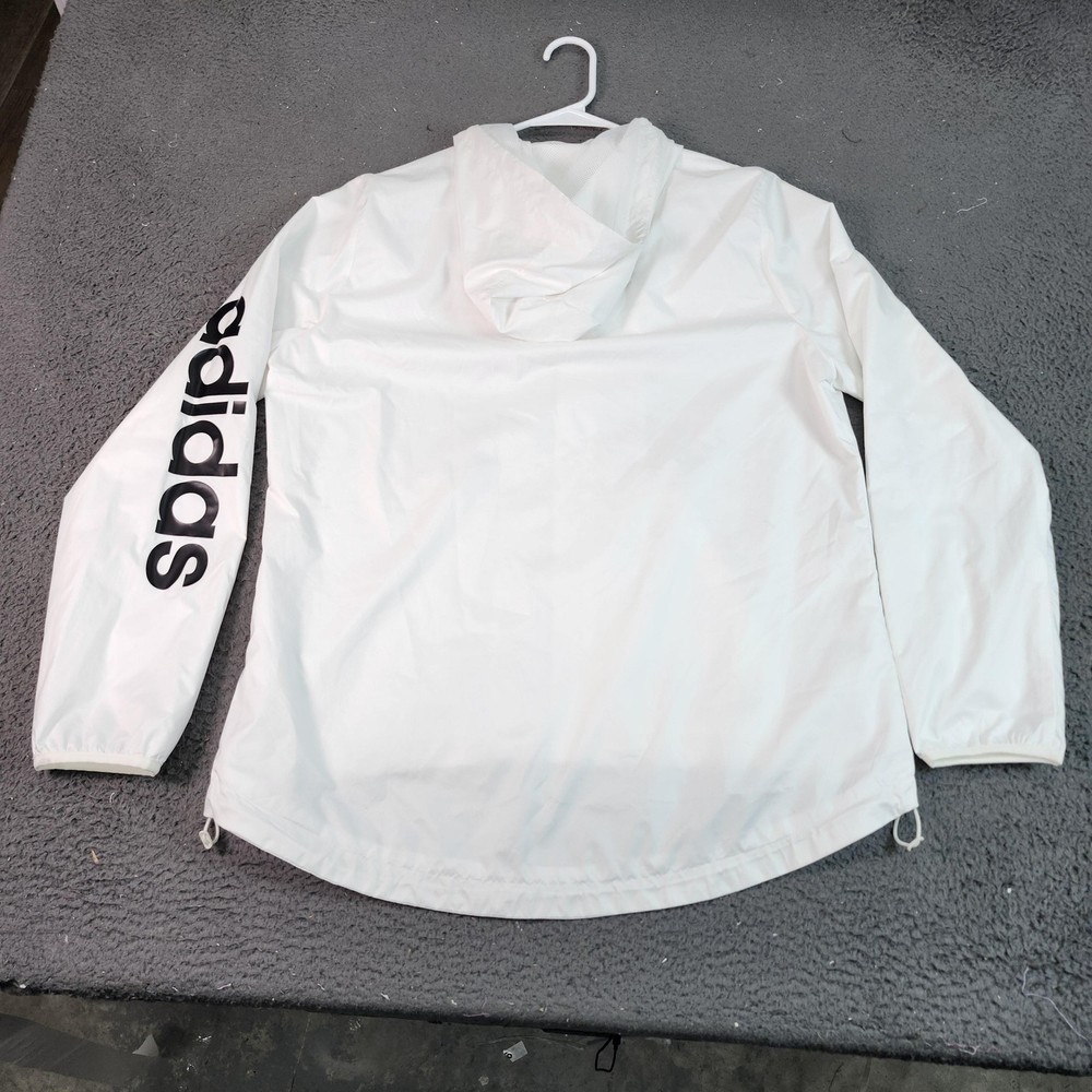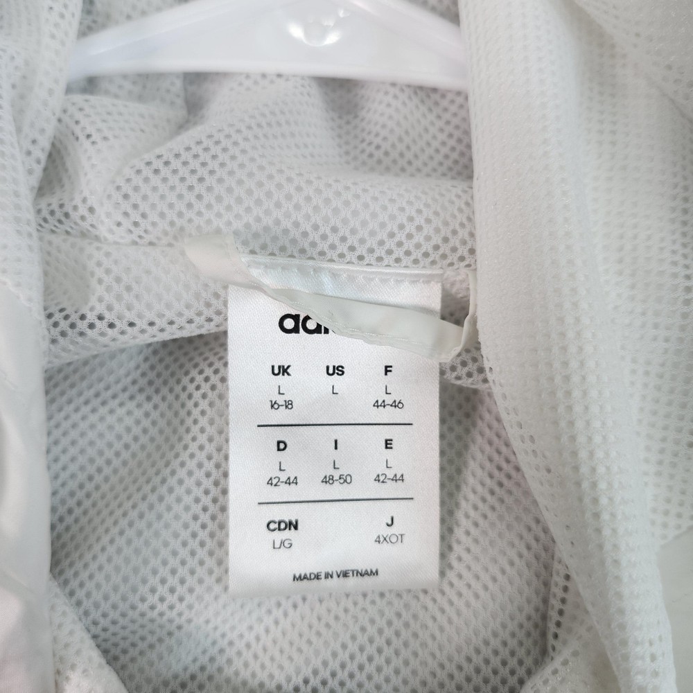 Brand: adidas Style: Womens lightweight windbreaker jacket with full zip front and attached hood. Color: Solid white shell with contrasting black adidas logo text printed down one sleeve. Size: Womens Large (L); tag lists US L, UK L 16-18, EU/F L 44-46, and CDN L/G. Materials: Lightweight polyester outer shell with breathable polyester mesh lining; made in Vietnam. Design details: Attached three-panel hood with drawcord, stand collar, curved drop-tail hem with mesh vent panel, long sleeves with elastic cuffs, and a streamlined athletic silhouette. Features: Full front zipper closure, two front zip hand pockets, adjustable drawcord hem at both sides, fully lined interior, and wind-resistant construction ideal for running, walking, gym training, and everyday casual activewear. Flaws: Previously worn with light overall wear and some wrinkling from storage; fabric, lining, zipper, drawcords, and sleeve print are clean and intact with no stains, holes, or tears.