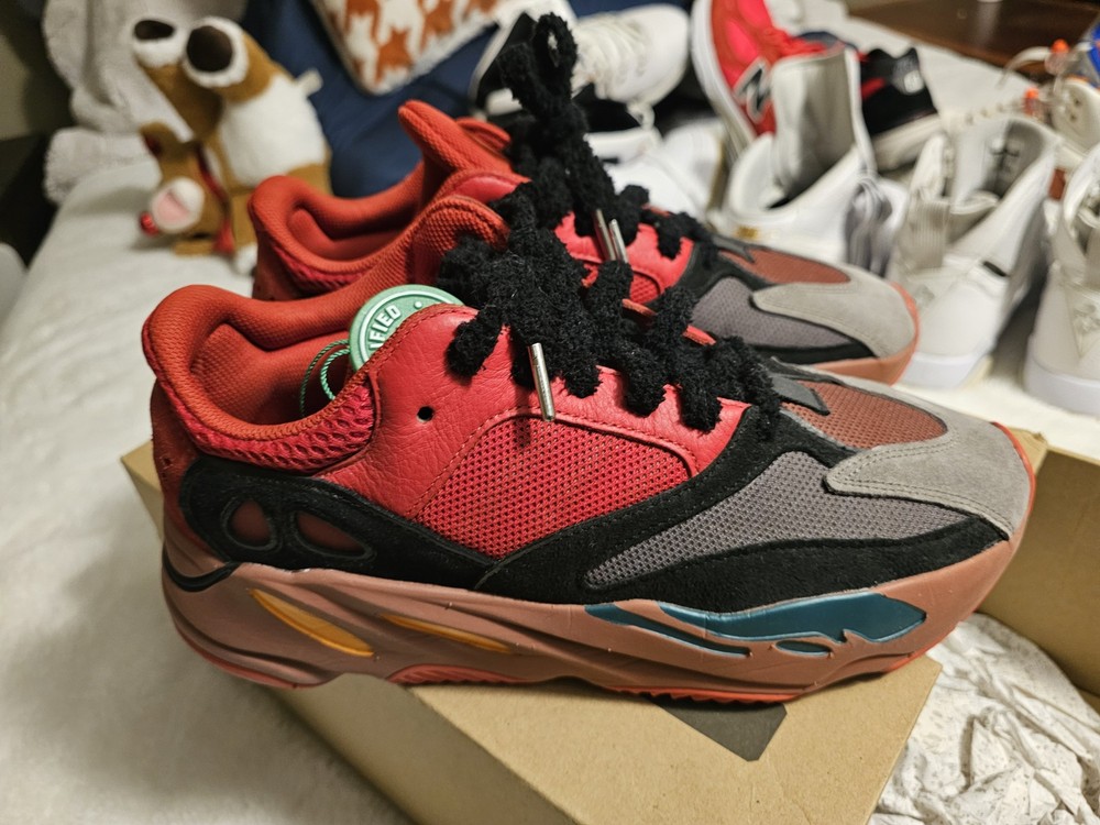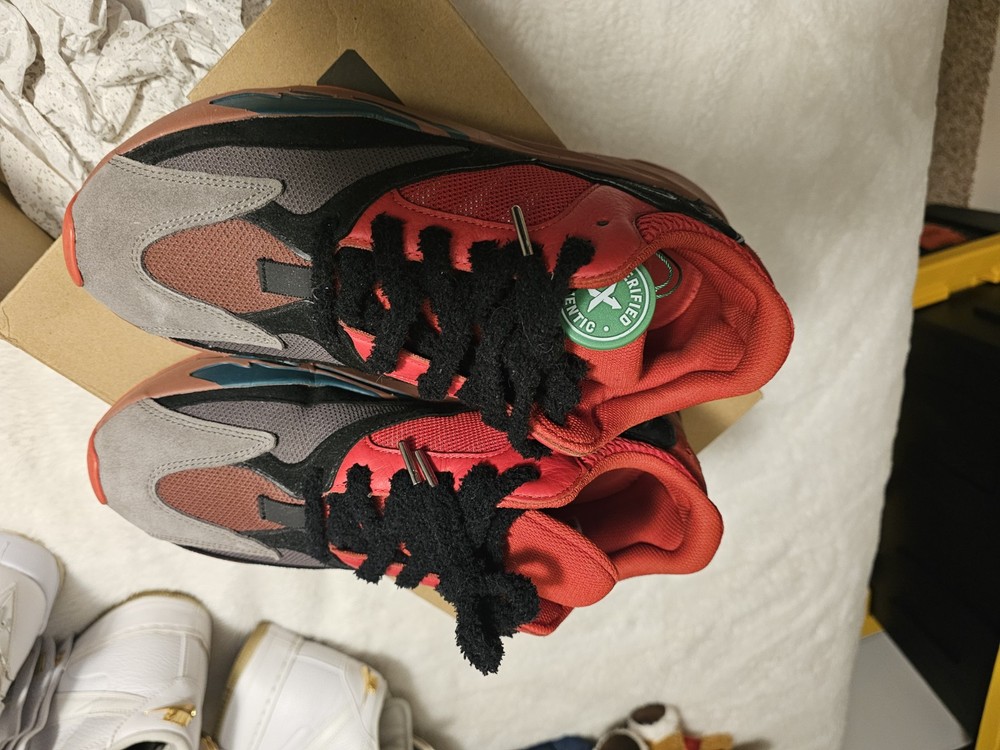 Elevate your style with the Adidas Yeezy Boost 700 in Hi-Resolution Red, a striking addition to any sneaker collection. The bold red suede upper catches the eye, complemented by the distinctive Yeezy silhouette that's become a hallmark of modern sneaker design. A true statement piece, these sneakers are designed for those who appreciate both form and function. Crafted for comfort and durability, the shoes feature the advanced cushioning of Boost technology, ensuring a comfortable experience with every step. The high-top design provides ankle support, making these sneakers not only stylish but also suited for a variety of activities. With their release in 2022, the Yeezy Boost 700 in Hi-Res Red are a contemporary choice for any fashion-forward individual. amazing shape.. not original laces