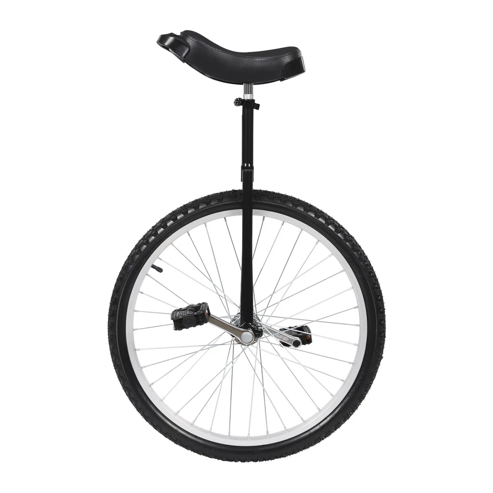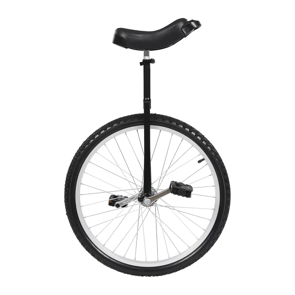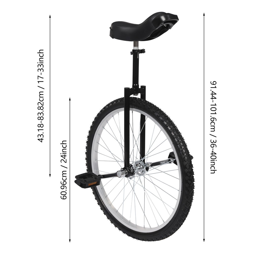 Description This 24-inch unicycle will provide you with a unique fitness experience, enhancing your physical fitness while improving your riding balance. The grips on the front and back of the seat and the lightweight body make it easy to carry, allowing you to maneuver through crowded city streets or on park trails, bringing you a different travel experience. It is not only a transportation tool but also a partner to show your own style and challenging spirit. Key Features Strong and Durable: The high-quality plastic, manganese steel, and aluminum alloy are corrosion-resistant , deformation-resistant , and rust-resistant , ensuring a stable and reliable riding experience. Adjustable Design: The clamp on the seat post allows you to easily adjust the product's height from 36 to 40in, making this product suitable for people of different heights (more than 5.74ft). Stable Riding: The tire with protruding points and non-slip pedals can enhance friction, effectively increasing stability and safety while riding. Strong Load Bearing: The aluminum alloy rim and manganese steel frame provide the product with a sturdy structure to withstand 154 lbs so that you can use it with more confidence. Comfortable Riding Experience: The soft seat cushion with a curved shape adopts an ergonomic design to fit your buttocks and bring you a comfortable riding experience. Thoughtful Design: You can grab the handles at the front and rear of the seat to ensure good stability during the riding process. Clean with Ease: Its smooth surface and simple structure allow you to easily clean the product with a damp cloth (not included). Keep Health: Practicing riding the unicycle will give you a stronger workout, improve your feeling of balance, promote cerebellar development, drive brain development, enhance cardiopulmonary circulation, and keep you fit. Ideal Gift: Its stylish appearance and practical function make it an ideal birthday and Christmas gift for your friends, families, and colleagues. Guaranteed Customer Service: We aim to provide quality products and services. If you have problems, please feel free to contact us. We will reply and solve the problem for you as soon as possible. Details Knurled Seatpost: The seatpost features spiral knurling technology, which prevents the seatpost from rotating erratically and provides excellent anti-slip performance. Bur-free Edges: They are smooth to the touch and can protect your hands from getting scratched. Application It is suitable for office workers, students, cycling enthusiasts, and other people for daily fitness exercise, cycling, balance training, talent performance, etc. Specification Color: Black Material: Manganese Steel, Aluminum Alloy, Plastic, Rubber Process: Painting Saddle Length: 23cm/9.06in Wheel Diameter: 60.96cm /24in Maximum Load Bearing Capacity: 70kg/154lbs Suitable Height: > 1.75m/5.74ft Height from Saddle to Pedals: 43.18-83.82cm/17-33in Product Height: 91.44-101.6cm/36-40in Seatpost Length: About 23cm/9.06in Suitable Age: 7-60 Years Old Mount Type: Free Standing Assembly Required: Yes Package Size: 57*18*60cm/22.44*7.09*23.62in Gross Weight: 5.4kg/11.9lbs Package Included 1* Unicycle Frame 1* Unicycle Saddle 1* Wheel 2* Pedals Other Accessories for Assembly Notes Please check the size carefully before ordering. The pedal must be tightened before riding. Please note that your legs should be almost straight when you sit on the unicycle and place one foot on the lowest position of the pedals. Please insert the frame to the appropriate depth for your height and then tighten it to ensure a safe ride. It is recommended to wear a helmet, wrist guards, and elbow pads (not included) to ensure safe riding. For safety reasons, novice riders should ride under the guidance or accompaniment of an instructor. It is better to choose an open, grassy, fenced area with firm and level dirt for training. Please allow the slight color difference caused by the shooting light and 1-3cm error due to manual measurement, and make sure you do not mind before ordering.