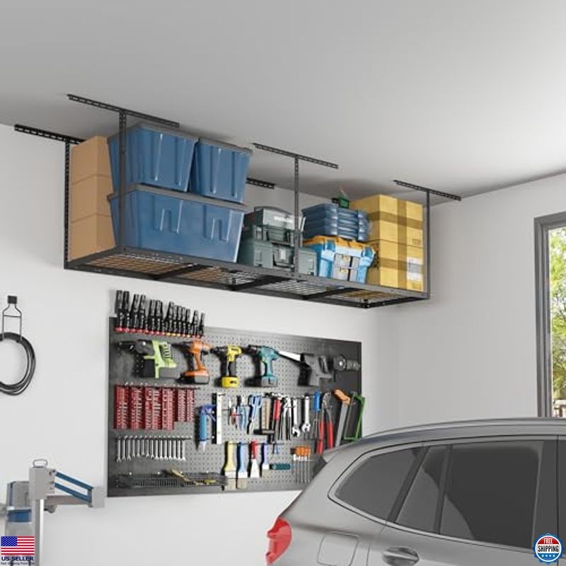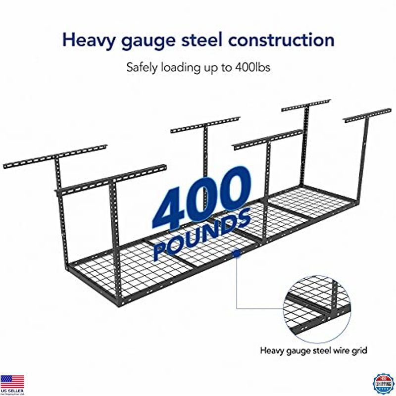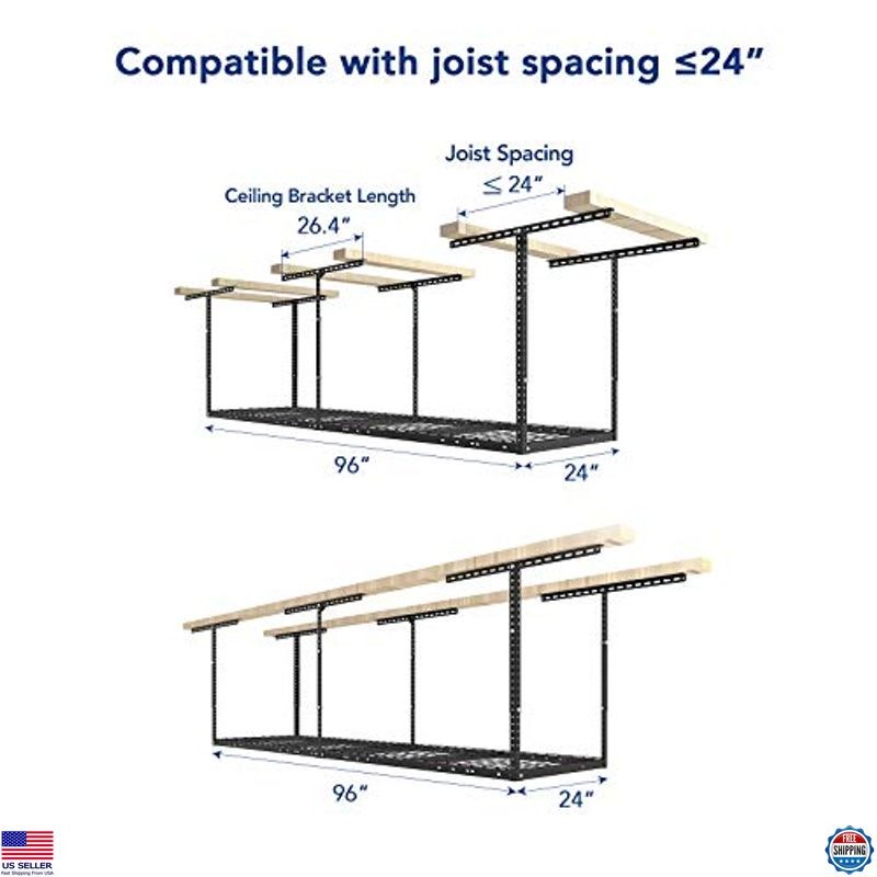 FLEXIMOUNTS 2x8 Garage Storage Rack, Adjustable Overhead Storage Organization System, Heavy Duty Metal Ceiling Rack, 400lbs Weight Capacity, Black Description Transform your garage into a well-organized space with FLEXIMOUNTS' innovative solutions. Designed for effortless installation and maximum efficiency, our products simplify your garage organization, making it easier than ever to manage your space. Experience the difference in clutter-free living and reclaim your garage today! Product reference: B091YRW9VW. Features RECLAIM YOUR GARAGE:Use garage ceiling space to store seasonal and unused items. 22'' to 40'' ceiling dropdown provides up to 52 cu. ft. of storage. Dimensions: 96 in. L x 24 in. W x 22-40 in. H.(Hooks sold separately) STABILITY AND SAFETY:With our specially designed longer ceiling brackets that attach to two joists, FLEXIMOUNTS overhead garage storage racks are more stable and secure compared to others! 800 lbs Tested, 400 lbs Rated: Our overhead garage storage rack undergoes rigorous double load testing (800 lbs) to ensure unmatched safety and durability, supporting up to 400 lbs for your tools and equipment. INTEGRATED GRID DESIGN:More stable and sturdy compared to others with separate frame and wire. DIY INSTALLATION:Installation template helps make plan. This overhead storage rack fits all ceiling joist spacing ≤ 24". IMPORTANT:Can NOT be mounted to metal wall. Suitable for wood studs/joists and concrete wall. Shipping Free & Fast Shipping: We offer free shipping to most of the USA with a normal delivery time of 3-7 days. However, due to the current situation, additional delivery time (up to 3 weeks) may be required for some items. Alternative Carriers: We may use alternative carriers (e.g., USPS, FedEx, UPS) to ensure your package arrives safely and on time. Due to the use of multiple carriers, we are unable to provide a tracking number automatically. Handling Time: Orders are processed and shipped within 1-2 business days of receiving cleared payment. Shipping Restrictions: Shipping to Alaska, Hawaii, Puerto Rico, Guam, and other US territories may incur shipping charges or delivery restrictions. Please contact us before ordering, or your order can be refunded/cancelled. State Restrictions: Certain items may not be shipped to California due to state regulations. Contact for Tracking Updates: If you require tracking updates or have any concerns about the delivery of your order, please feel free to contact us, and we will be happy to assist you. Return Policy 30-Day Hassle-Free Returns: If you are not completely satisfied with your purchase, you can return the item for free within 30 days of receiving it for a full refund or exchange. Easy Return Process: Contact us, and we will provide you with a prepaid return shipping label and detailed instructions. No Restocking Fee: There are no restocking fees for returns. However, the buyer is responsible for return shipping costs if the return is not due to a seller's error. Refund Processing: Refunds will be processed within 1 business day of receiving the returned item in its original condition. Payment We accept all major credit cards, PayPal, and Pay for your convenience. Your payment information is secure and encrypted to ensure a safe and seamless transaction. Please complete your payment within 3 days of purchase to avoid any delays in shipping. Feedback Your feedback is extremely important to us. We strive to provide the best products and customer service possible. If you are satisfied with your purchase, please take a moment to l...
