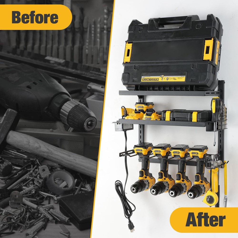 Power Tool Organizer with Adjustable Height 3-Tier Iron Tool Rack and Wall Mount Charging Station for Drill and Garage Workshop Durable Design: power tool organizer is crafted from high-quality iron with excellent welding craftsmanship, ensuring a robust connection between its components. This design allows it to withstand the weight of power tools without deformation or loosening, and the paint won't peel, guaranteeing reliable storage and support for your tools. Ingenious Adjustable Design: cordless tool rack features a 3-tier shelving system that offers flexible height adjustments. The top tier allows you to place the tool bases for convenient charging, ensuring your tools are always ready for use. The middle tier can accommodate toolboxes, other commonly used tools, or accessories, while the bottom tier can hold up to four electric tools. User-Friendly Features: tool organizer includes thoughtful features such as a dedicated power panel for easy tool charging, as well as a dedicated slot for drill bits and screwdrivers for quick access. The included curved hooks can be used to hang pliers, hammers, wrenches, and other tools and accessories, enhancing the efficiency and tidiness of your workspace. Easy Installation: We provide a straightforward and easy-to-follow installation guide, allowing you to complete the setup in just a few simple steps. No complex tools or professional skills are required, making it effortless for you to enjoy a more organized workspace. Versatile User Base: electric tool organizer caters to a diverse user base, including craftsmen, DIY enthusiasts, garage and workshop organizers, professionals in repair and construction industries, and homeowners with electric tools. It's a versatile solution for anyone seeking efficient and organized tool storage. Power Tool Organizer, Power Drill Tool Holder with Charging Board, Wall Mount Tool Storage Organizer, 3-Tier Adjustable Height Iron Tool Rack for Garage Organization and Workshop Shipping We offer FREE shipping on all orders! We ship within Three business days of payment, usually sooner. We use a selection of shipping services such as UPS, FedEx, USPS etc. We only ship to the lower 48 states, no APO/FPO addresses or PO Boxes allowed. Local pickups and combined shipping options are not provided at this time. Return You can return a product for up to 30 days from the date you purchased it. Any product you return must be in the same condition you received it and in the original packaging. Please keep the receipt. Payment We accept payment by any of the following methods: PayPal Please pay as soon as possible after winning an auction, as that will allow us to post your item to you sooner! Feedback Customer satisfaction is very important to us. If you have any problem with your order, please contact us and we will do our best to make you satisfied. Contact Us If you have any queries, please contact us via ebay. We usually respond within 24 hours on weekdays. Please visit our eBay store to check out other items for sale! Thank you for shopping at our store.