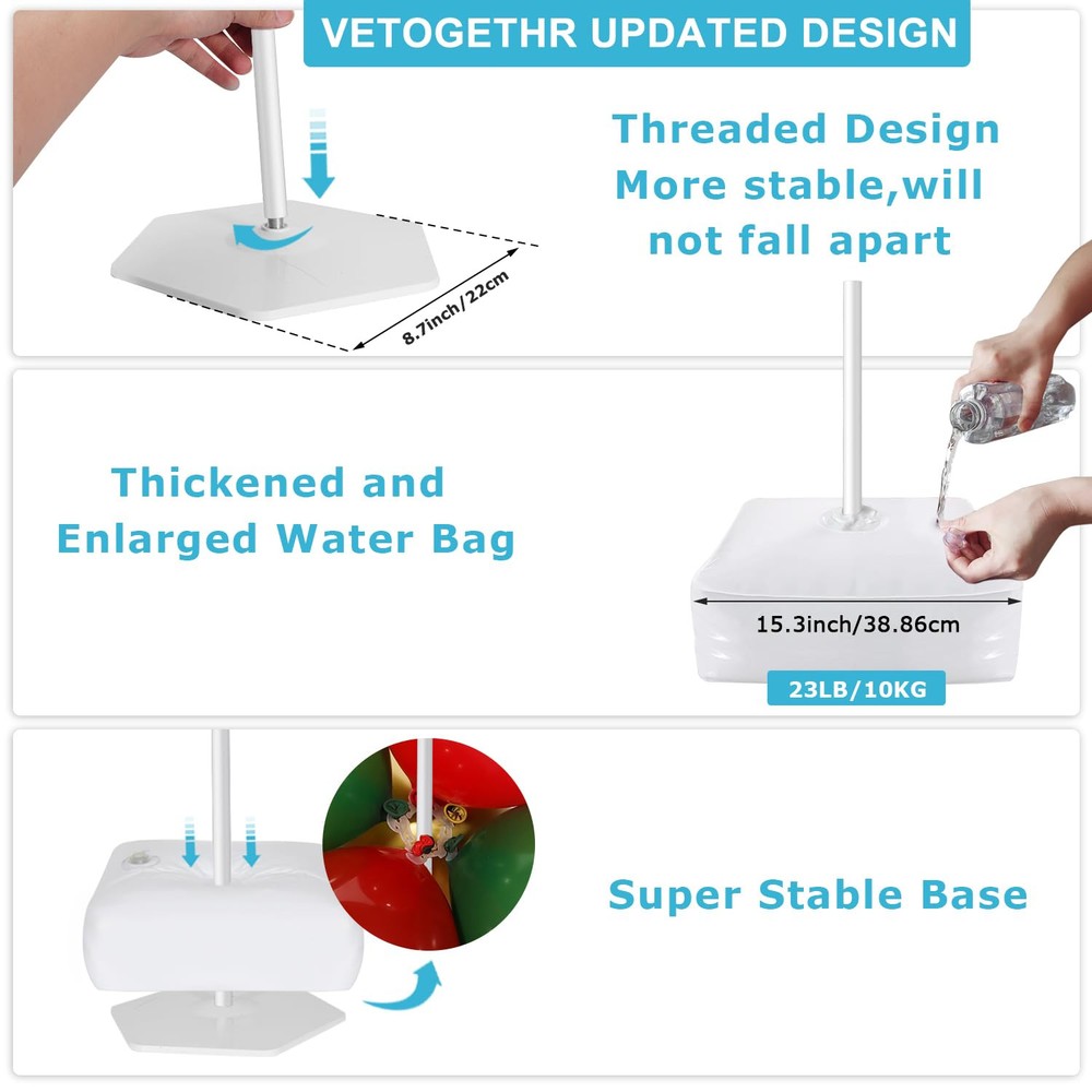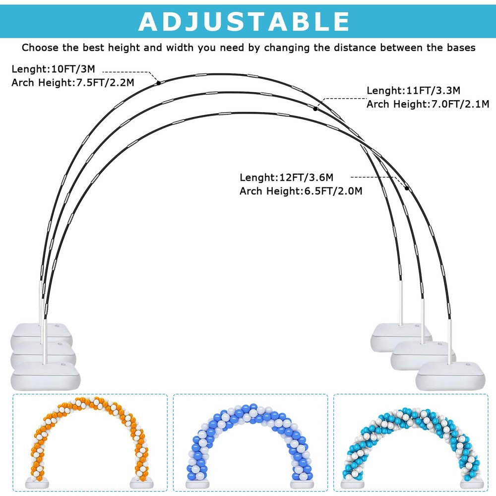 💖【Complete Balloon Arch Kit With Base】: Ballon arch holder kit package includes 15 folded glass fiber poles,2 PVC bases,2 Metal pipes 2 PVC pipes,2 water(sand) fillable bags,1 balloon hand pump, 50 balloon clips,2 balloon knotter,1 dot glue,2 ground secure ropes,4 ground nails, and 1 detailed user manual. It would be great supplies for your DIY party 💖【Widely Applicable Balloons Arches】: balloon arch stand kit perfect for birthday parties, family parties, baby showers, graduation ceremonies, anniversaries, Christmas, and Thanksgiving Day, also as wedding arches for the ceremony. DIY your party with different balloons outdoors or indoors 💖【Easy Assembly & Adjustable Size】: According to the video instructions, or the detailed user manual (Included in the package), you can assemble or disassemble the balloon arch holder stand in a few mins. The height and width of the arch can be adjusted by adjusting the distance between the bases 💖【Durable & Sturdy Balloon Arch Kit】: balloon arch stand kit for outdoors or floor, equipped with 2 well-designed mesh base and 23LB Water Bags(filled with water), stable Metal Pipe, PVC Pipe, single length is 17 inches high strength black glass fiber pole, and the ground secure nails and ropes, make it not shake sharply due to wind or object collision 💖【Outstanding & Reassuring Service】: is a reliable and responsible Party supplies brand, We work hard to provide customers with high-quality products and outstanding services, Pls us for any problems or questions FIRST. We will make sure you get the best solution or full money back if not satisfied.