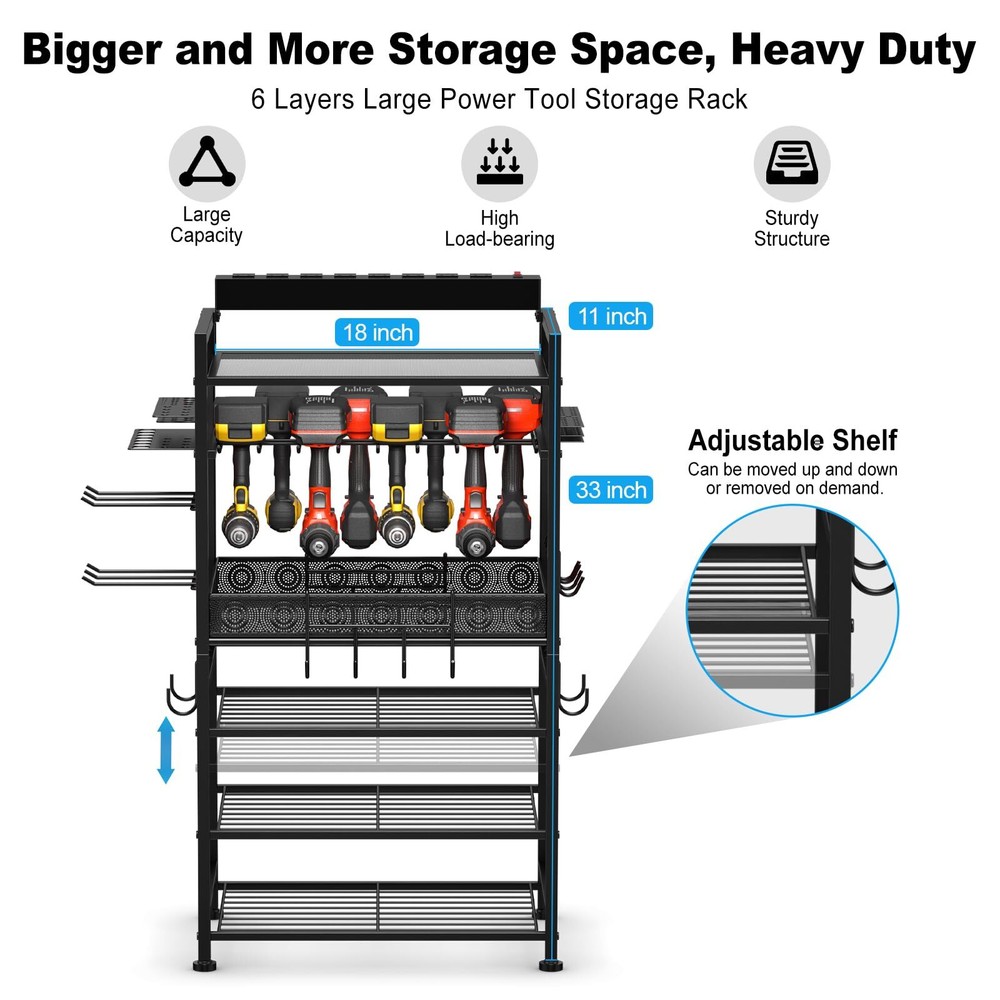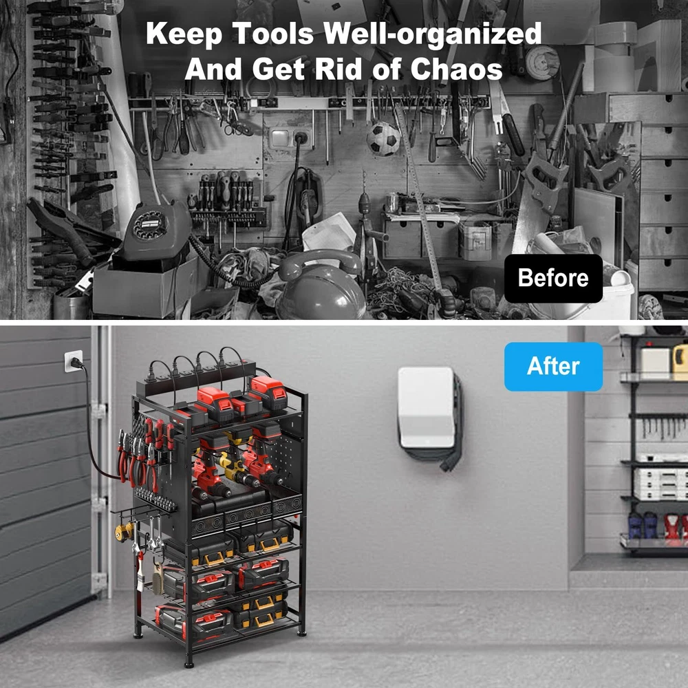 Power Tool Organizer Floor Stand with Charging Station, Garage Adjustable Storage Rack Utility Tool Shelf with 8 Outlet Power Strip, Heavy Duty Drill and Battery Holder, Black Say Goodbye To Chaos: Still annoyed with the messy storage of your tools? power tool organizer with charging station is your saviour! With storage and charging in one, it is dedicated to providing an organized and efficient workspace for you. Consolidate various tools into one place, helping release space and keeping your tools well organized All In One Power Tool Organizer: Our power tool organizer with 8 outlets power strip adopts 6 layer floor stand design, including 4 shelves, 1 storage basket layer, and 1 drills holder layer which can store up to 8 drills or be used as hooks. Sides panel pegboard design with bits organizer and screwdriver rack. Equipped with extra four types of hooks. Accommodate various workshop tools such as batteries, toolboxes, screwdrivers, screwdriver bits, pliers, tape measures, etc 8 AC Outlets Charging Station: Our power tool drill and battery organizer innovatively features 8 AC outlets, Rated Power: 15A 125V 60HZ 1875W, allowing to power up to 8 devices. Comes with a 6 FT extension cord for flexible connection to the distant outlets. The top of the shelf has extra openings, offering two outlet install ways to accommodate various charging angles Larger Storage Space: With the size 33 x 18 x 11 inch , our power tool storage rack is a huge upgrade that increases 2 or 3 times storage space. The second layer at the bottom can be moved or removed on demand. Made of premium quality iron to ensure strong bearing capacity and durability. Ideal for garage, workshop, warehouse, home, shop and so on Easy To Assemble: Equipped with instructions with clearly marked parts and installation steps to ensure the beginner can assemble in a short time. Our garage power tool storage organizer is stylish and practical, making it the ideal festival choice for men, dad or husband Assembled Size: 33*18*11 inch Package Main Accessories: Pegboard*2 Storage Shelves*4 Storage Basket*1 Drills Holder*1 Bits Organizer*1 Screwdriver Rack*1 Basket Hook*2 Hanging Hook*12 Pegboard Long Hook*6 8 AC Outlets Charing Station*1 Applicable Occasions: Ideal for garage, workshop, home, workshop, shed, backyard shop and so on. Large Storage Space for Various Garage Tools: batteries, chargers, toolboxes, screwdrivers, screwdriver Bits, pliers, hammers, tape Measure, brushes or other garage tools. ·With storage and charging in one, provide you with an organized and efficient workspace. Equipped with 8 AC outlets, allowing to power up to 8 devices. ·Provide larger storage space and made of high-quality iron to ensure strong bearing capacity and durability. ·Equipped instructions with clearly marked parts and installation steps. Shipping We offer FREE shipping on all orders! We ship within Three business days of payment, usually sooner. We use a selection of shipping services such as UPS, FedEx, USPS etc. We only ship to the lower 48 states, no APO/FPO addresses or PO Boxes allowed. Local pickups and combined shipping options are not provided at this time. Return You can return a product for up to 30 days from the date you purchased it. Any product you return must be in the same condition you received it and in the original packaging. Please keep the receipt. Payment We accept payment by any of the following methods: PayPal Please pay as soon as possible after winning an auction, as that will allow us to post your item to you sooner! Feedback Customer satisfaction is very important to us. If you have any problem with your order, please contact us and we will do our best to make you satisfied. Contact Us If you have any queries, please contact us via ebay. We usually respond within 24 hours on weekdays. Please visit our eBay store to check out other items for sale! Thank you for shopping at our store.