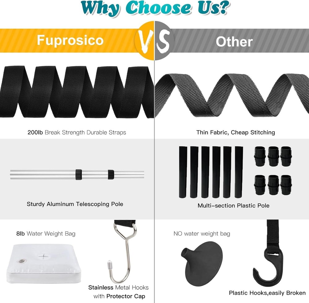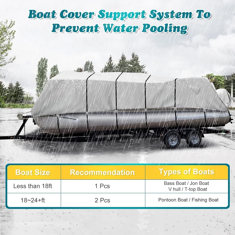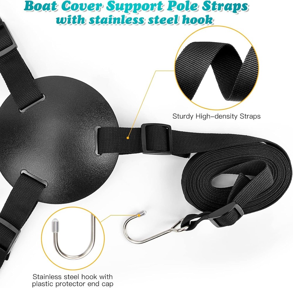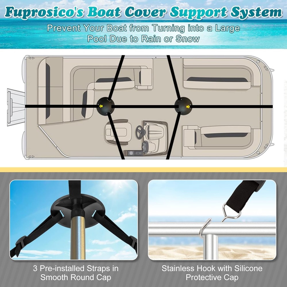 Prevent Water Pooling: The three straps and extra connection strap between the two support poles further improves the stability of the entire support system and supports the typical water build-up zone, so your boat won't turn into a large pool because of rain or snow weather. Adjustable and Water Bag Design: The pontoon boat cover support poles can be adjusted between 22.6"-58" to fit the boat. Enhanced locking mode also can keep the length to support sufficient support. The water bag will provide strong stability, effectively preventing the pole from tipping over. Straps & Stainless Steel Hooks: This pontoon boat cover support system come with strong and durable adjustable straps and high quality 201 stainless steel hook. It can easily hooked on the handrail or boat hook to ensure the stability. Great Boat Cover Accessory :The boat cover pole can support the boat cover's sagging and collapsing place and can protect your boat very well. And there also are silicone rubber cover at end of the hooks to prevent scratch.Fasteners prevent it from shortening. It is the great accessory for boat cover. Complete Heavy Duty Support Poles: Fuprosico boat cover support poles is made of heavy duty material which is durable and not easy to break.One set including 2 boat cover support poles, 1 long connecting strap for two poles, and 2*3 straps for two pole tops.