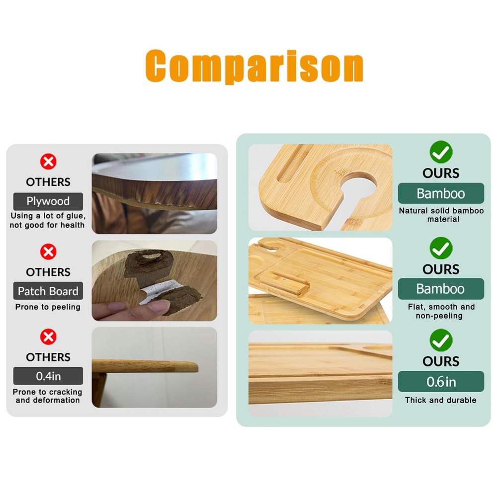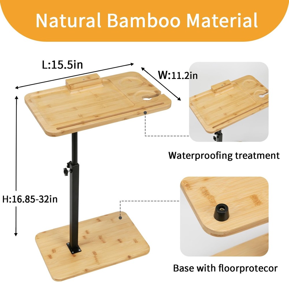Bamboo Couch Table,Adjustable C Shaped Side Table with Phone Stand,360°Swivel TV Trays for Eating on Couch, Bedroom or Livingroom,Small Spaces,Oblong. Natural Bamboo:Couch table is made of natural bamboo and steel pipe, Bottom has four protective pads,Coated with waterproof paint, Does not corrode in water, Is easy to clean and maintain. Space-Saving:C Shaped Table can slide under a recliner,bed,sofa,chair or bathtub for small Spaces. TV tray table has five storage Spaces, Perfect for phones, tablets, snacks, wine cup, coffee and more. Height Adjustable:Adjustable Side table height is from 18 "to 33". The panel can be rotated 360 degrees.When you are on the sofa or in bed, According to your own preferences, Customize the Angle and height. 360° Swivel Panel with Phone Stand:TV trays for eating on couch,Phone stand allowing you to find the perfect viewing angle without moving, Sofa armrest table can be used as a laptop table. Easy to Install:Swivel tv tray is easy to install, Including installation instructions and installation kit (generally completed in 5 minutes). Perfect for housewarming, a new house, a birthday or Christmas present!